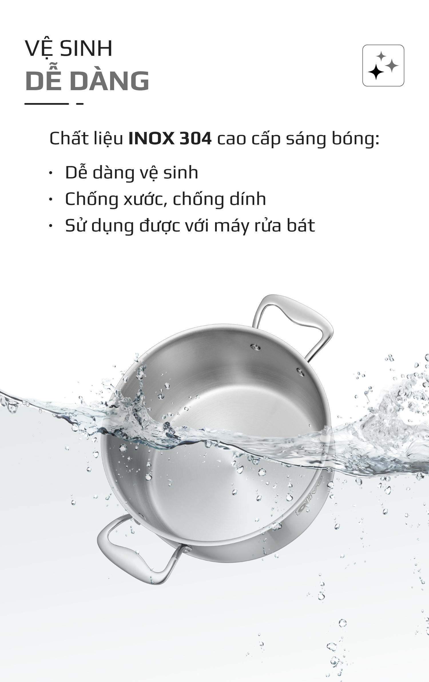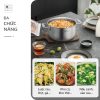 • Không thấm nước, hạn chế ngấm dầu mỡ hay cặn bẩn vào lớp đáy nhờ kết cấu liền khối kín hoàn toàn, không tạo khe hở giữa các lớp kim loại. Nhờ vậy, nồi luôn giữ được độ sáng bóng, không bị ố màu hay gỉ sét.