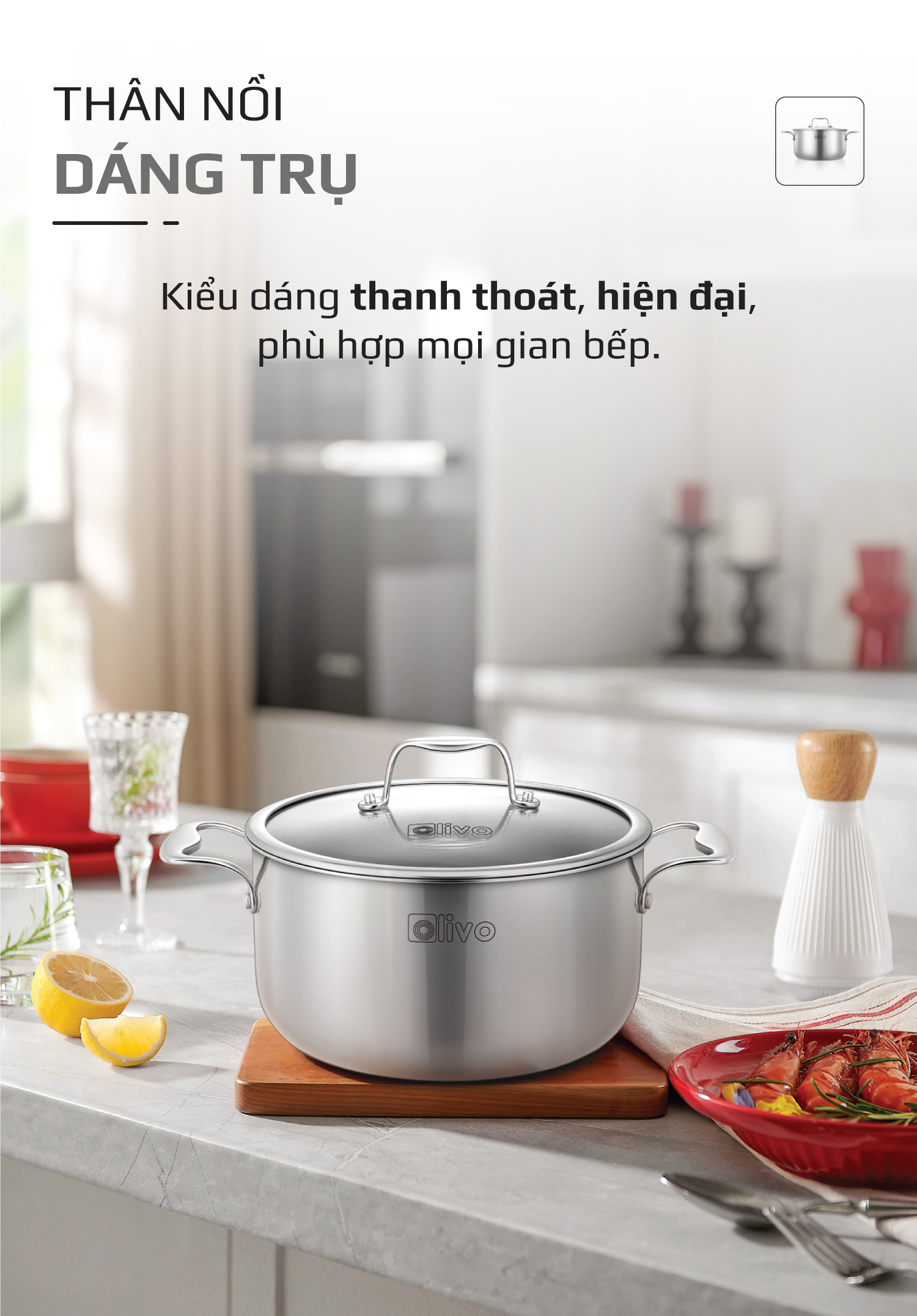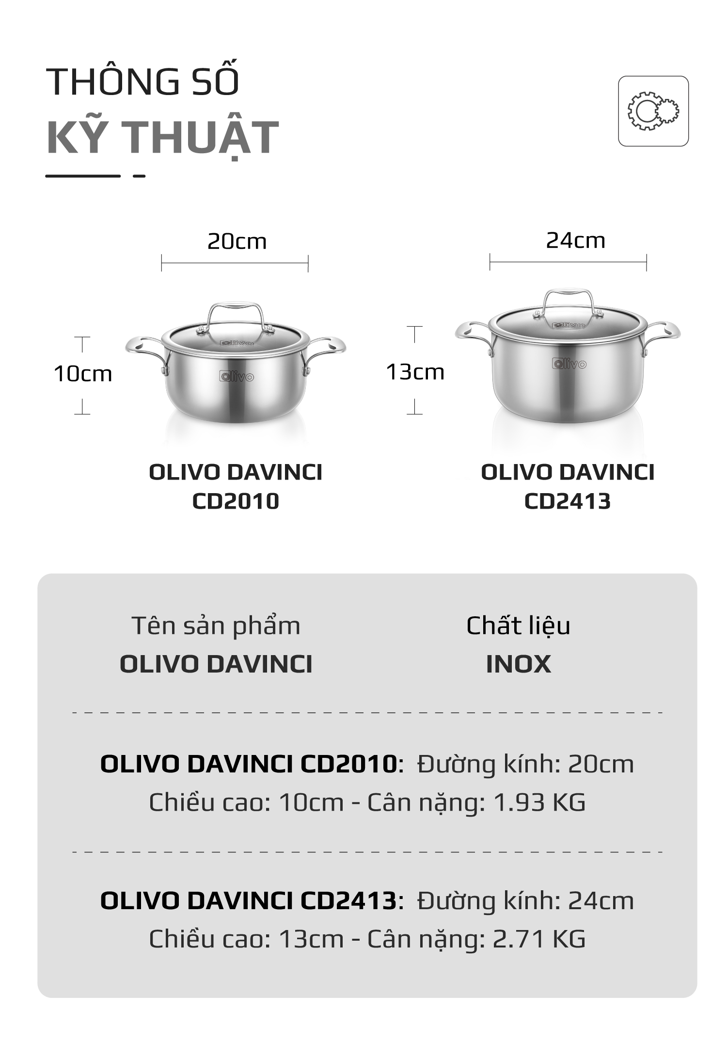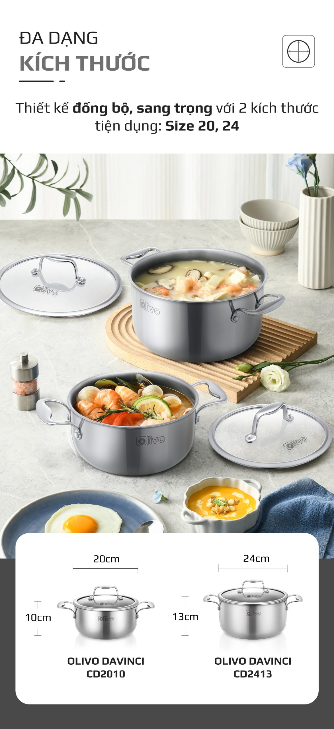 • Từ chất liệu inox 304 nguyên khối cao cấp, thiết kế dáng trụ tinh tế đến khả năng dẫn nhiệt nhanh, giữ nhiệt lâu – bộ nồi inox OLIVO Davinci là lựa chọn hoàn hảo cho căn bếp hiện đại. Vừa mang vẻ đẹp sang trọng, chuẩn phong cách châu Âu, vừa linh hoạt với hai kích thước 20cm và 24cm, Davinci giúp bạn nấu vạn món ngon mỗi ngày, nâng tầm trải nghiệm nấu nướng và chăm sóc gia đình.