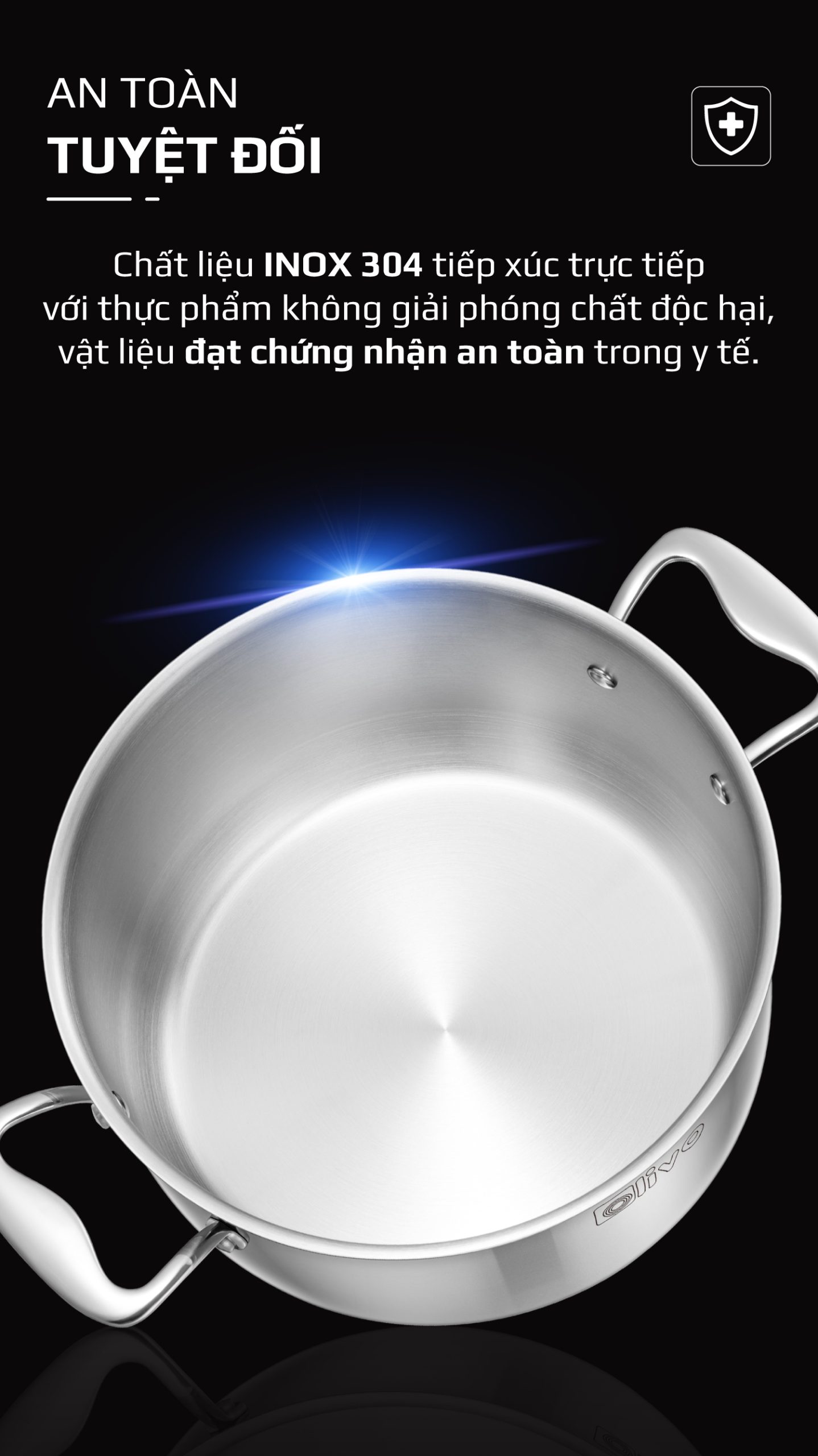 • Phần inox tiếp xúc trực tiếp với thực phẩm được làm từ inox 304 cao cấp, chất liệu đạt chứng nhận an toàn y tế, thường được sử dụng trong dụng cụ y khoa và thiết bị chế biến thực phẩm, đảm bảo không thôi nhiễm kim loại khi đun nấu ở nhiệt độ cao.