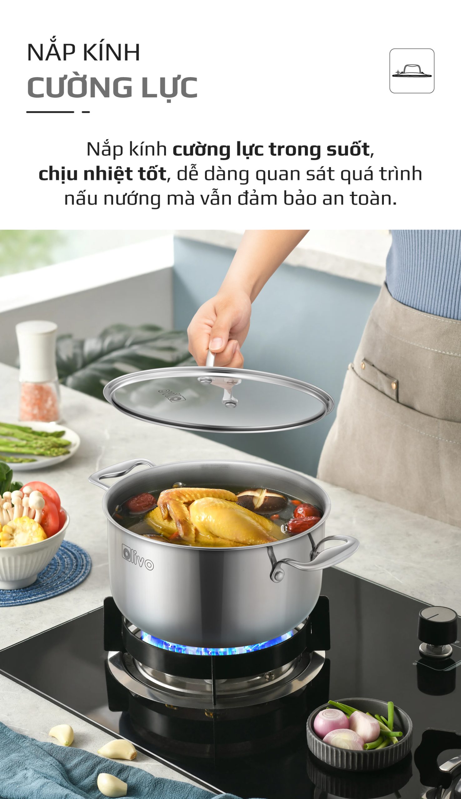 • Nắp kính cường lực trong suốt, viền inox chắc chắn giúp bạn dễ dàng quan sát món ăn mà không cần mở nắp, hạn chế thất thoát nhiệt và giữ trọn hương vị.
