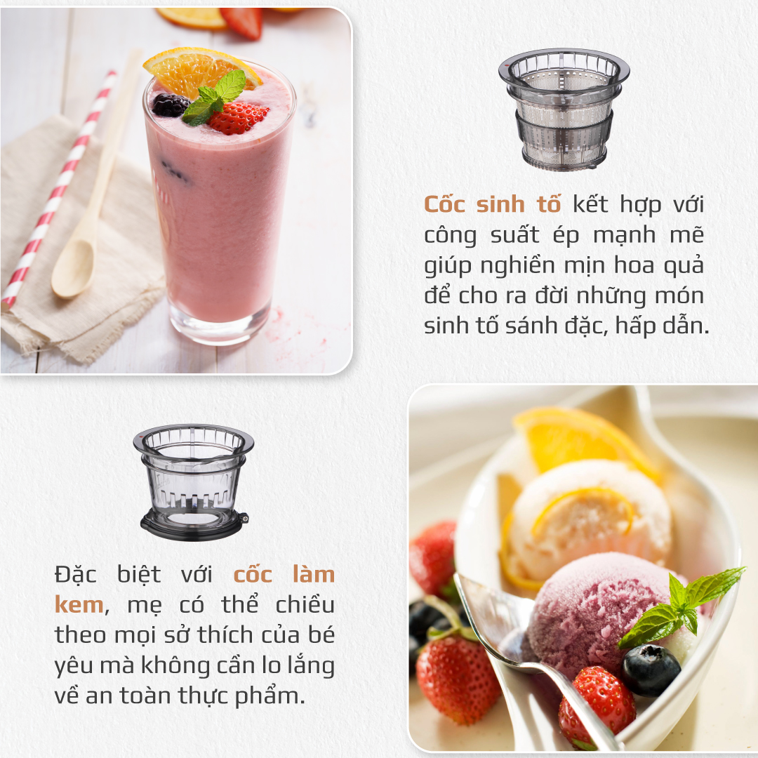 Điều gây ấn tượng mạnh mẽ tới người tiêu dùng Việt Nam đó là ngoài công dụng làm nước ép, máy ép chậm Olivo SJ200 còn làm được kem, sinh tố. Thay vì bạn phải mua máy xay sinh tố, máy làm kem, máy ép chậm thì giờ đây bạn chỉ cần bỏ tiền và mua một sản phẩm duy nhất là máy ép chậm Olivo SJ200. Quá hời cho các chị em nội trợ.