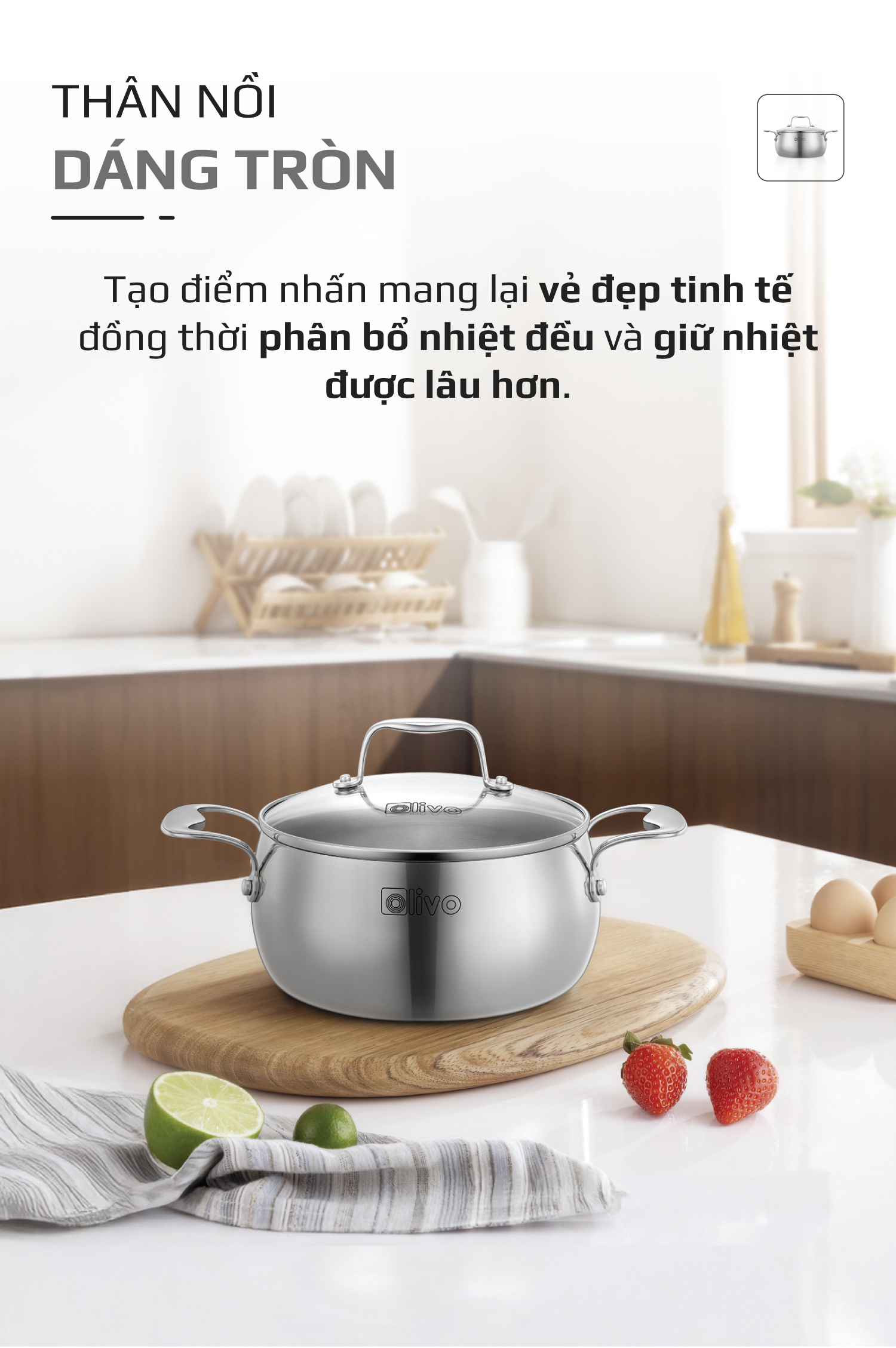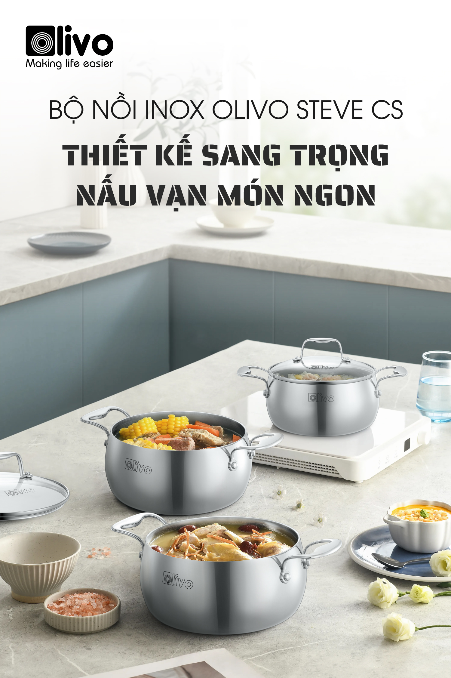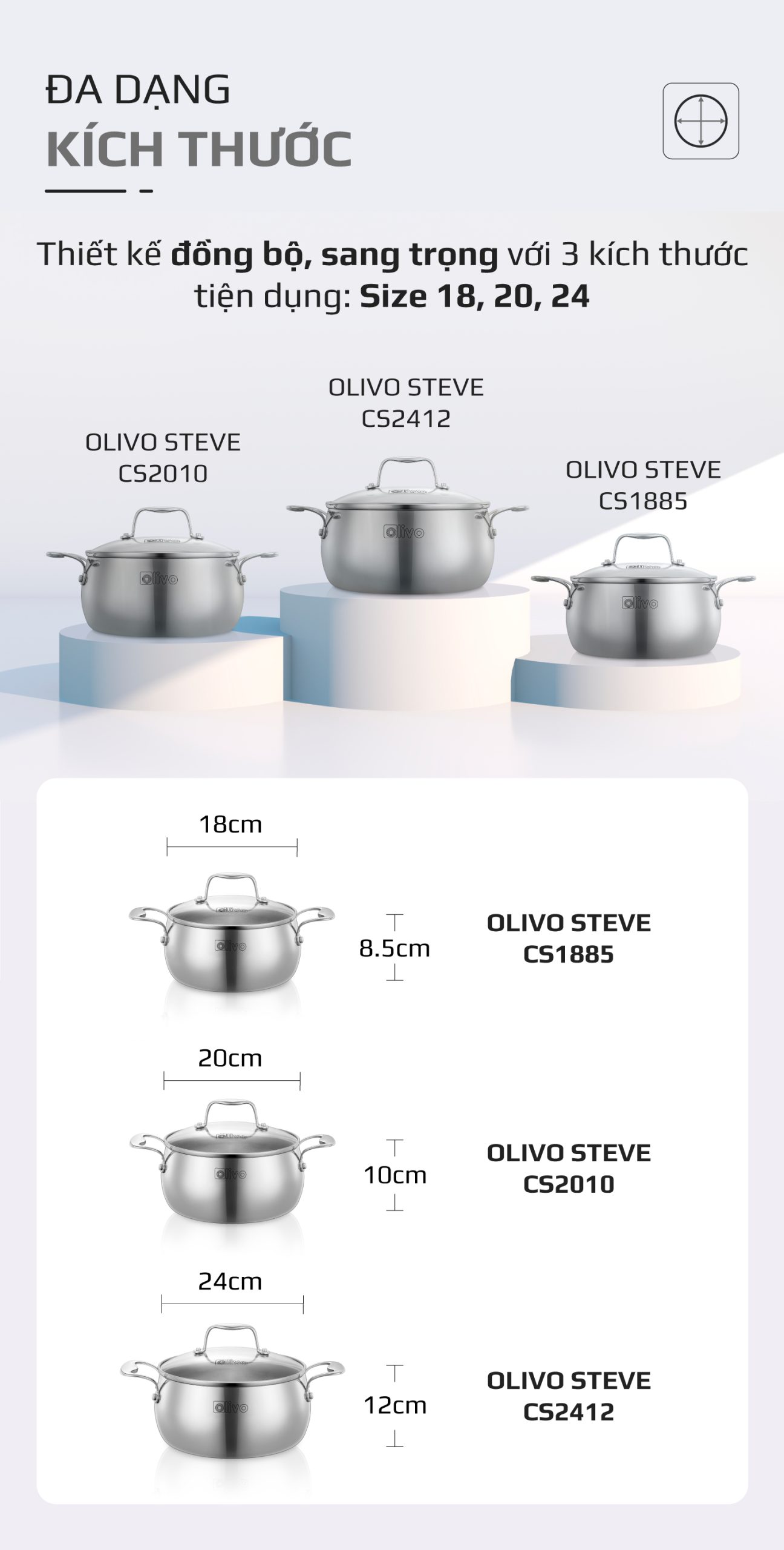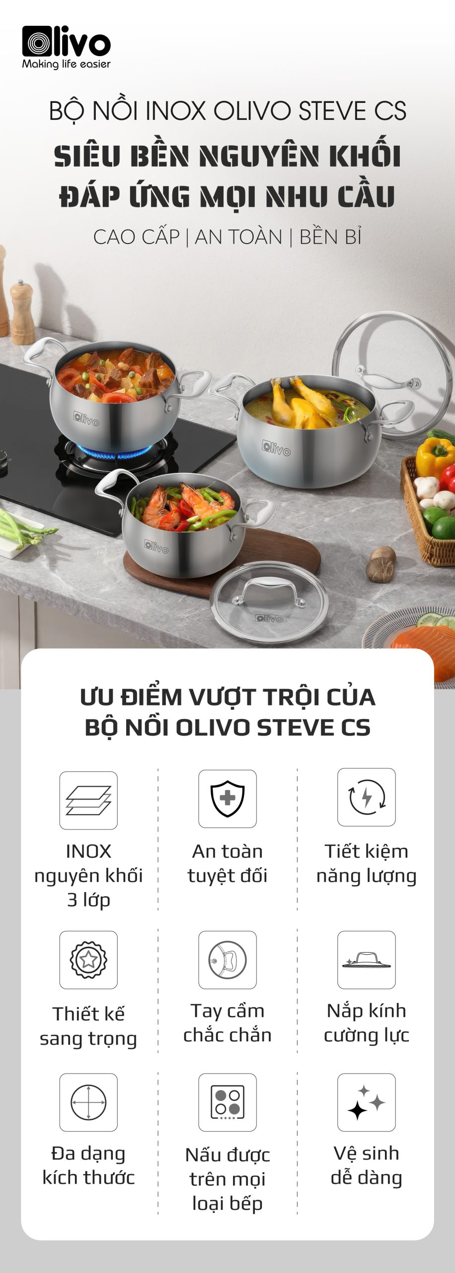 • Từ chất liệu inox nguyên khối cao cấp, thiết kế dáng tròn tinh tế, đến tính năng tản nhiệt đều, đa dạng kích thước – bộ nồi inox OLIVO Steve CS không chỉ là dụng cụ nấu ăn, mà còn là biểu tượng của phong cách sống hiện đại, nâng tầm trải nghiệm nấu nướng và chăm sóc sức khỏe cho gia đình Việt.