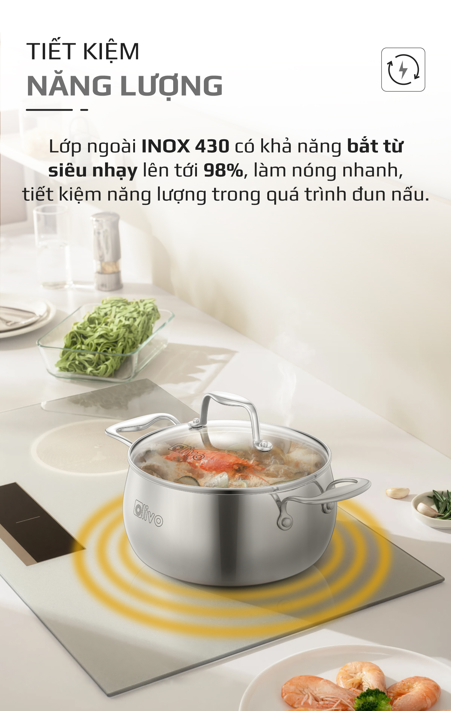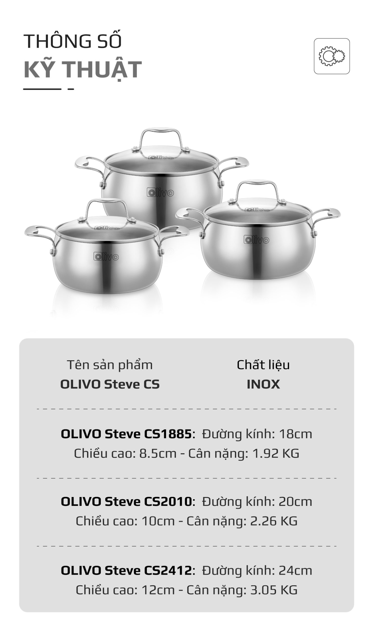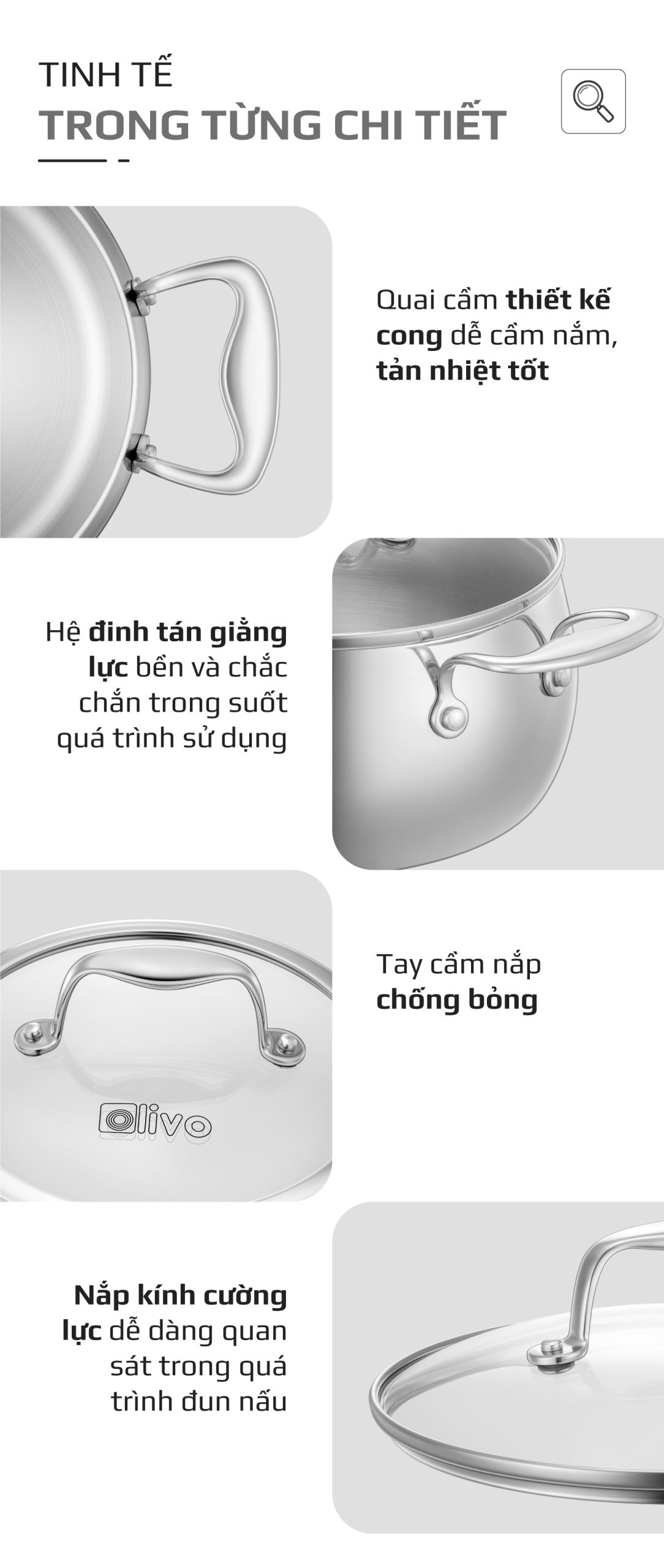 • Từ chất liệu inox nguyên khối cao cấp, thiết kế dáng tròn tinh tế, đến tính năng tản nhiệt đều, đa dạng kích thước – bộ nồi inox OLIVO Steve CS không chỉ là dụng cụ nấu ăn, mà còn là biểu tượng của phong cách sống hiện đại, nâng tầm trải nghiệm nấu nướng và chăm sóc sức khỏe cho gia đình Việt.