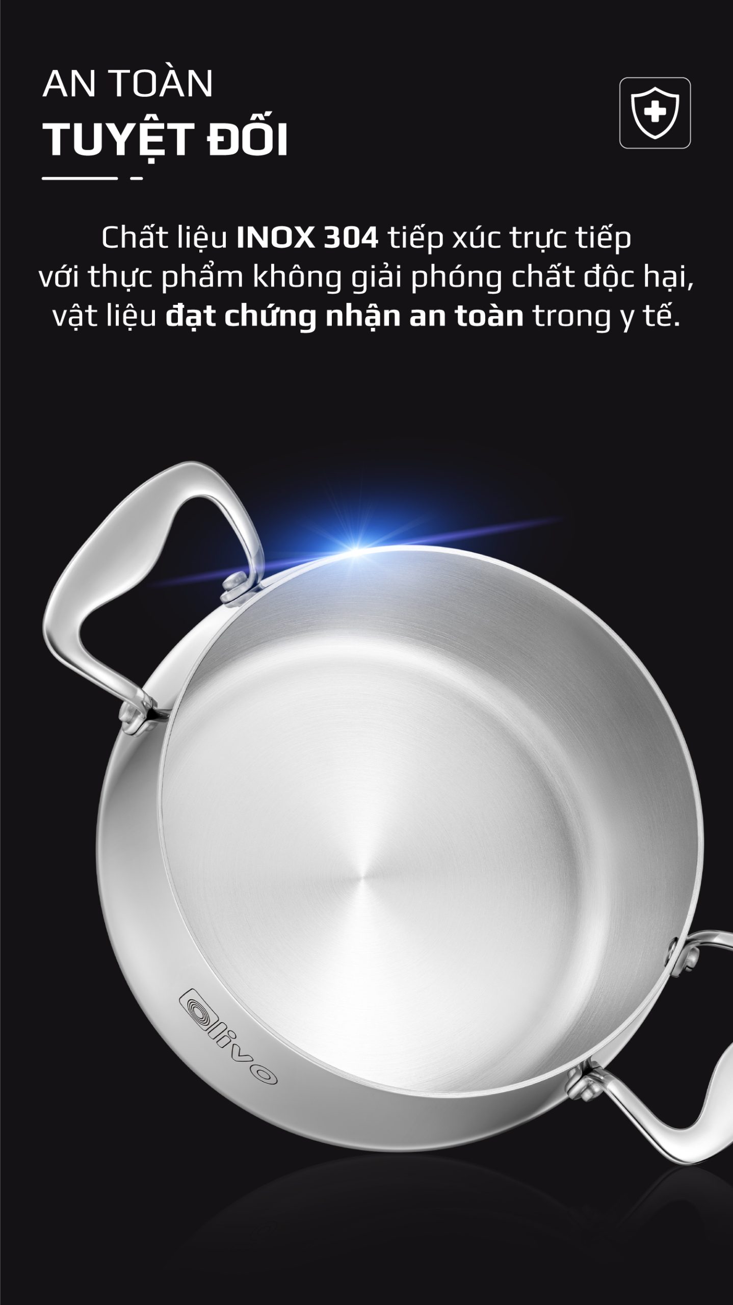 • Phần inox tiếp xúc trực tiếp với thực phẩm được làm từ inox 304 cao cấp, chất liệu đạt chứng nhận an toàn y tế, thường được sử dụng trong dụng cụ y khoa và thiết bị chế biến thực phẩm, đảm bảo không thôi nhiễm kim loại khi đun nấu ở nhiệt độ cao.