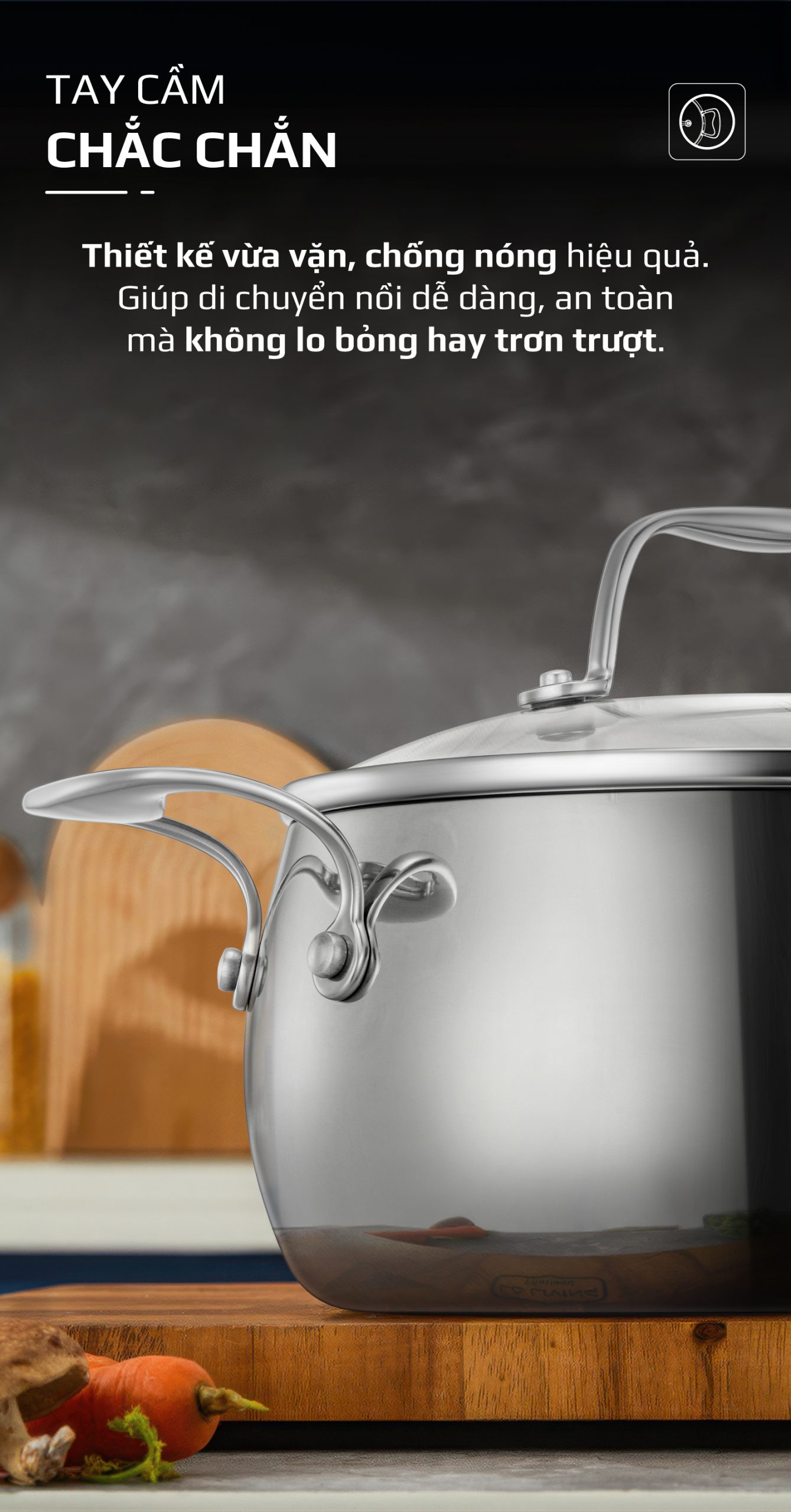 • Tay cầm bằng inox tán đinh chắc chắn, cách nhiệt tốt, giúp di chuyển nồi an toàn và thoải mái trong quá trình nấu nướng.