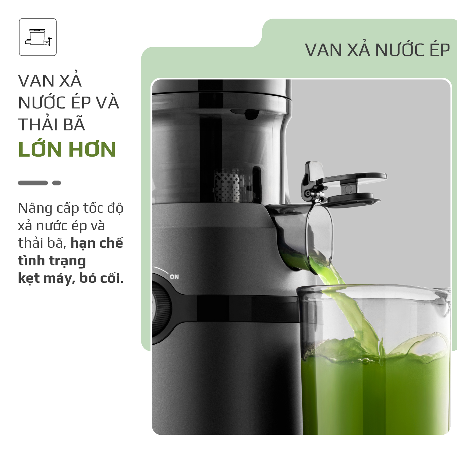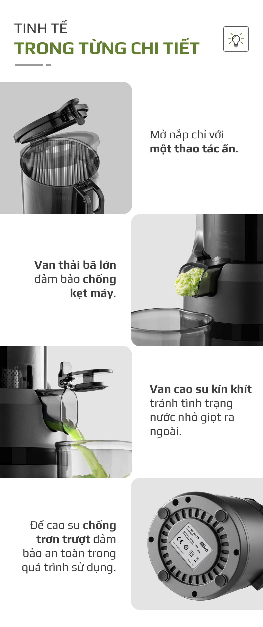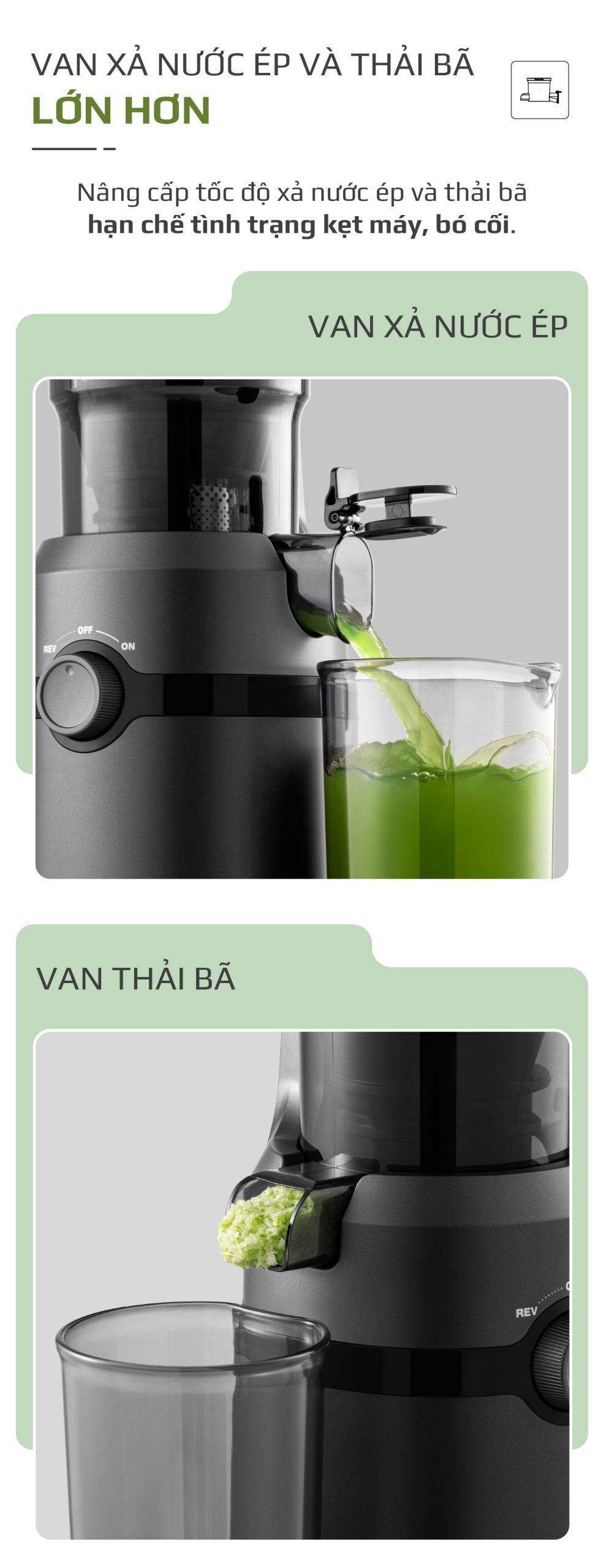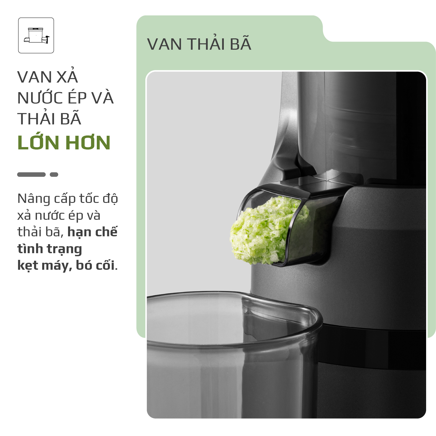 • Lượng bã sau khi ép khô ráo giúp hạn chế tình trạng kẹt máy, bó cối, dễ dàng sử dụng và vệ sinh máy.
