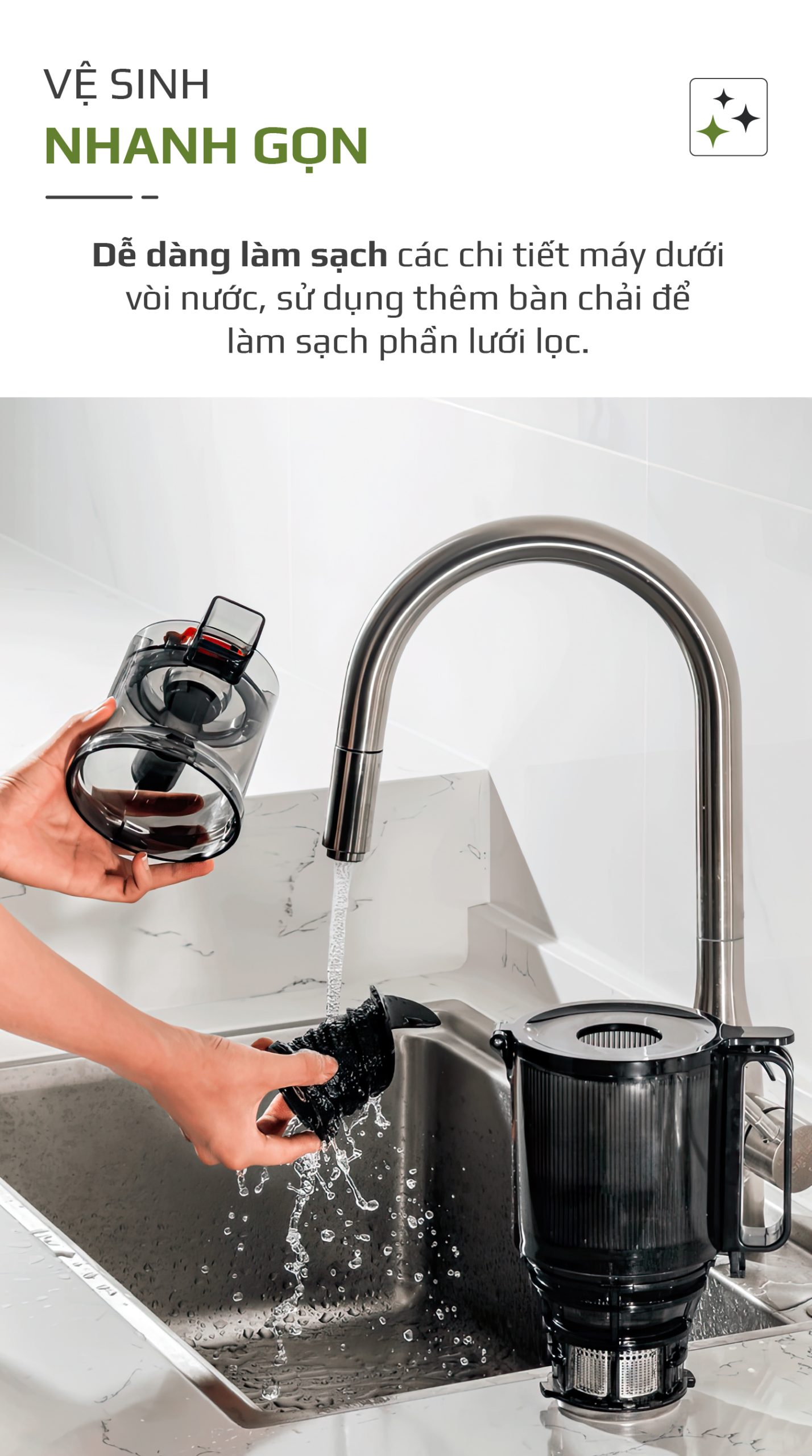 • Dễ dàng làm sạch các chi tiết với nước sạch, sử dụng thêm bàn chải tặng kèm máy để vệ sinh phần lưới lọc hiệu quả hơn.