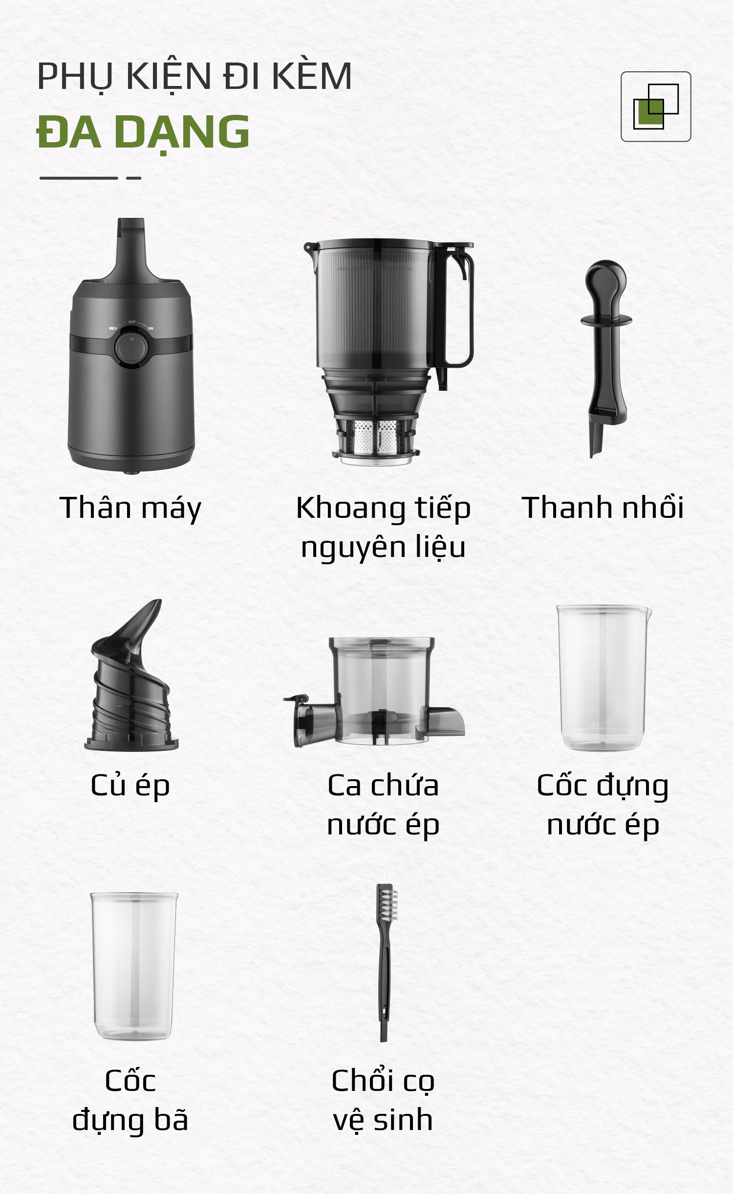 • Công nghệ ép tốc độ chậm không sinh nhiệt giúp thành phẩm nước ép giữ nguyên được chất dinh dưỡng, vitamin, enzyme… tự nhiên có trong rau củ quả. Nước ép đậm vị, không bị oxy hóa, phân tầng tách nước.