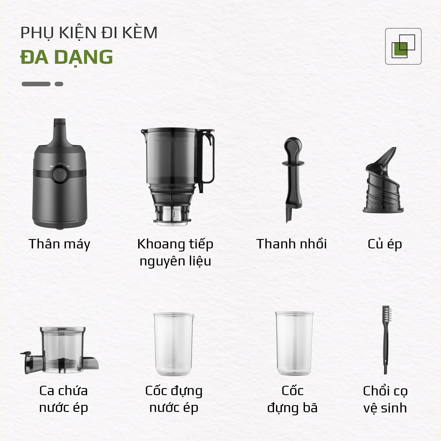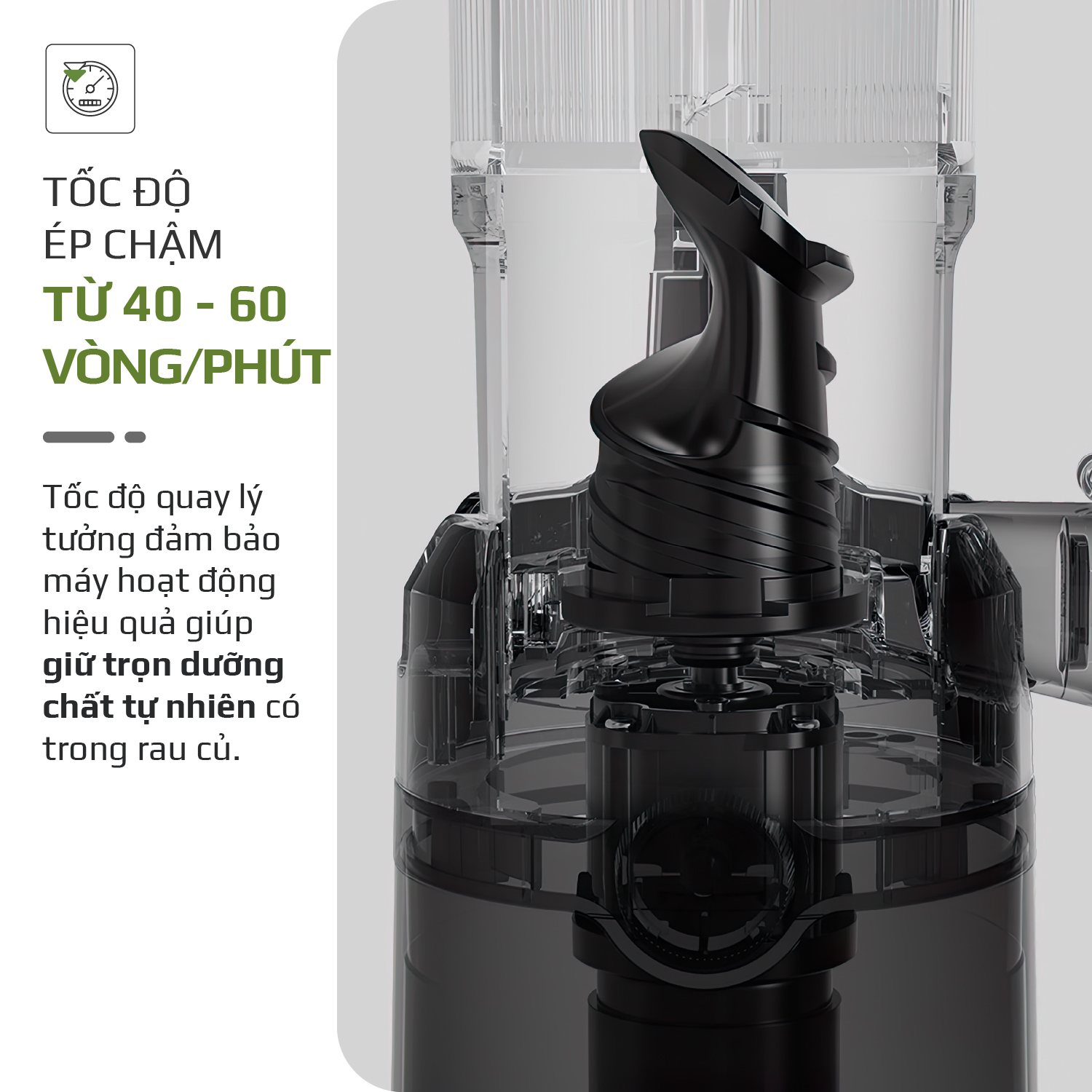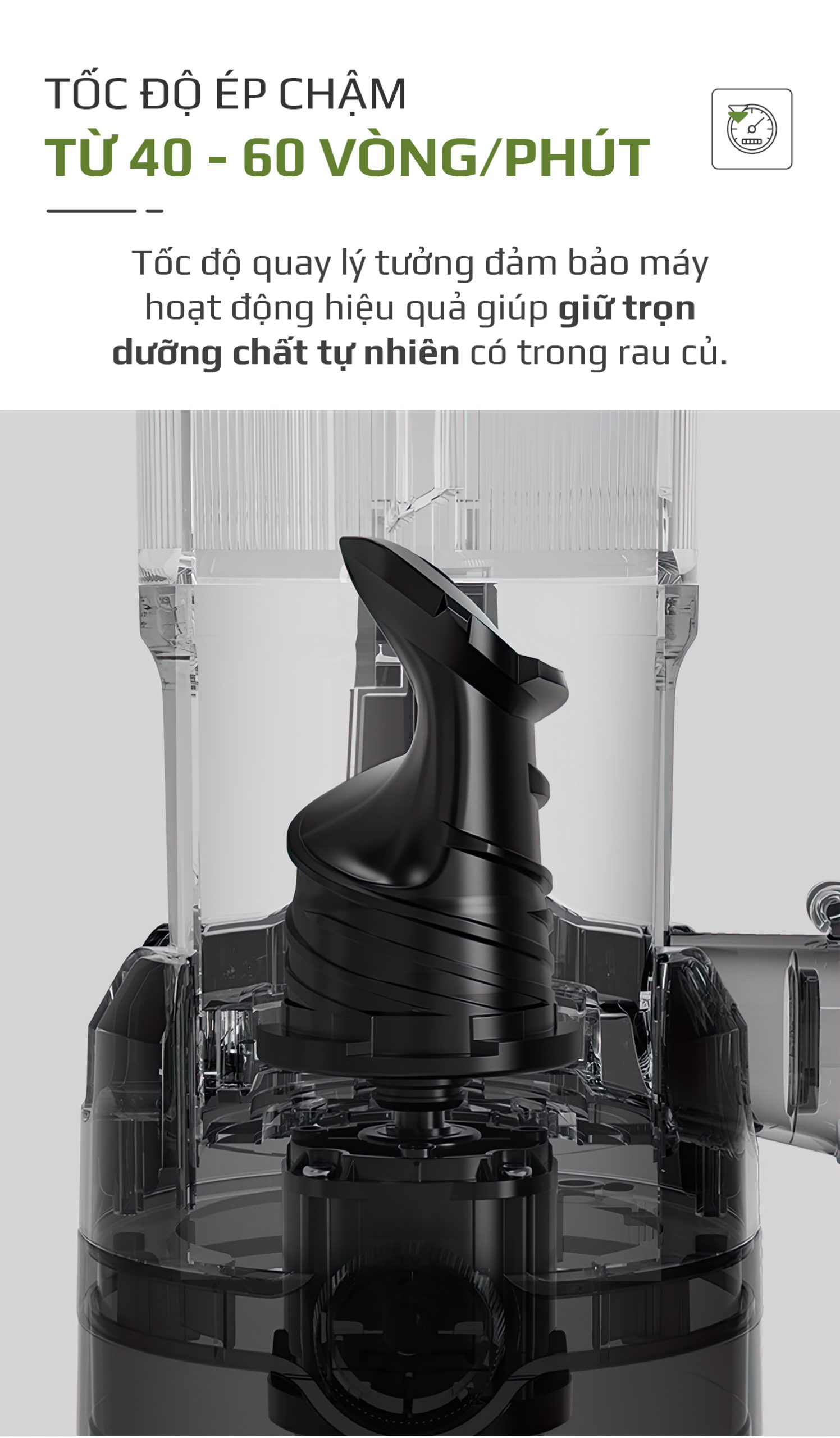 • Nhờ động cơ mạnh mẽ, máy ép có thể nghiền nát nguyên liệu một cách hiệu quả, giúp ép kiệt bã hơn so với các loại máy có công suất thấp. Nhờ vậy, bạn sẽ thu được nhiều nước ép hơn, đồng thời giữ lại được tối đa dưỡng chất từ trái cây và rau củ.