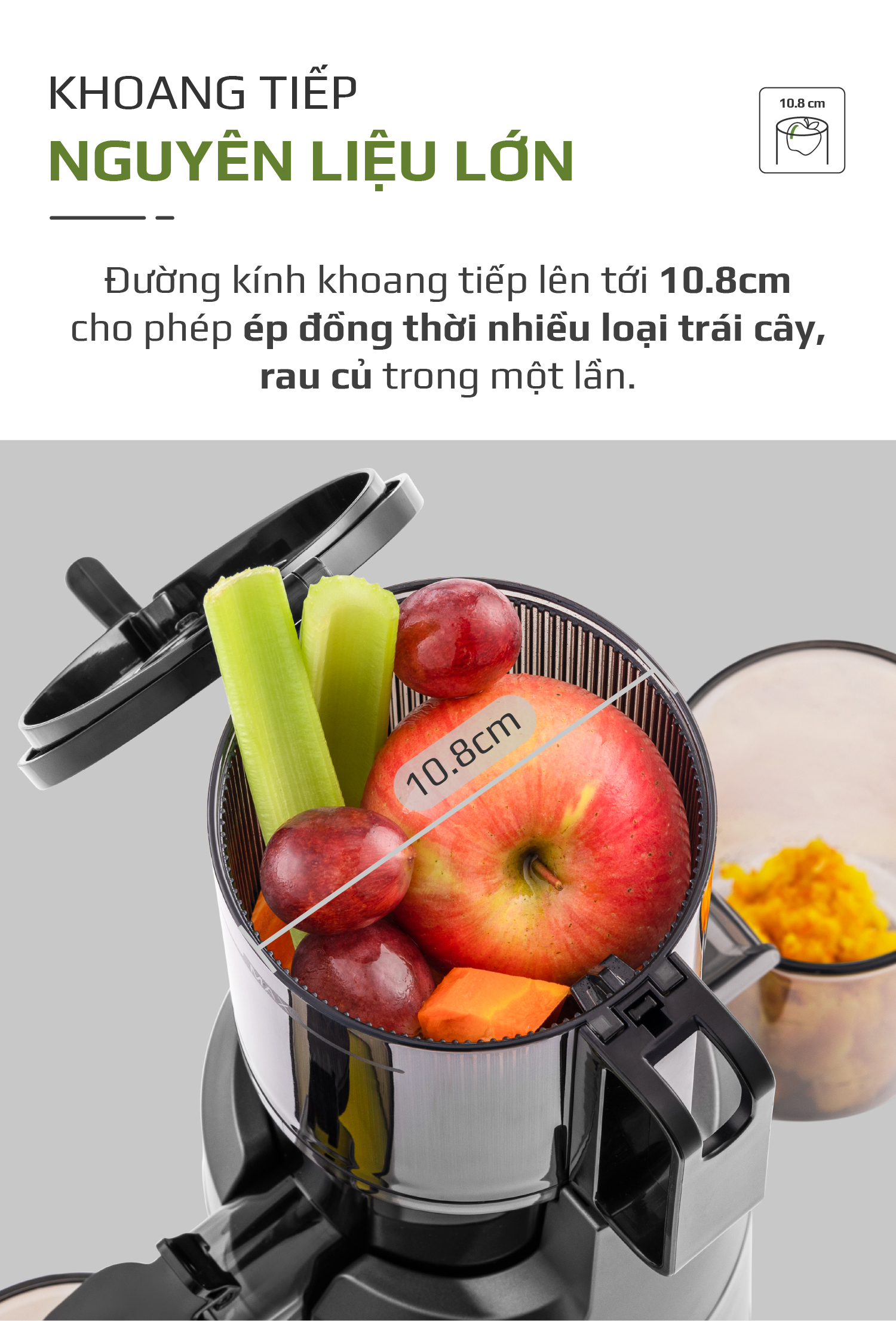• Khoang tiếp nguyên liệu lớn: Ép đa dạng rau củ, trái cây với kích thước lớn.