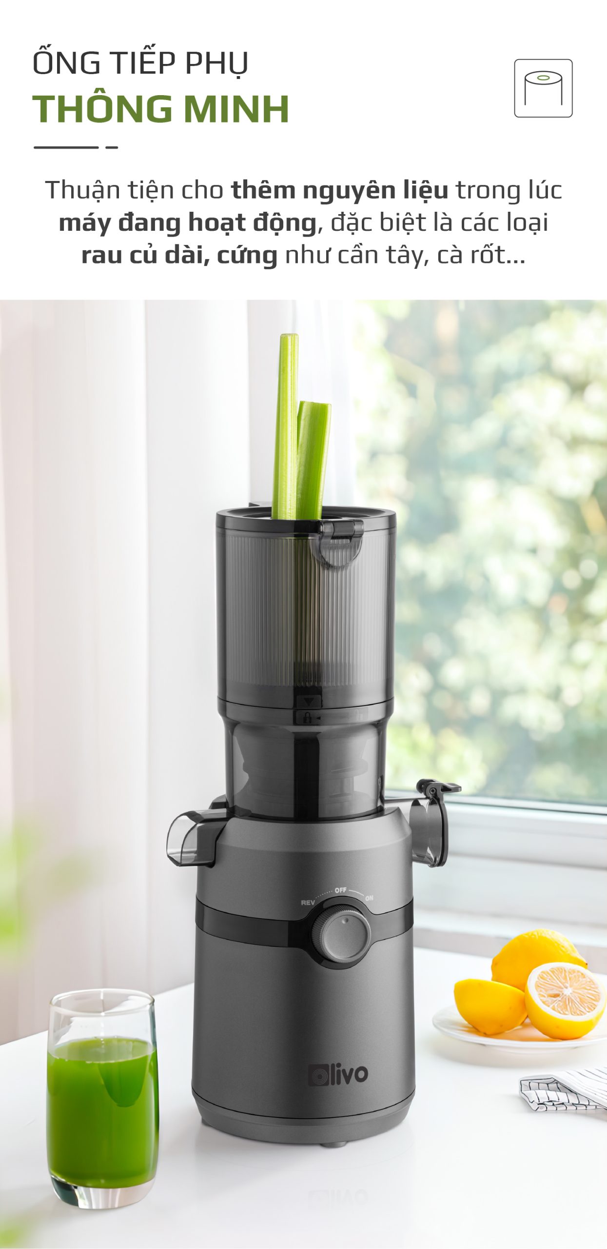 • Ống tiếp nguyên liệu dài: Dễ dàng ép rau nguyên cành như cần tây, cà rốt.