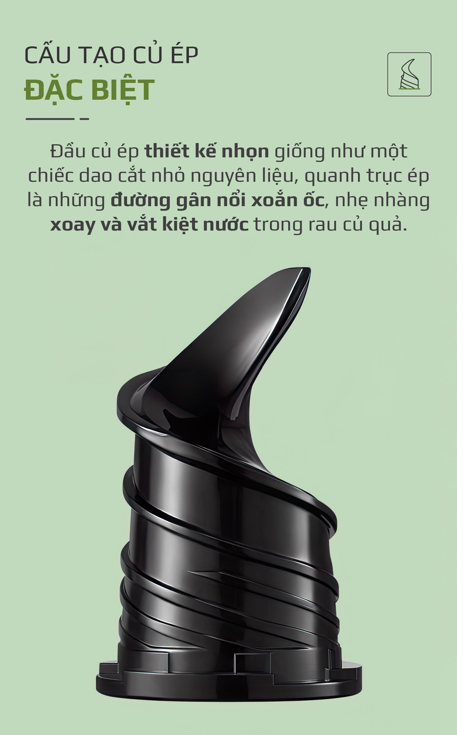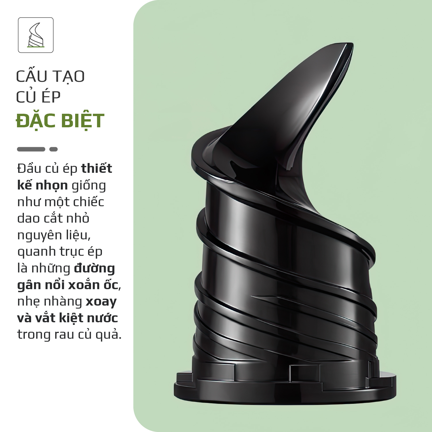 • Củ ép được đúc nguyên khối từ vật liệu cao cấp siêu bền, chống mài mòn. Kết hợp với thiết kế xoắn ốc và đường gân nổi bao quanh trục giúp tiếp xúc với nguyên liệu tốt hơn và vắt kiệt nước trong rau củ quả.