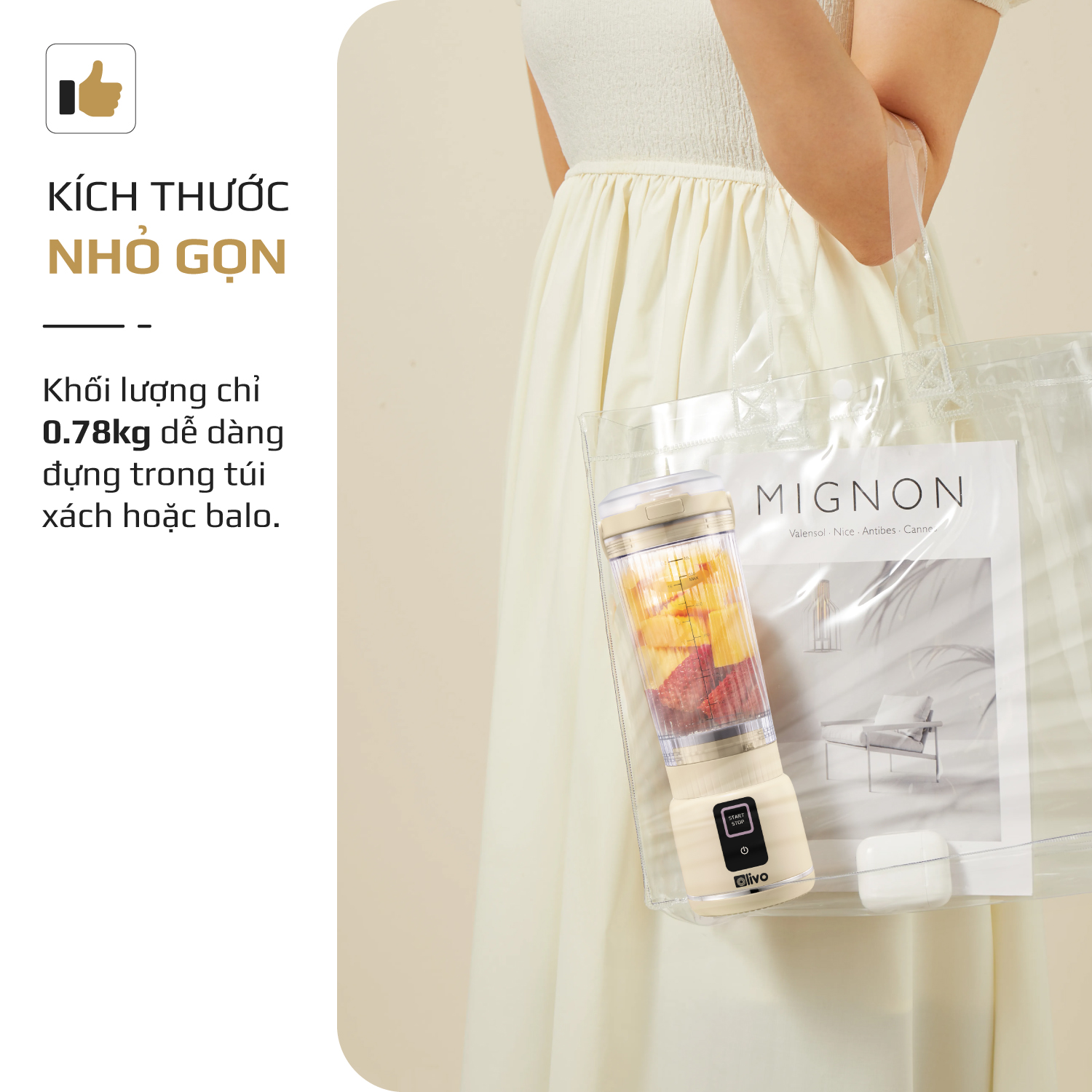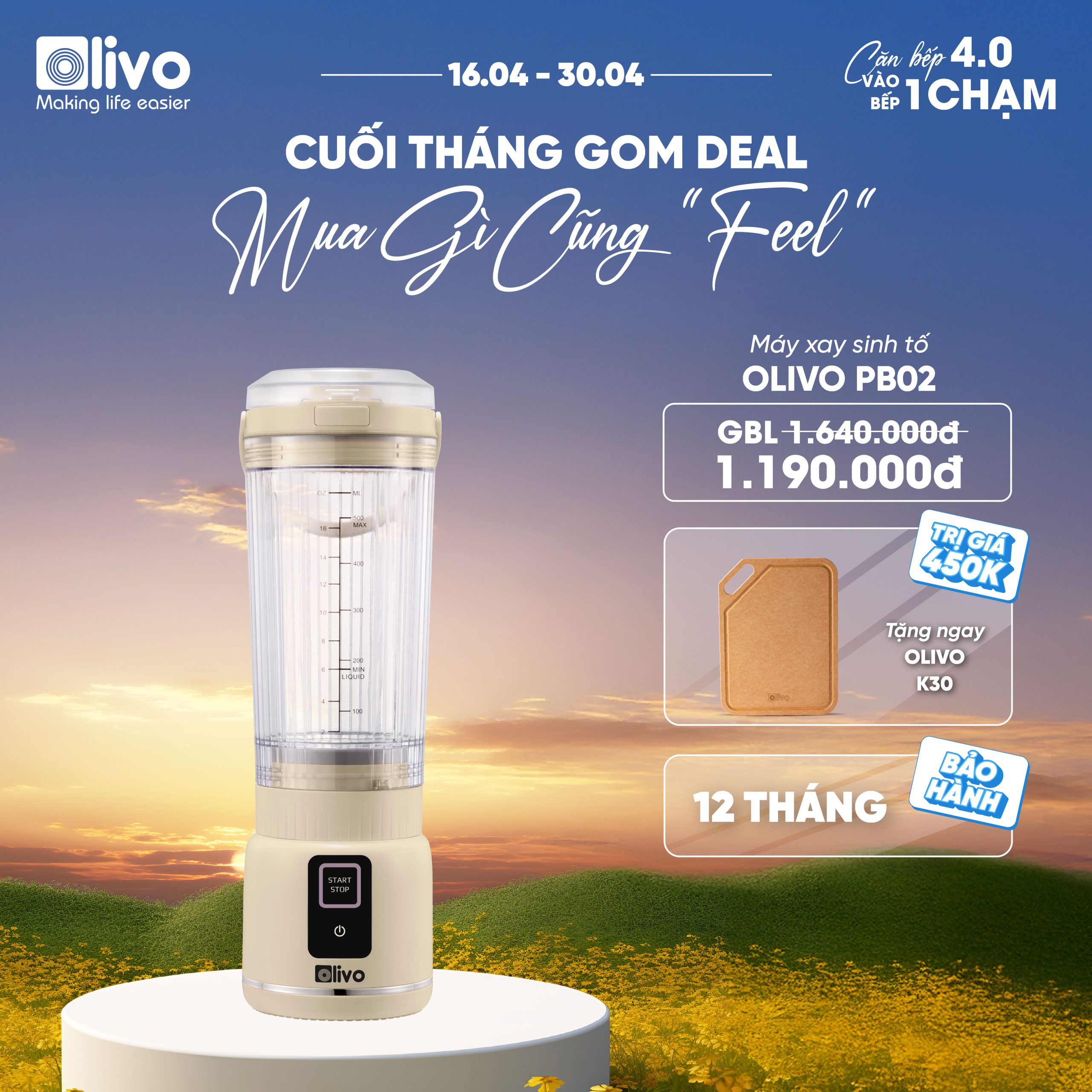 - Với máy xay sinh tố cầm tay OLIVO PB02, bạn có thể thưởng thức đồ uống ngay sau khi xay mà không cần rót ra ly. Chỉ cần thay nắp đế tiện lợi, bạn đã có ngay một chiếc ly cầm tay nhỏ gọn.
