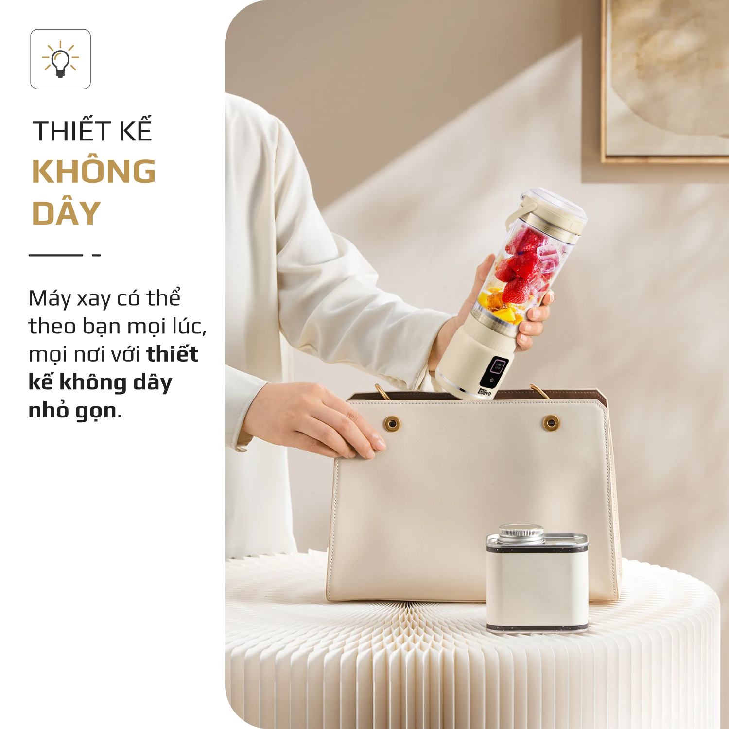 - Chức năng chính của OLIVO PB02 là xay sinh tố, smoothie, đồ uống dinh dưỡng… giúp bạn bổ sung vitamin và khoáng chất mỗi ngày, hỗ trợ tăng sức đề kháng, giữ dáng và làm đẹp da. Với thiết kế nhỏ gọn, không dây, OLIVO PB02 cho phép bạn xay và thưởng thức ngay tại văn phòng, phòng tập, trên xe hơi hay trong những chuyến du lịch, tiện lợi mọi lúc, mọi nơi.
