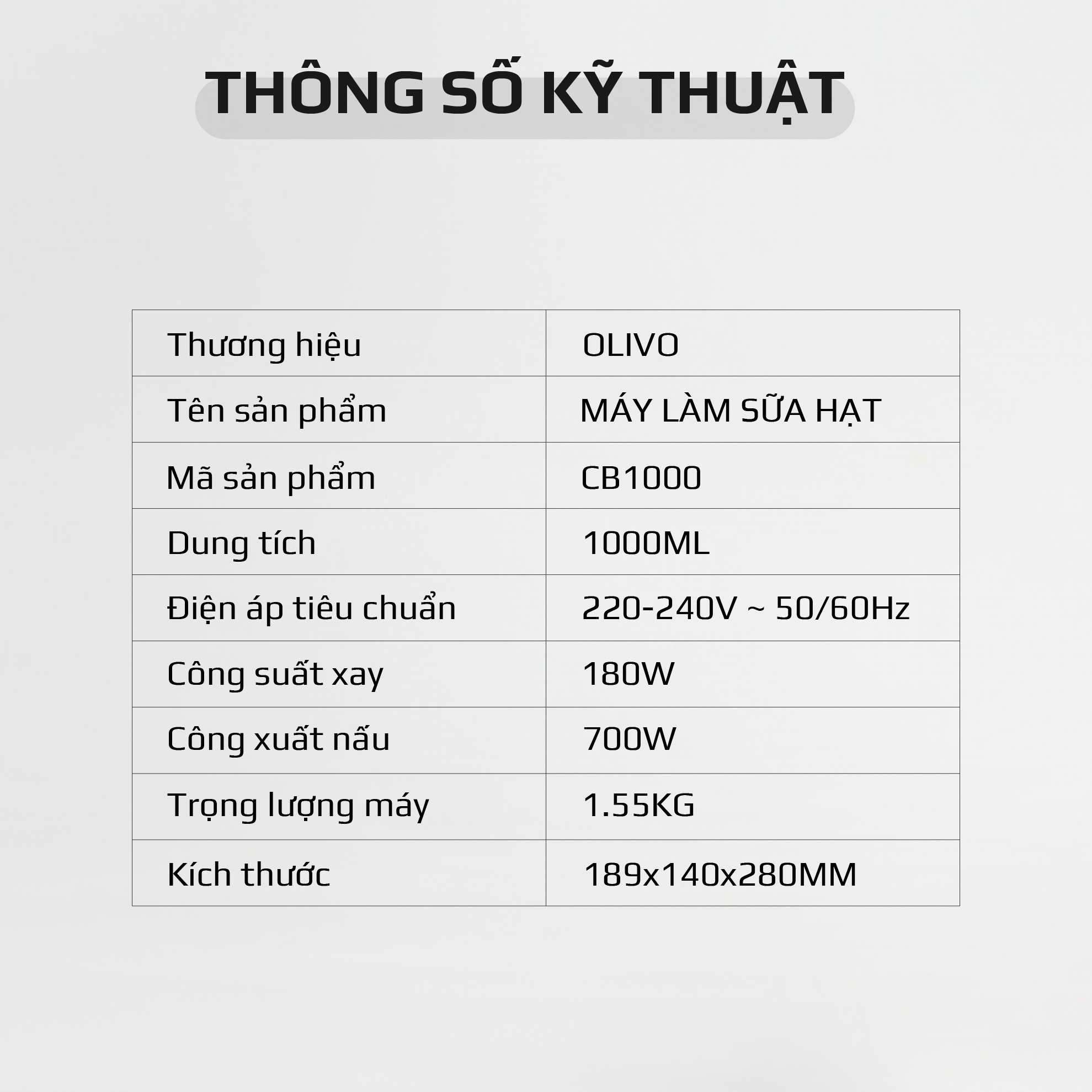 - Không quá lớn như những dòng máy xay nấu lớn, cũng không quá nhỏ như dòng xay nấu mini. OLIVO CB1000 có dung tích 1000ML vừa đủ dùng cho 3 – 5 người, tiện lợi sử dụng hàng ngày.