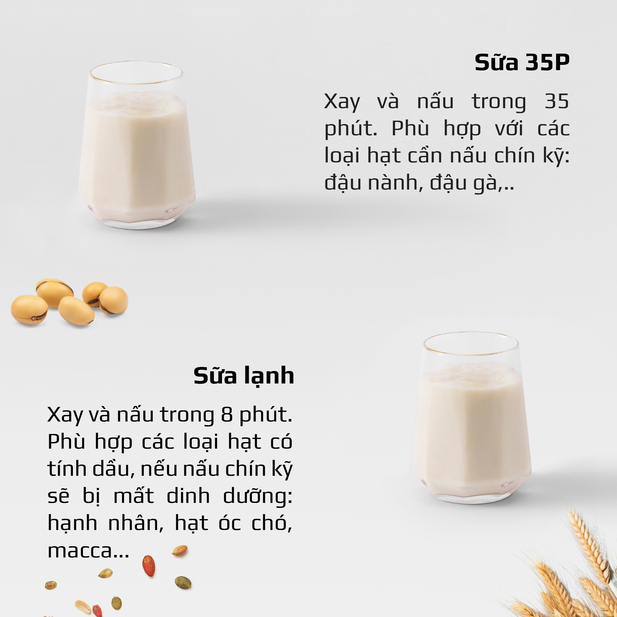 - Sữa Hạt 35 phút: Thích hợp để nấu các loại hạt họ đậu như đậu xanh, đậu tương… các loại hạt này nếu không được nấu chín kỹ sẽ rất dễ bị ngái, hăng.