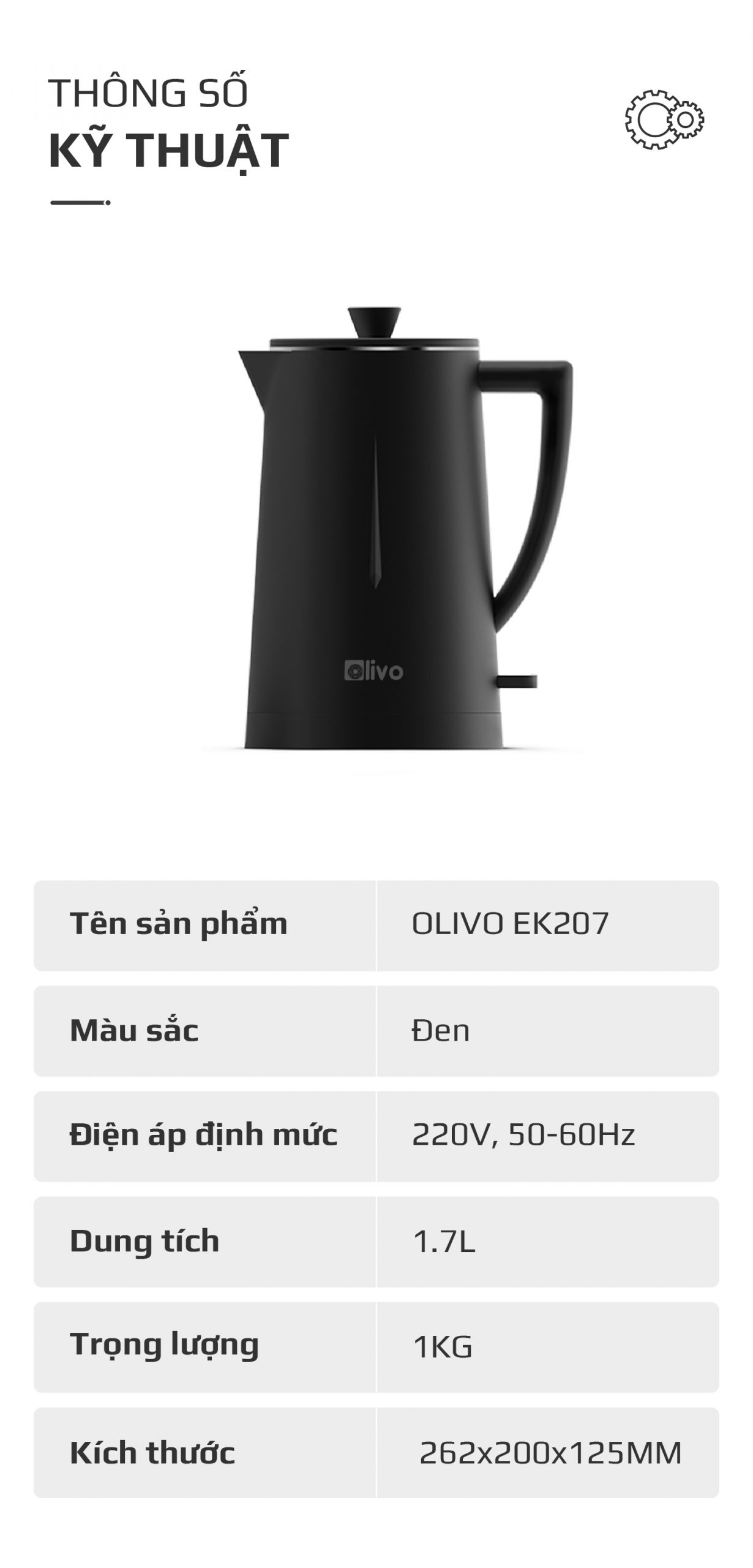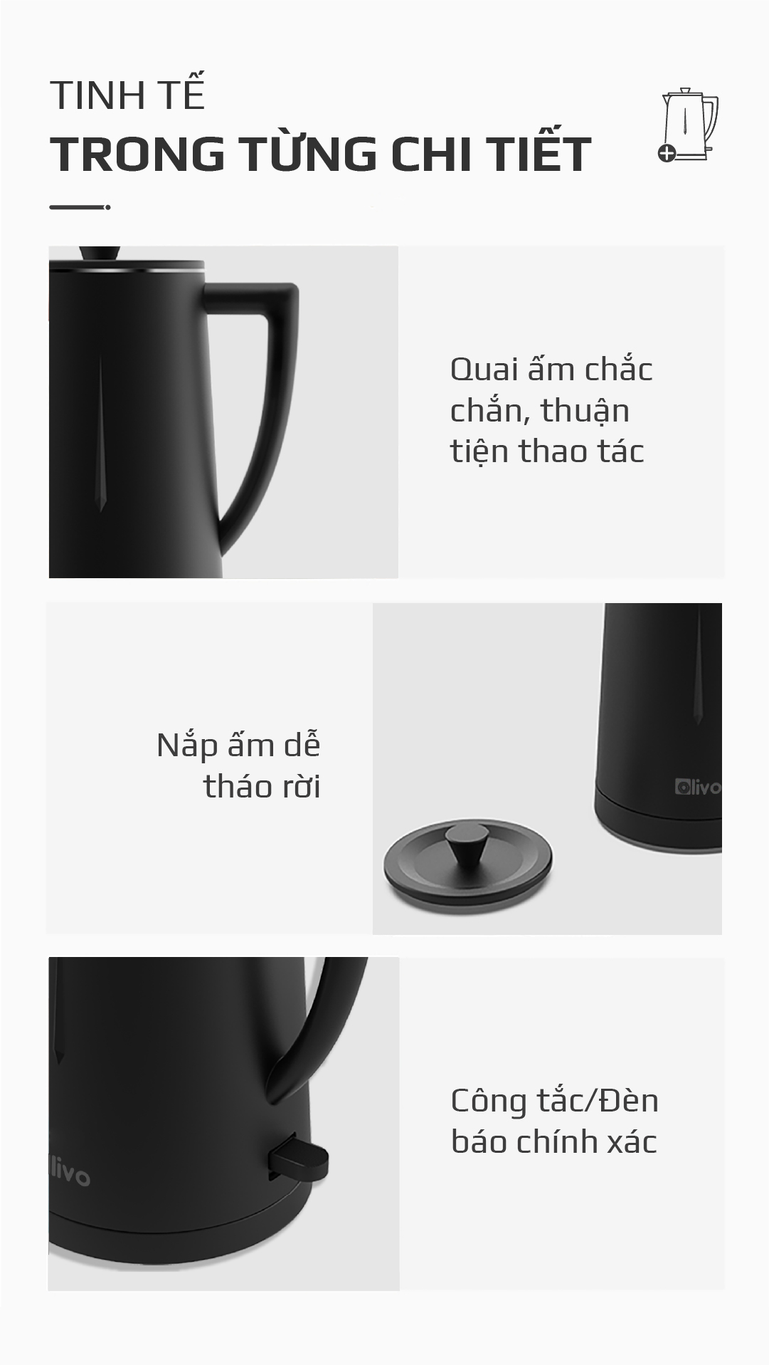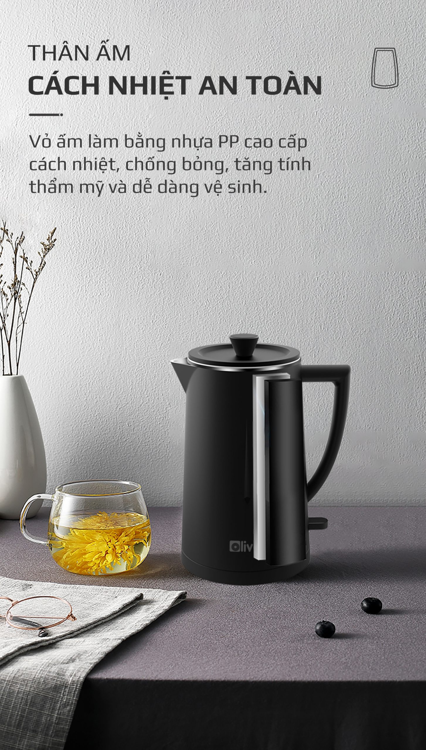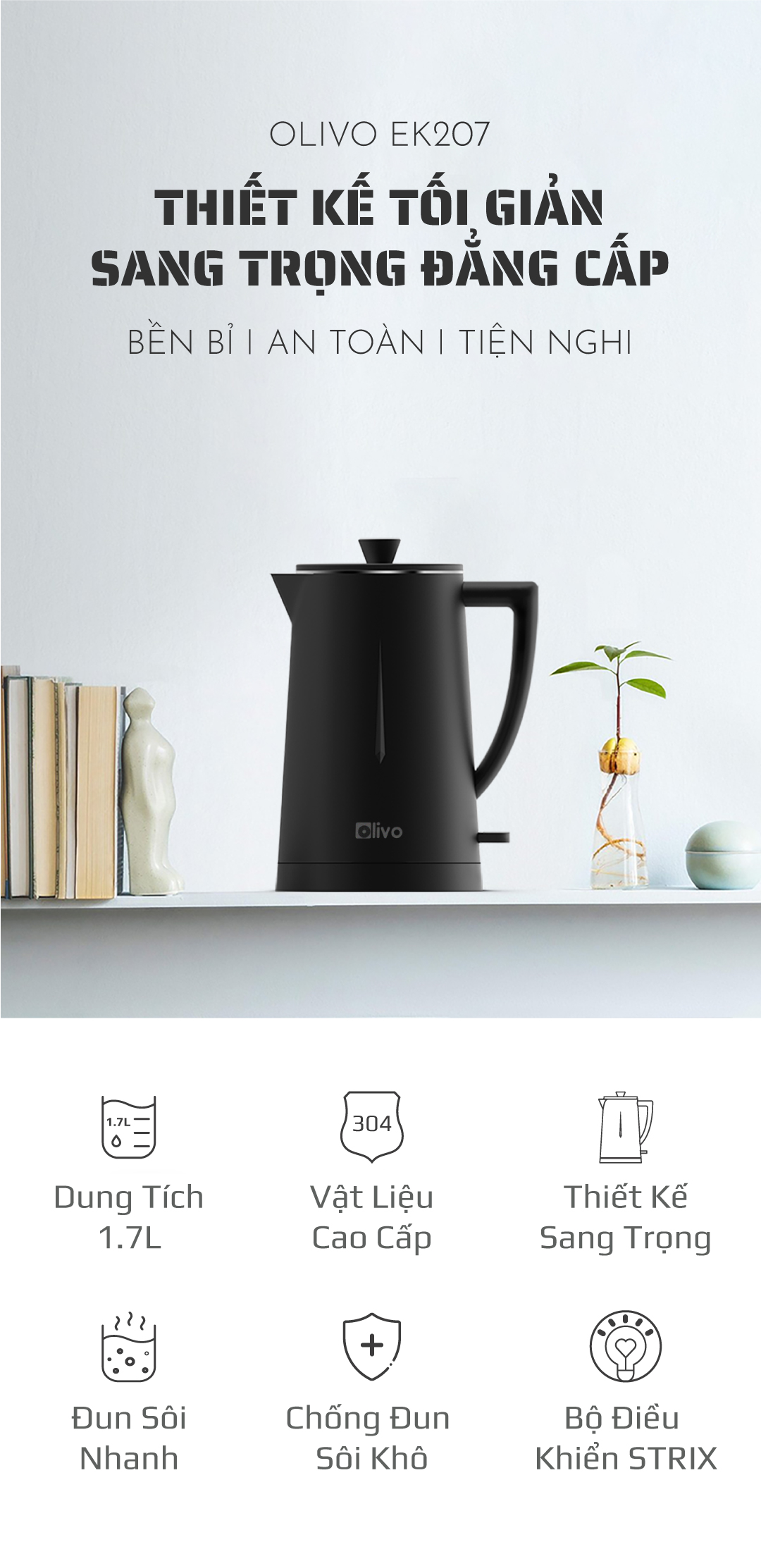 - Ấm siêu tốc OLIVO EK207 được thiết kế sang trọng và tinh tế, mang đến vẻ đẹp tối giản cho mọi không gian. Đây cũng là ấm nước tích hợp nhiều công nghệ hiện đại như bộ điều khiển STRIX và chống đun sôi khô, thời gian đun sôi nhanh chóng. Không những vậy, thiết bị này còn dễ dàng chinh phục người dùng bởi chất liệu cao cấp và an toàn cho sức khỏe, mang đến trải nghiệm vô cùng tiện lợi và dễ dàng.