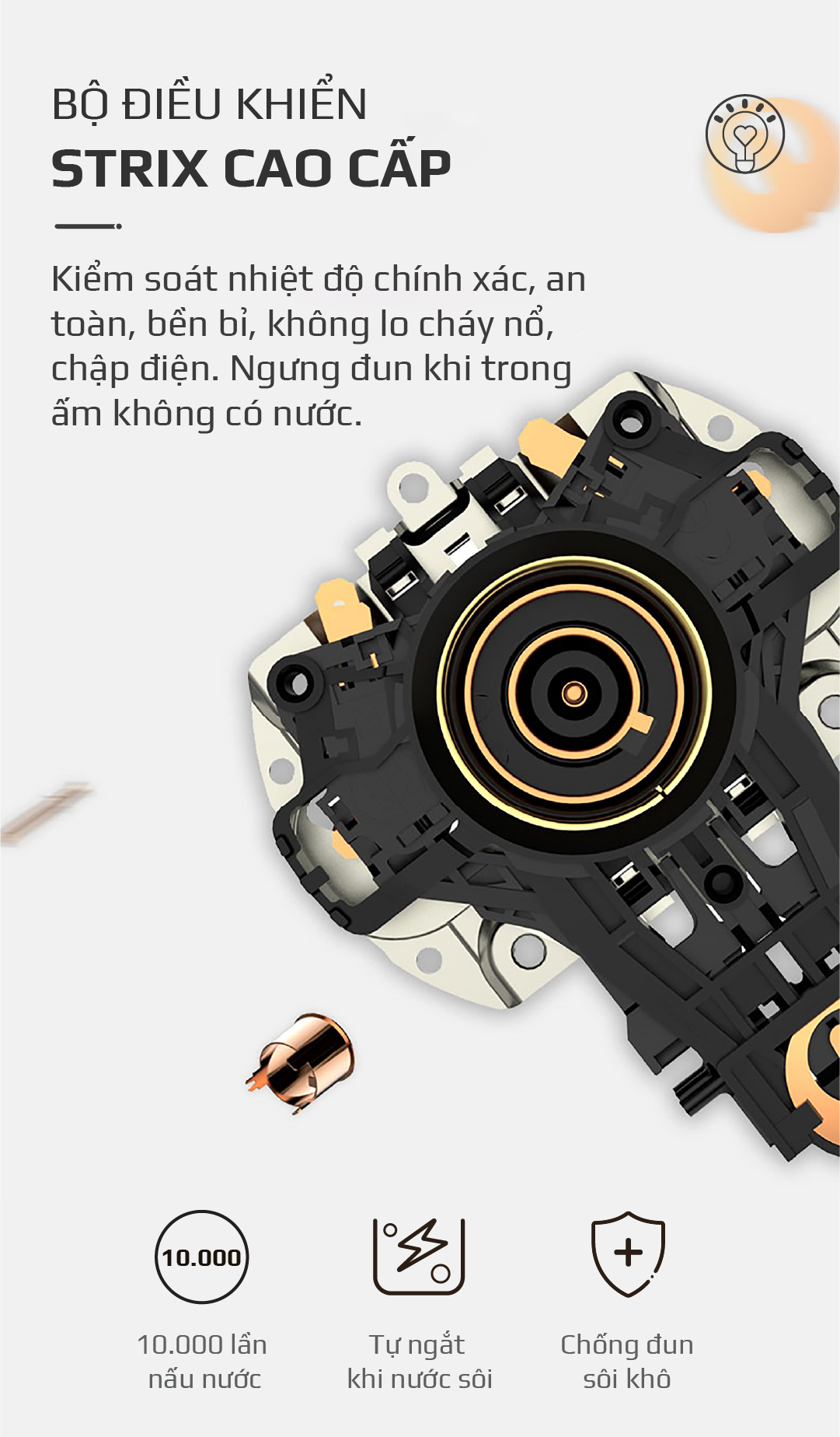- Công nghệ chống đun sôi khô, theo cơ chế này nếu ấm không có nước thì không thể hoạt động, ngay cả khi người dùng vô tình bật nút khởi động của ấm. Từ đó đảm bảo an toàn tuyệt đối cho người dùng cũng như phòng chống nguy cơ gây cháy nổ.