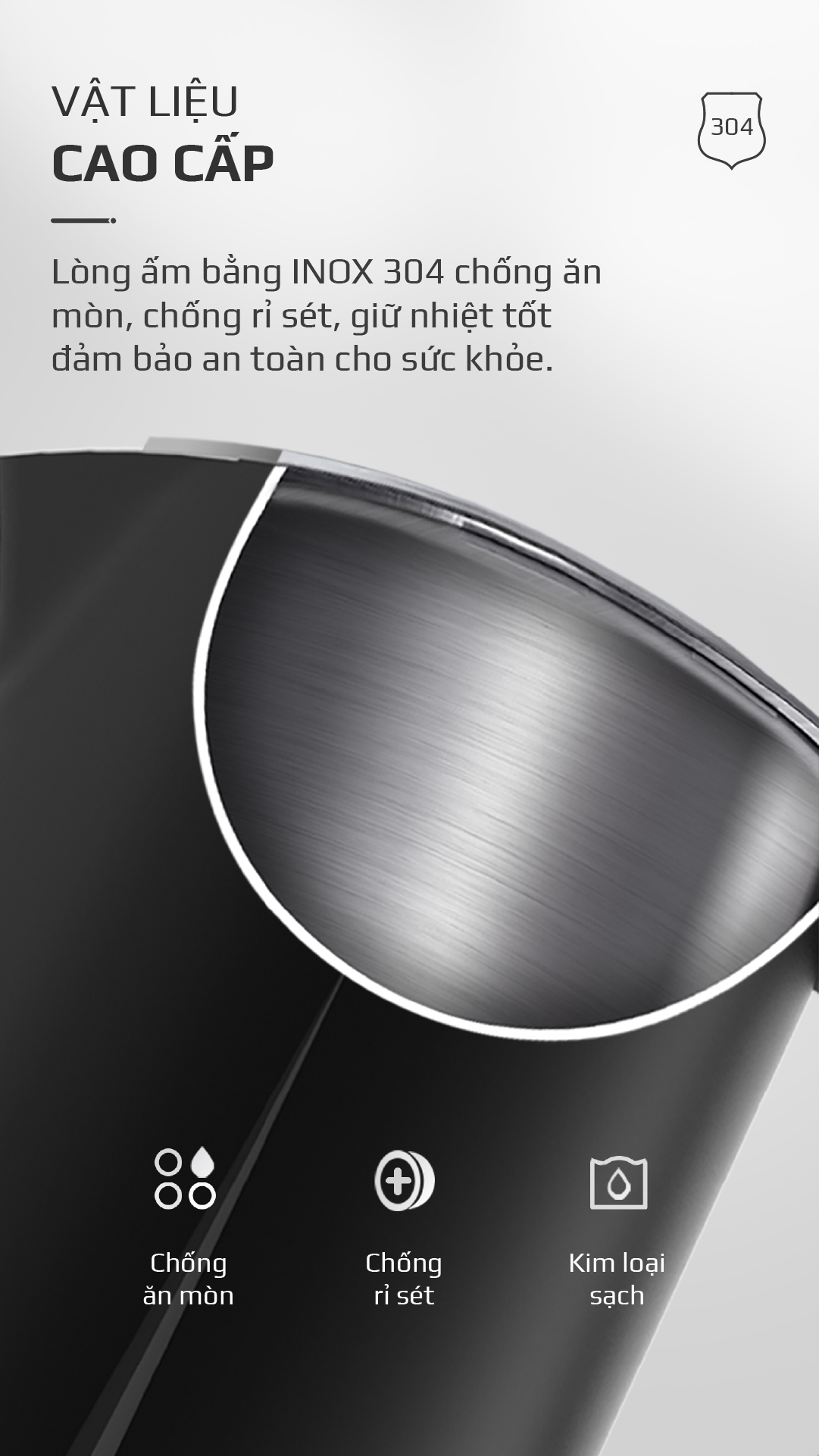 - Lòng ấm INOX 304 cao cấp chống ăn mòn, chống gỉ sét, giữ nhiệt tốt và an toàn cho sức khỏe người dùng nên người dùng có thể hoàn toàn yên tâm sử dụng hằng ngày. Chất liệu này cũng dễ dàng vệ sinh và làm sạch, đảm bảo lòng ấm luôn sạch bong và sáng bóng.
