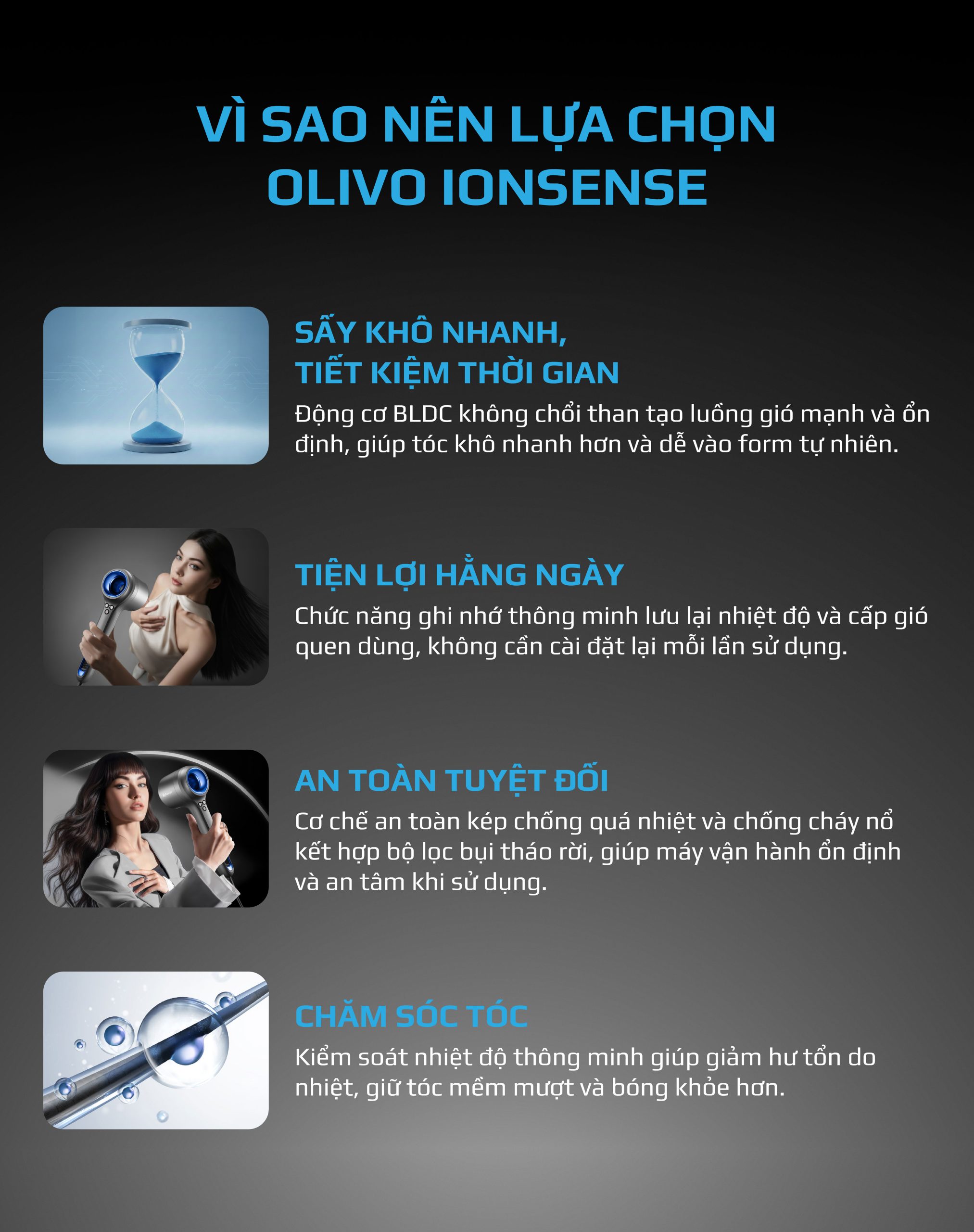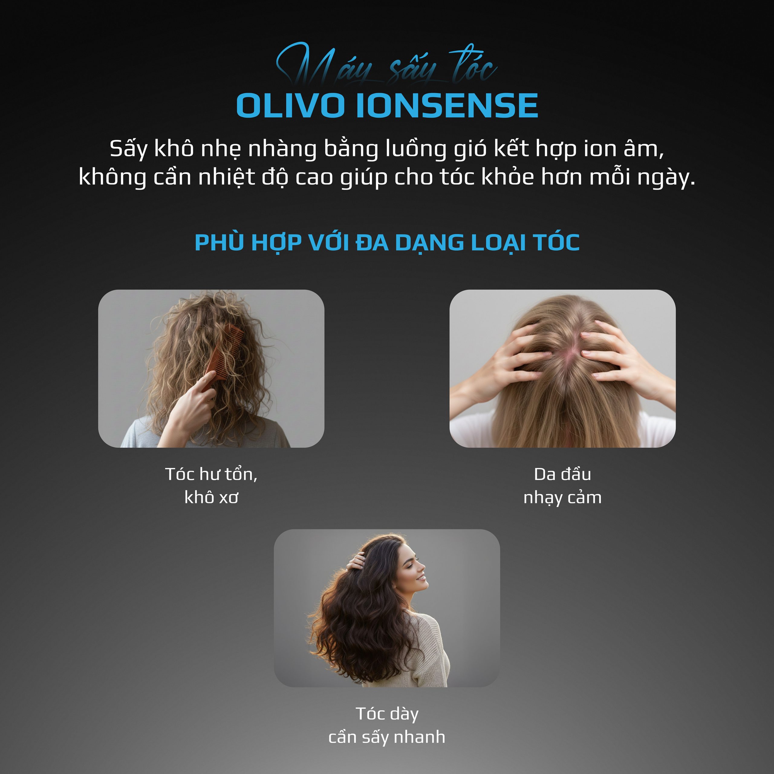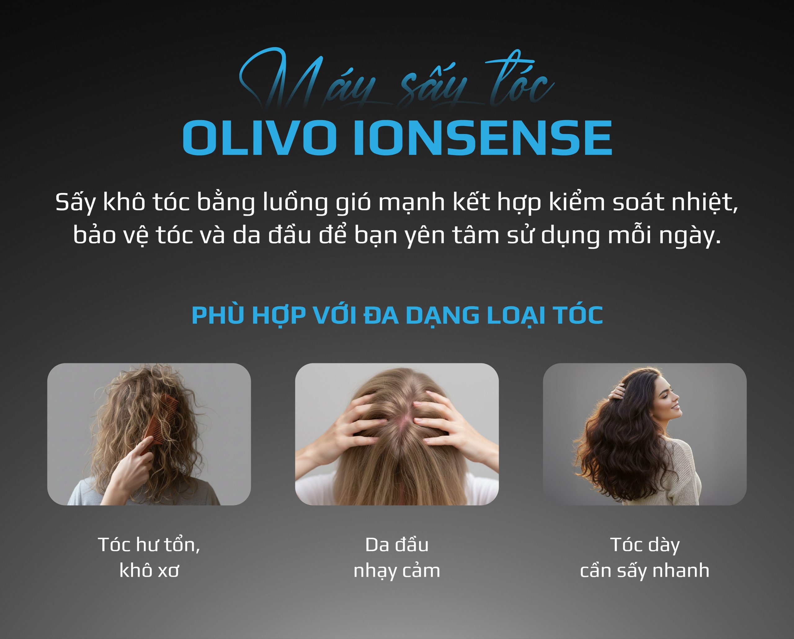 - Máy sấy tóc OLIVO IONSENSE không chỉ giúp tóc khô nhanh, mà còn nâng tầm trải nghiệm chăm sóc tóc mỗi ngày với công nghệ kiểm soát nhiệt thông minh, ion âm thế hệ mới và khả năng vận hành êm ái vượt trội. Đây là lựa chọn lý tưởng cho những ai mong muốn mái tóc khỏe đẹp lâu dài, giảm hư tổn do nhiệt và tiết kiệm thời gian trong nhịp sống bận rộn.
