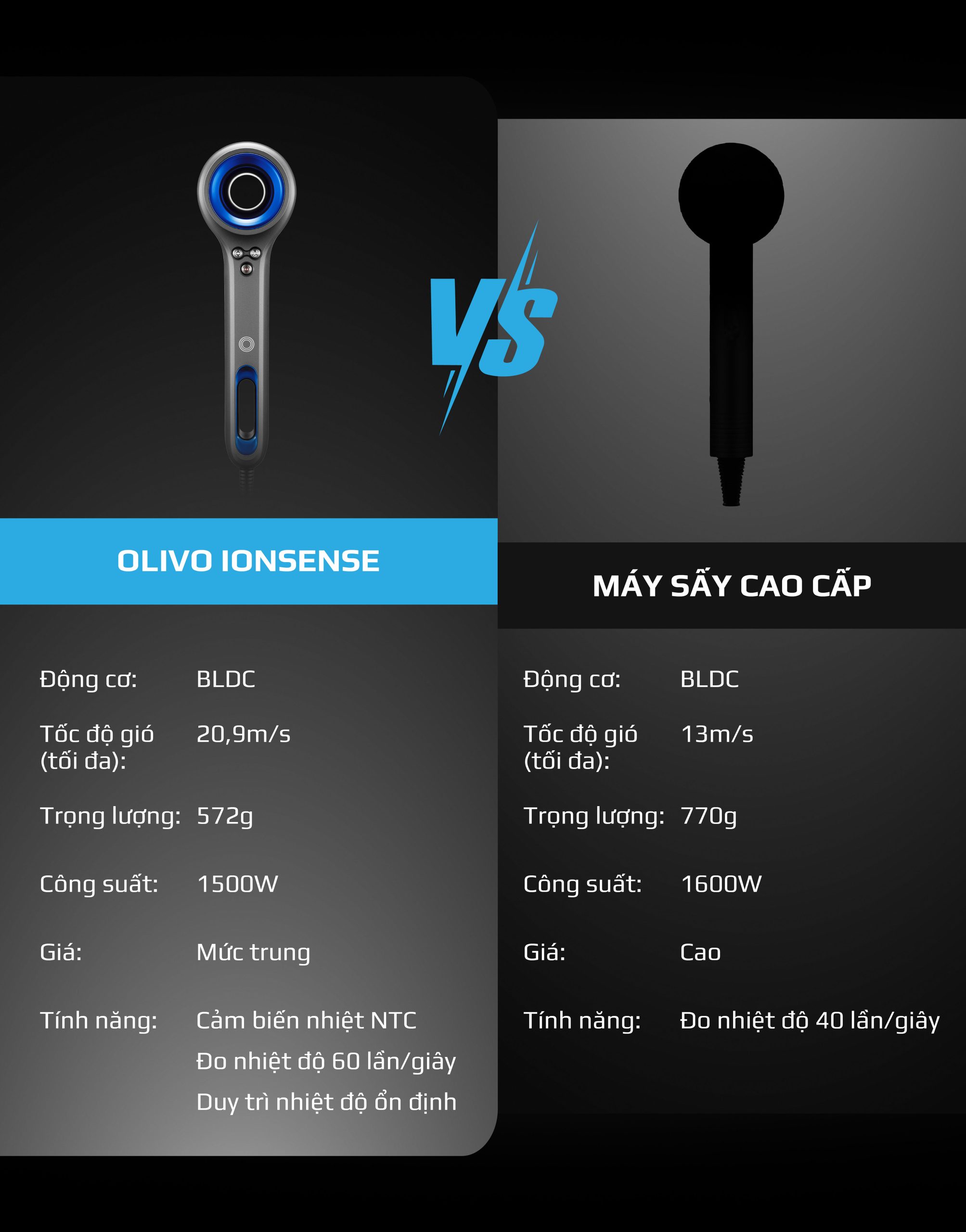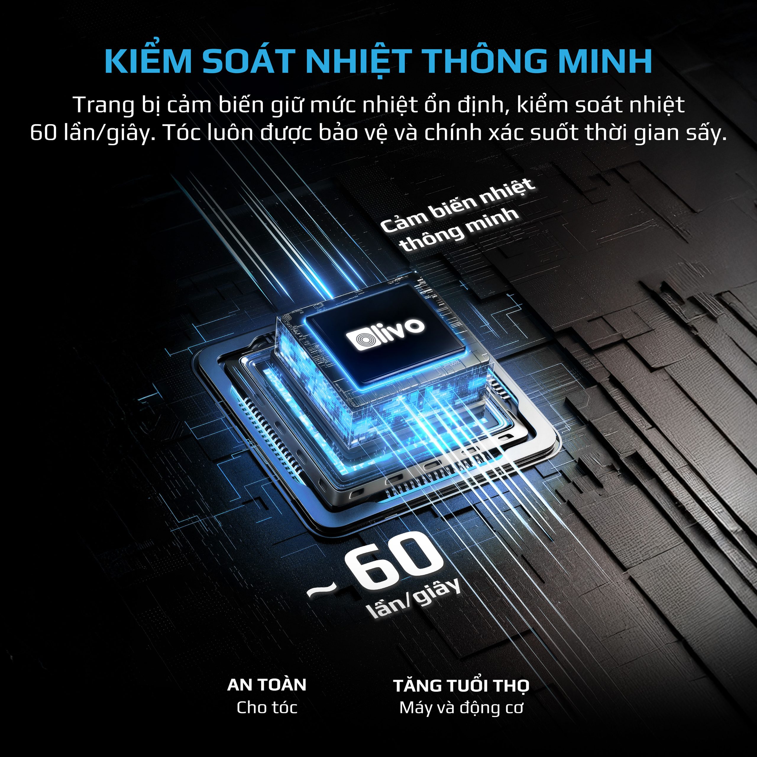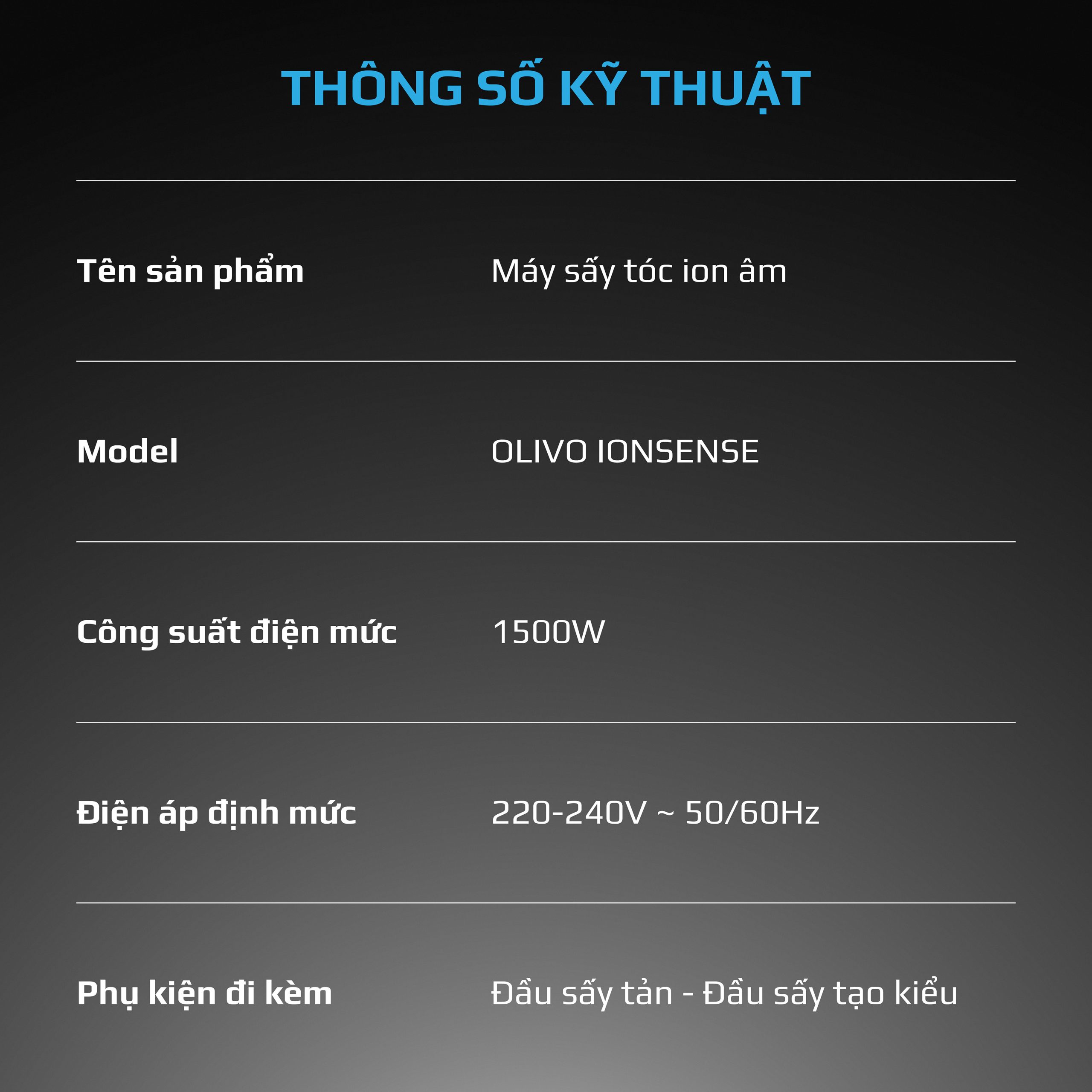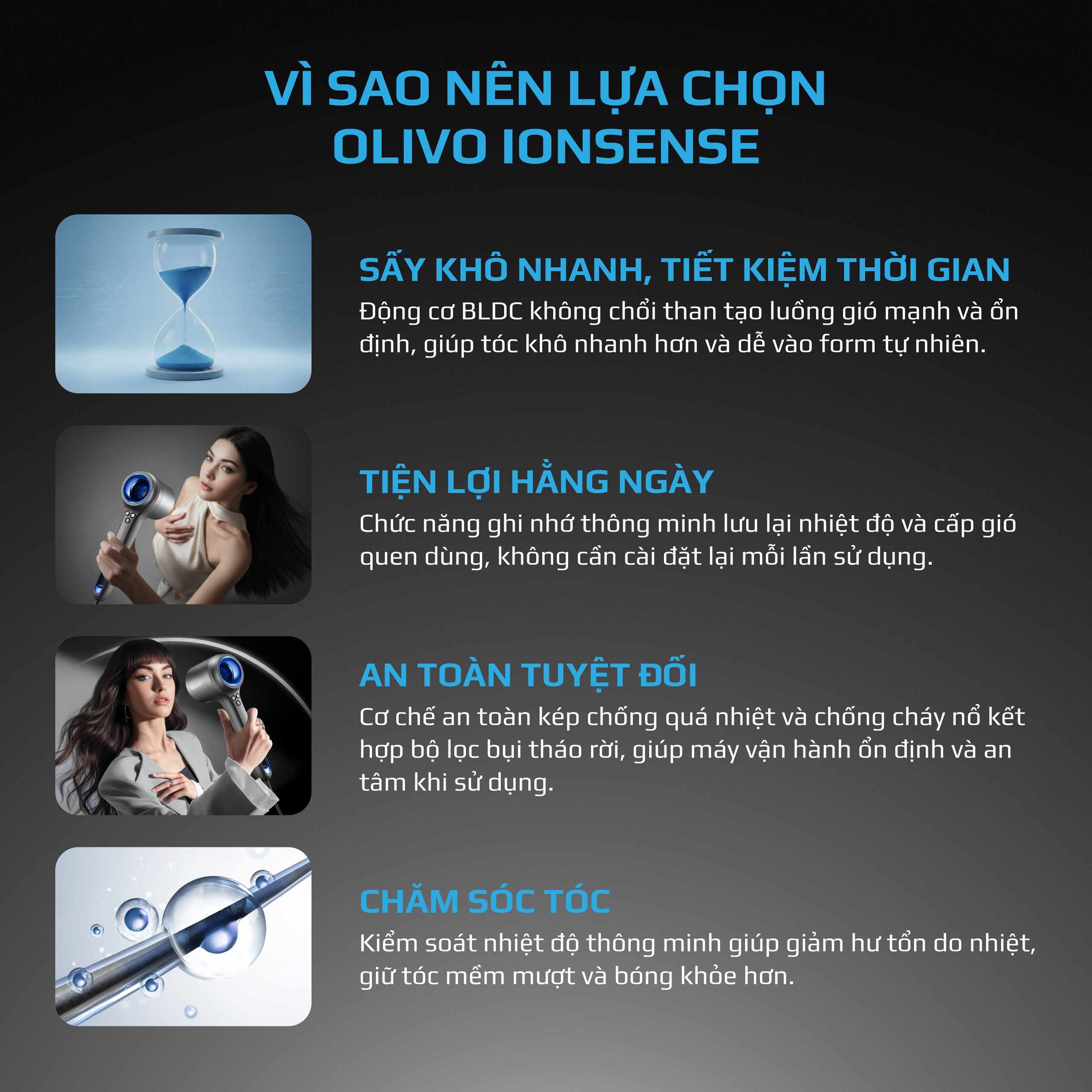 - Máy sấy tóc OLIVO IONSENSE không chỉ giúp tóc khô nhanh, mà còn nâng tầm trải nghiệm chăm sóc tóc mỗi ngày với công nghệ kiểm soát nhiệt thông minh, ion âm thế hệ mới và khả năng vận hành êm ái vượt trội. Đây là lựa chọn lý tưởng cho những ai mong muốn mái tóc khỏe đẹp lâu dài, giảm hư tổn do nhiệt và tiết kiệm thời gian trong nhịp sống bận rộn.
