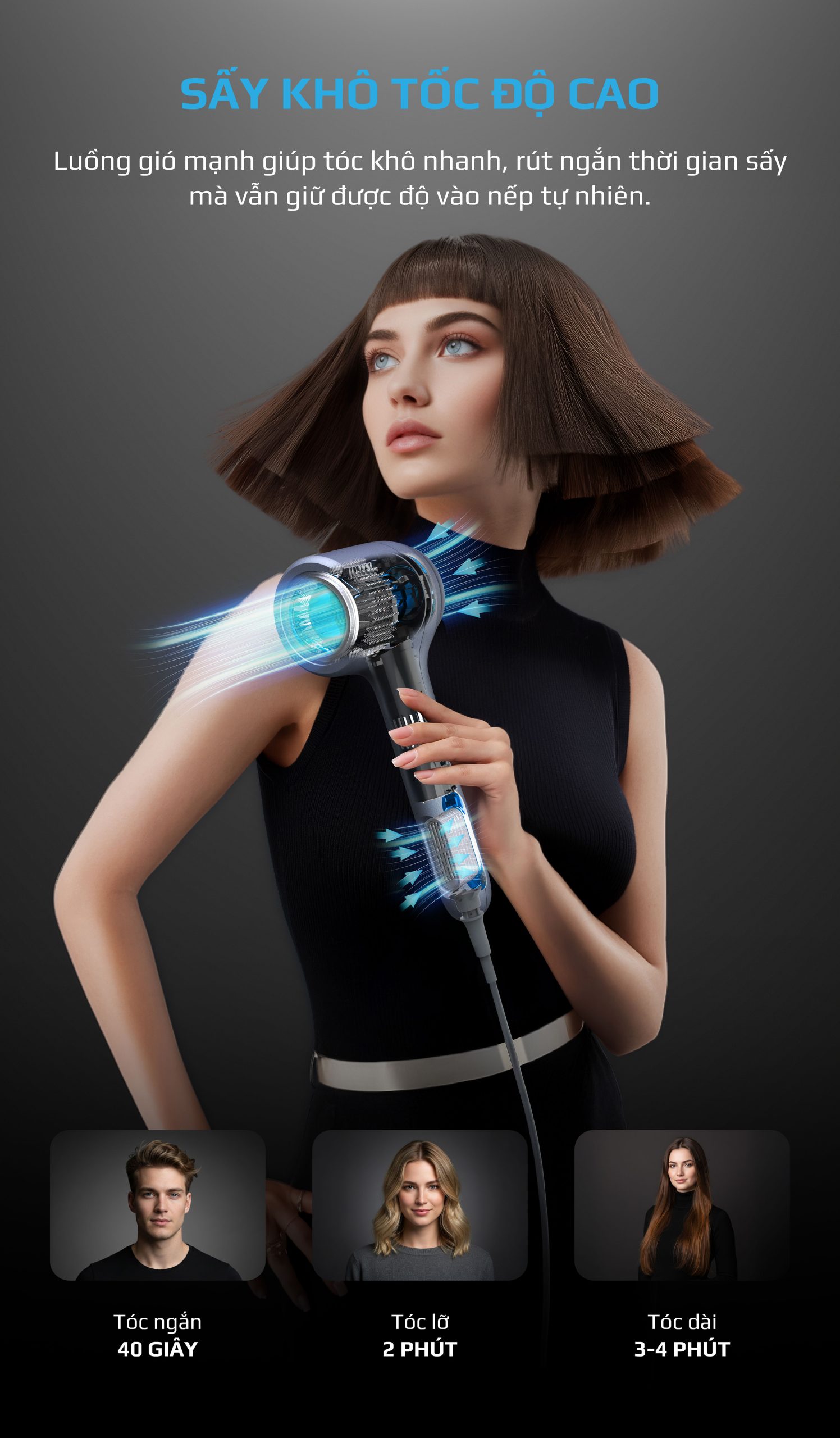 - Với IonSense, thời gian sấy được tối ưu rõ rệt: tóc ngắn chỉ khoảng 40 giây, tóc lỡ khoảng 2 phút và tóc dài khoảng 3–4 phút. Điều này không chỉ giúp tiết kiệm thời gian mà còn giảm tổng lượng nhiệt tác động lên tóc, hạn chế hư tổn do sấy kéo dài