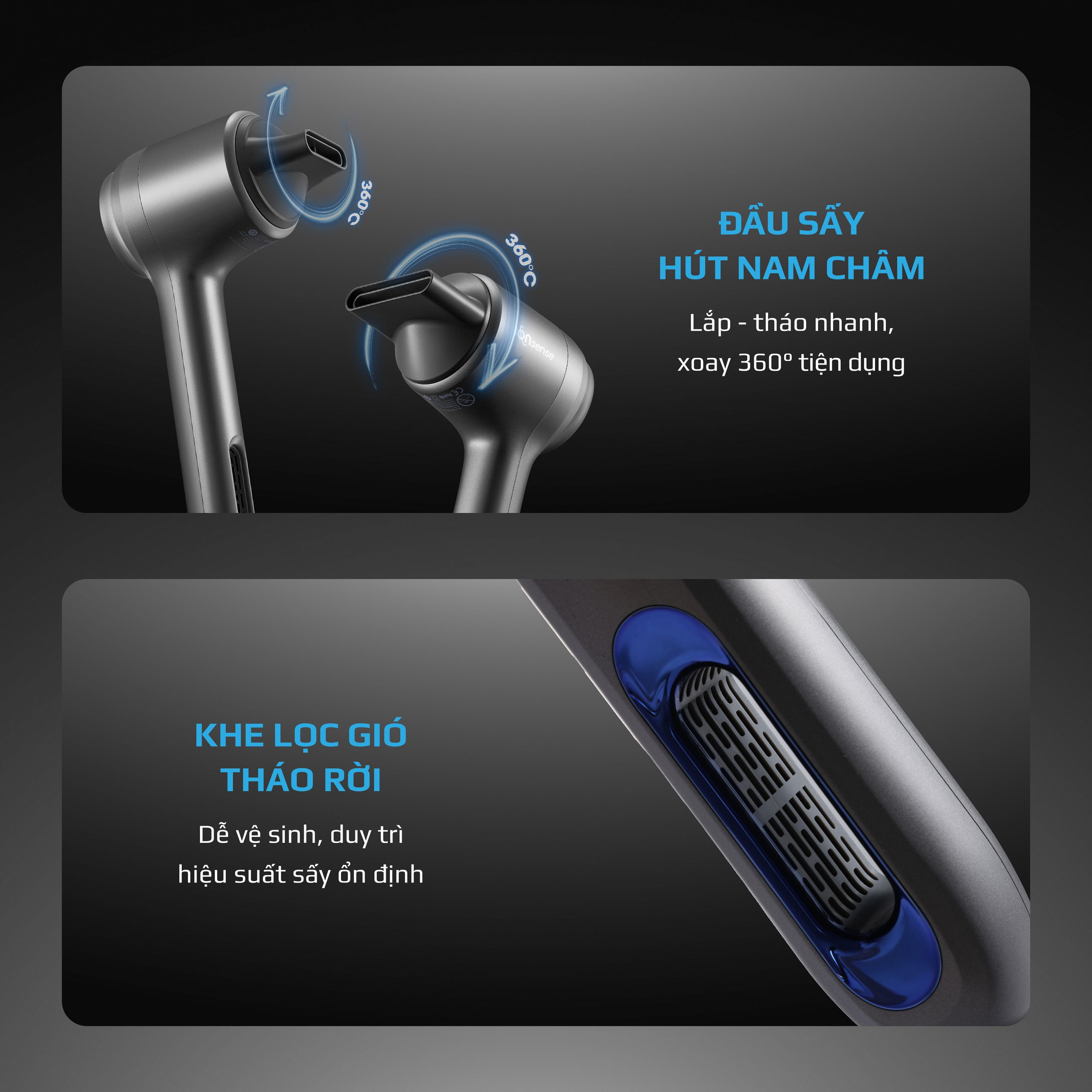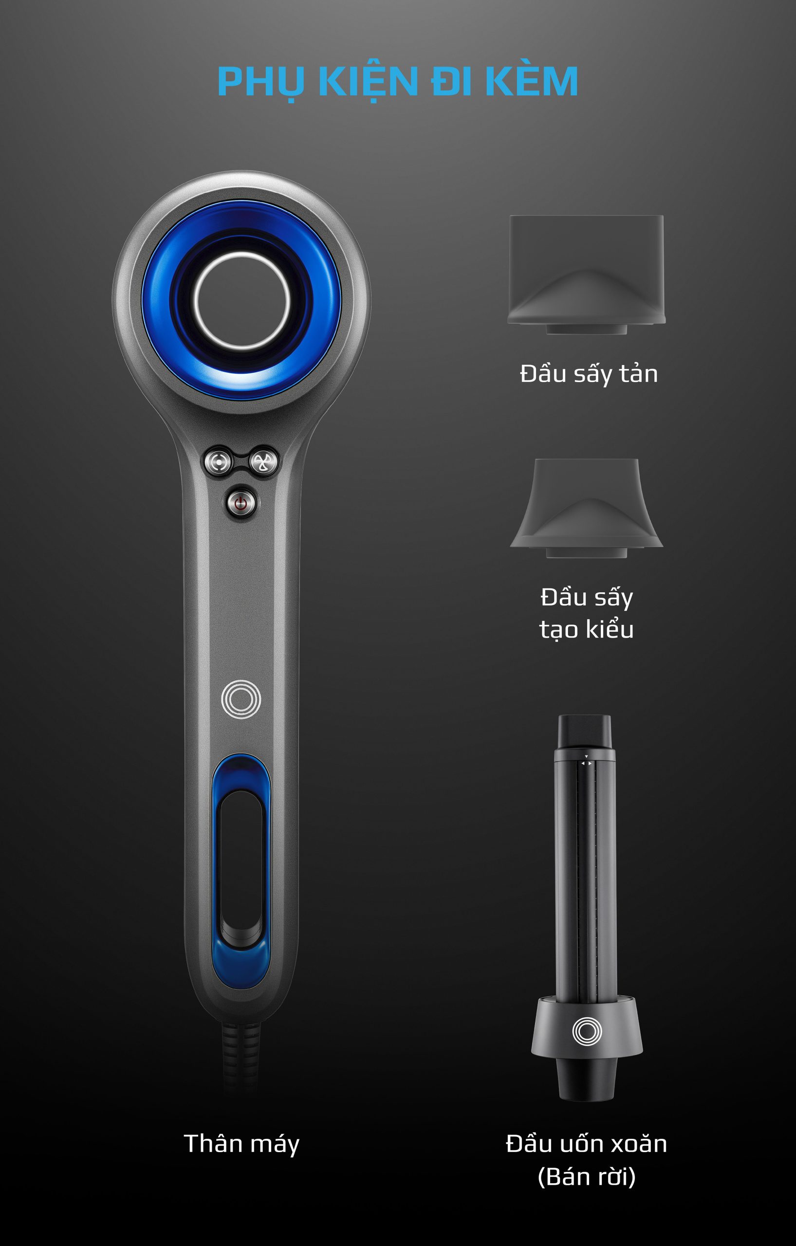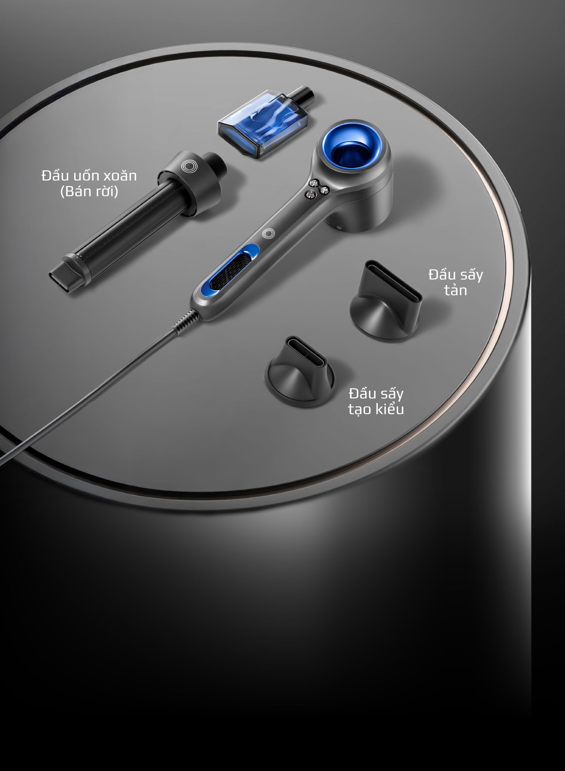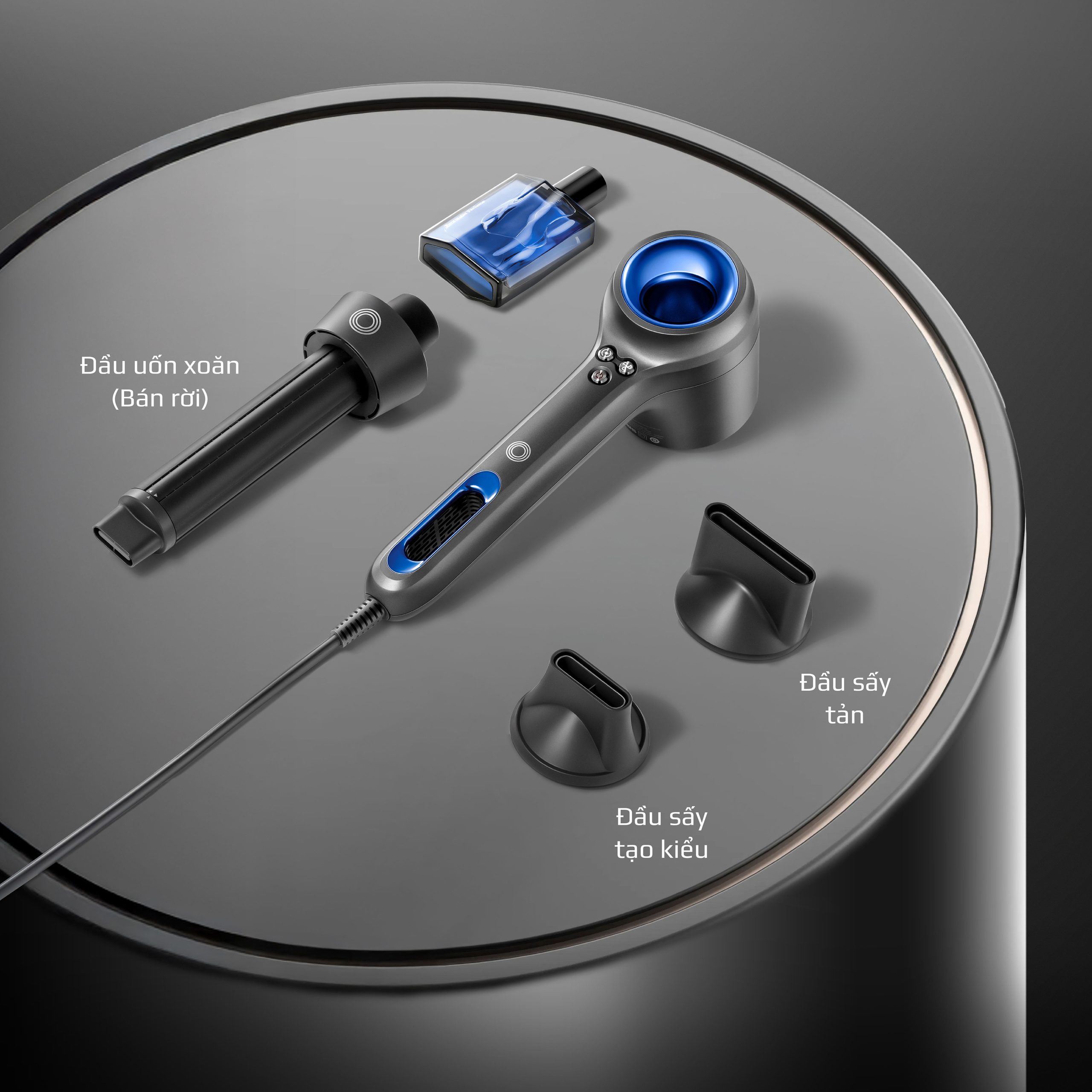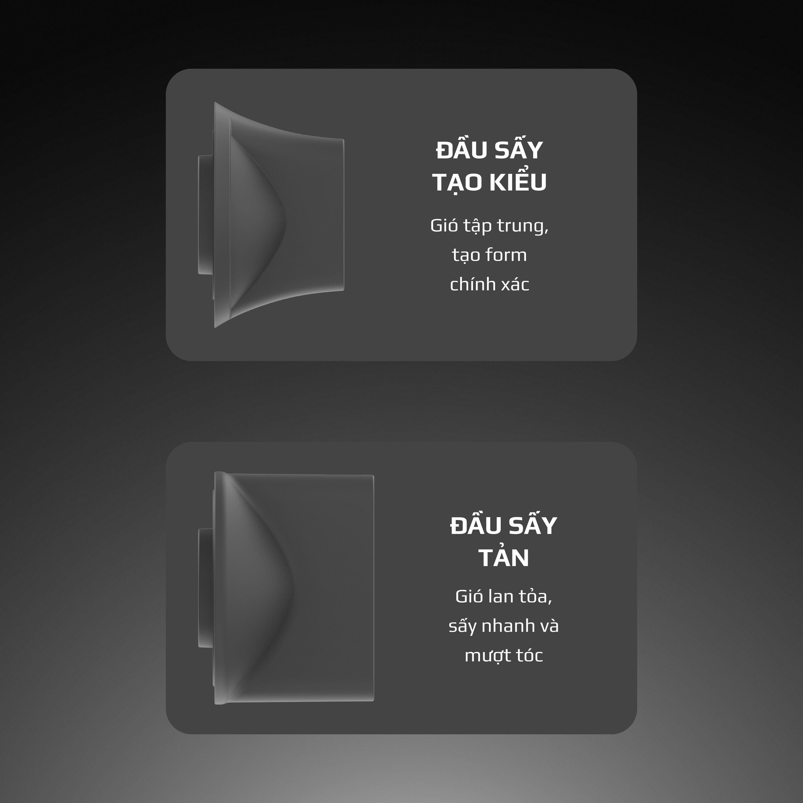- Máy đi kèm 2 đầu sấy xoay 360°, giúp người dùng dễ dàng thay đổi và điều chỉnh theo từng kiểu tóc. Đầu sấy tạo kiểu tập trung luồng gió để vào form chính xác, trong khi đầu sấy tản giúp luồng gió lan tỏa đều, sấy nhanh và làm mượt tóc. Thiết kế này giúp việc sấy và tạo kiểu trở nên linh hoạt hơn, phù hợp cho cả nhu cầu sấy cơ bản và tạo form cầu kỳ.