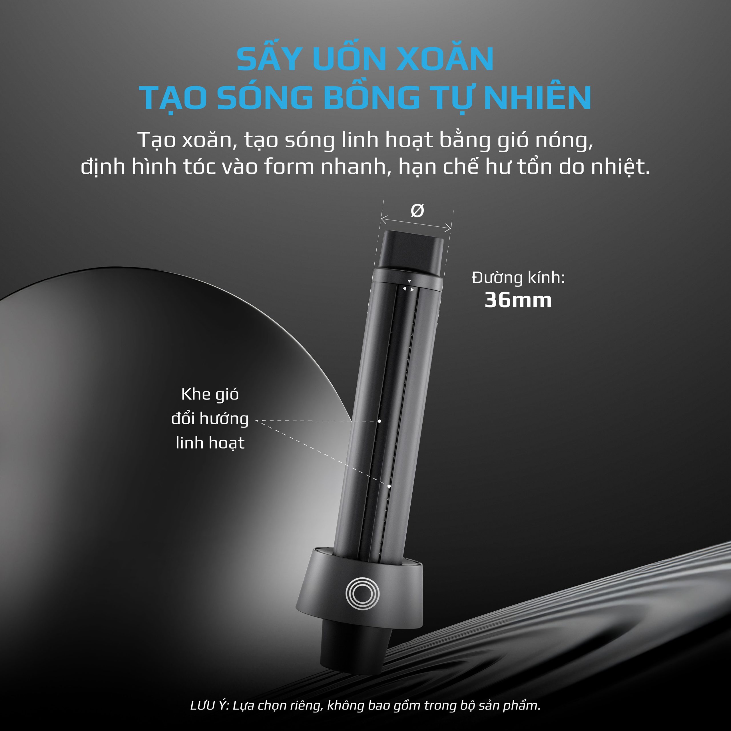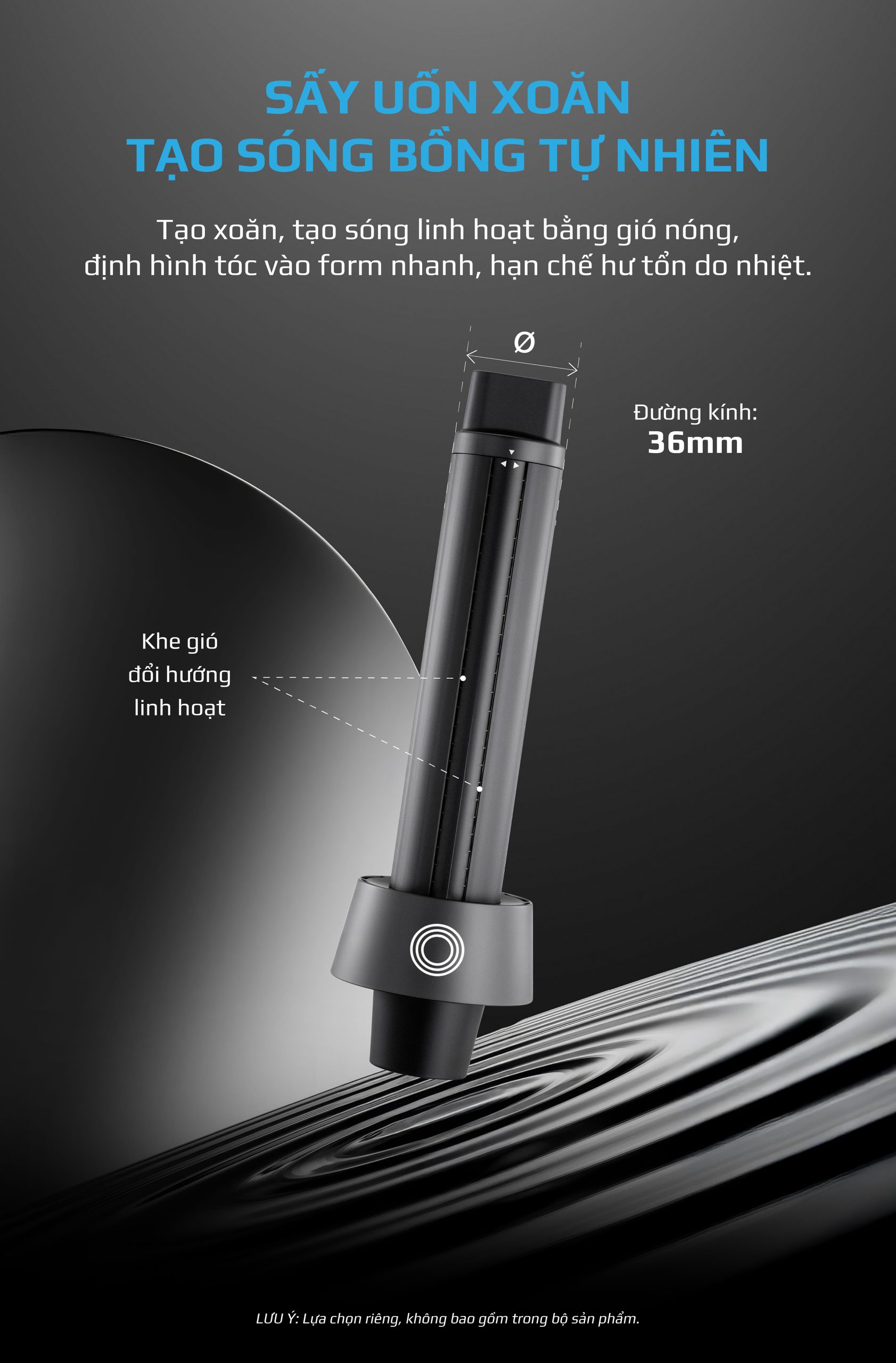 - Phụ kiến bán rời đầu sấy uốn xoăn hỗ trợ tạo xoăn và tạo sóng bằng luồng gió nóng kết hợp kiểm soát nhiệt, giúp tóc nhanh chóng vào form mà hạn chế tác động nhiệt quá mức. Nhờ đó, tóc giữ được độ bồng tự nhiên, sóng tóc rõ nét nhưng vẫn mềm và dễ chịu sau khi tạo kiểu.