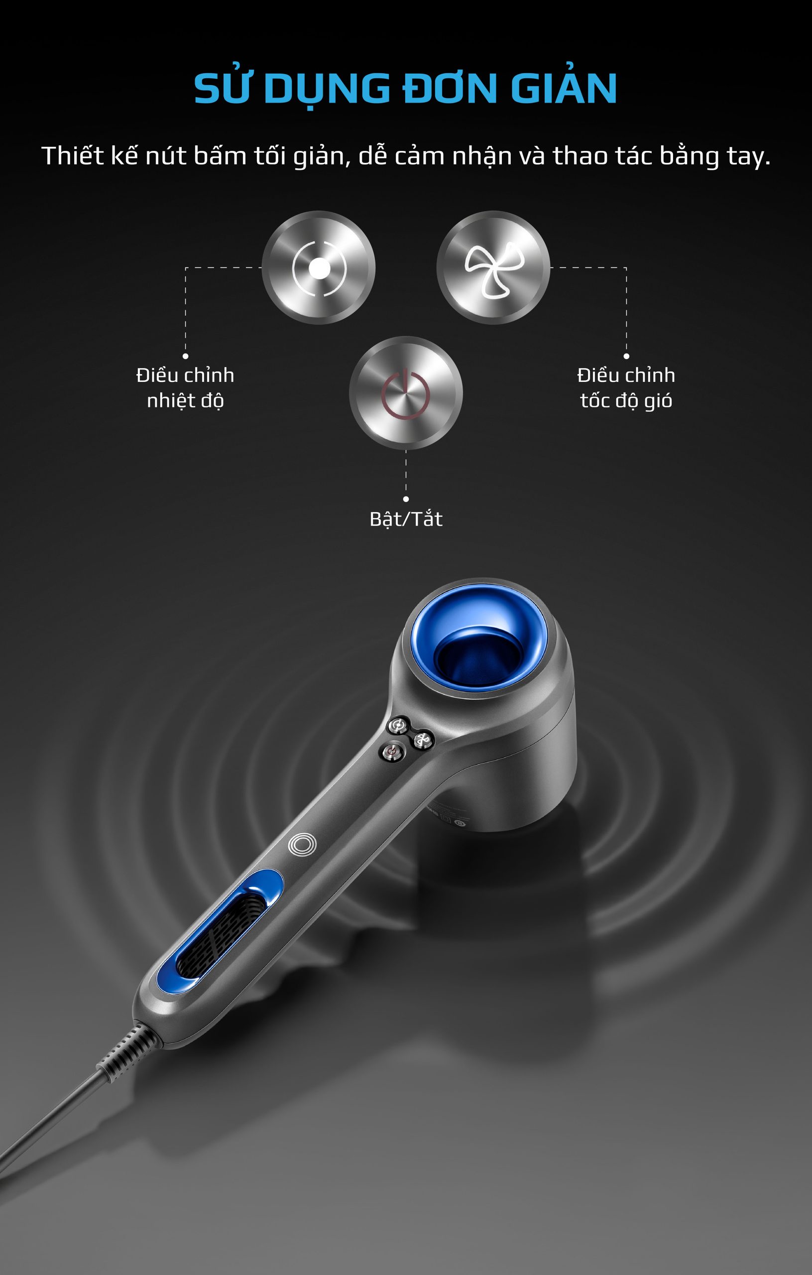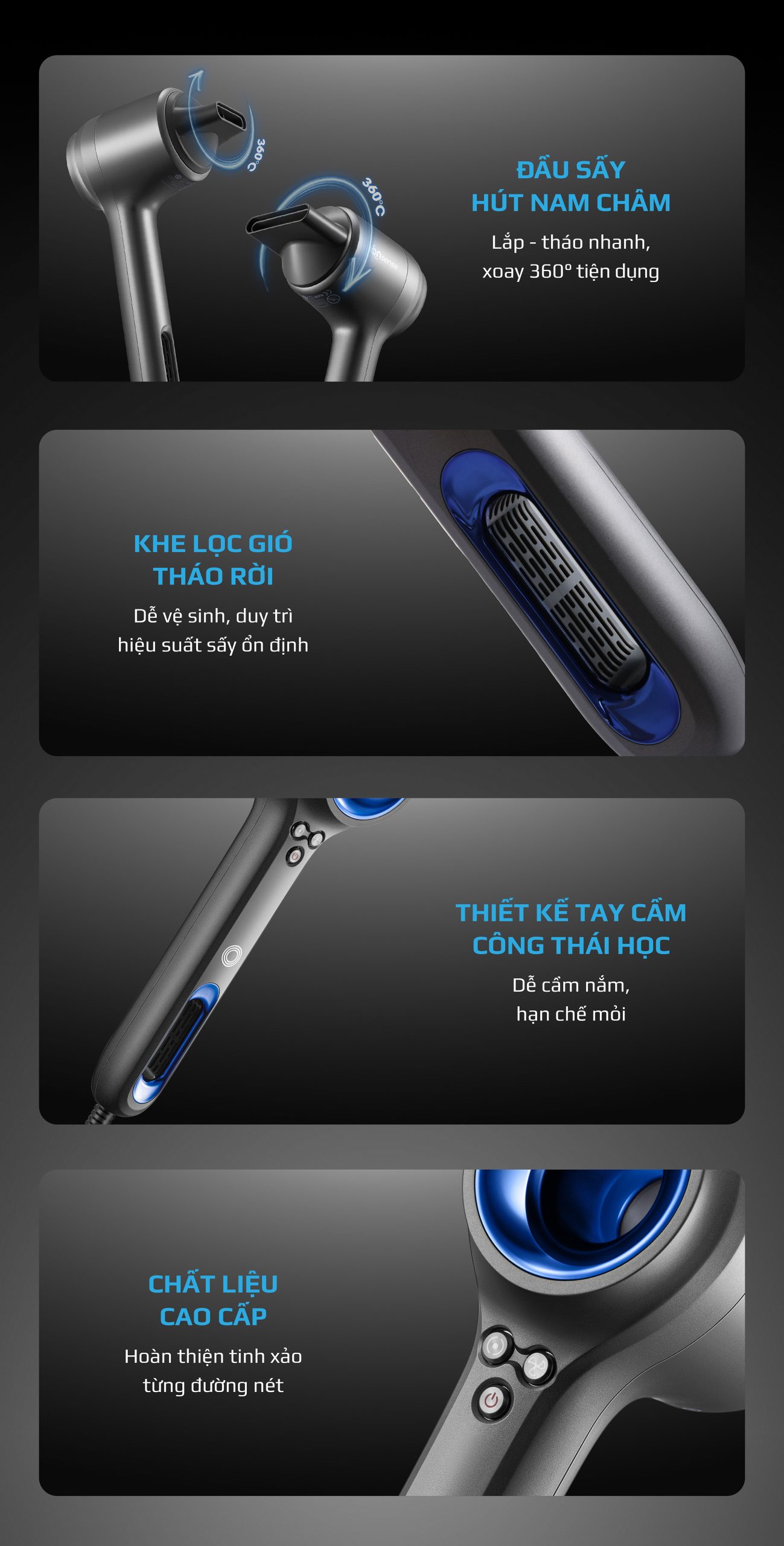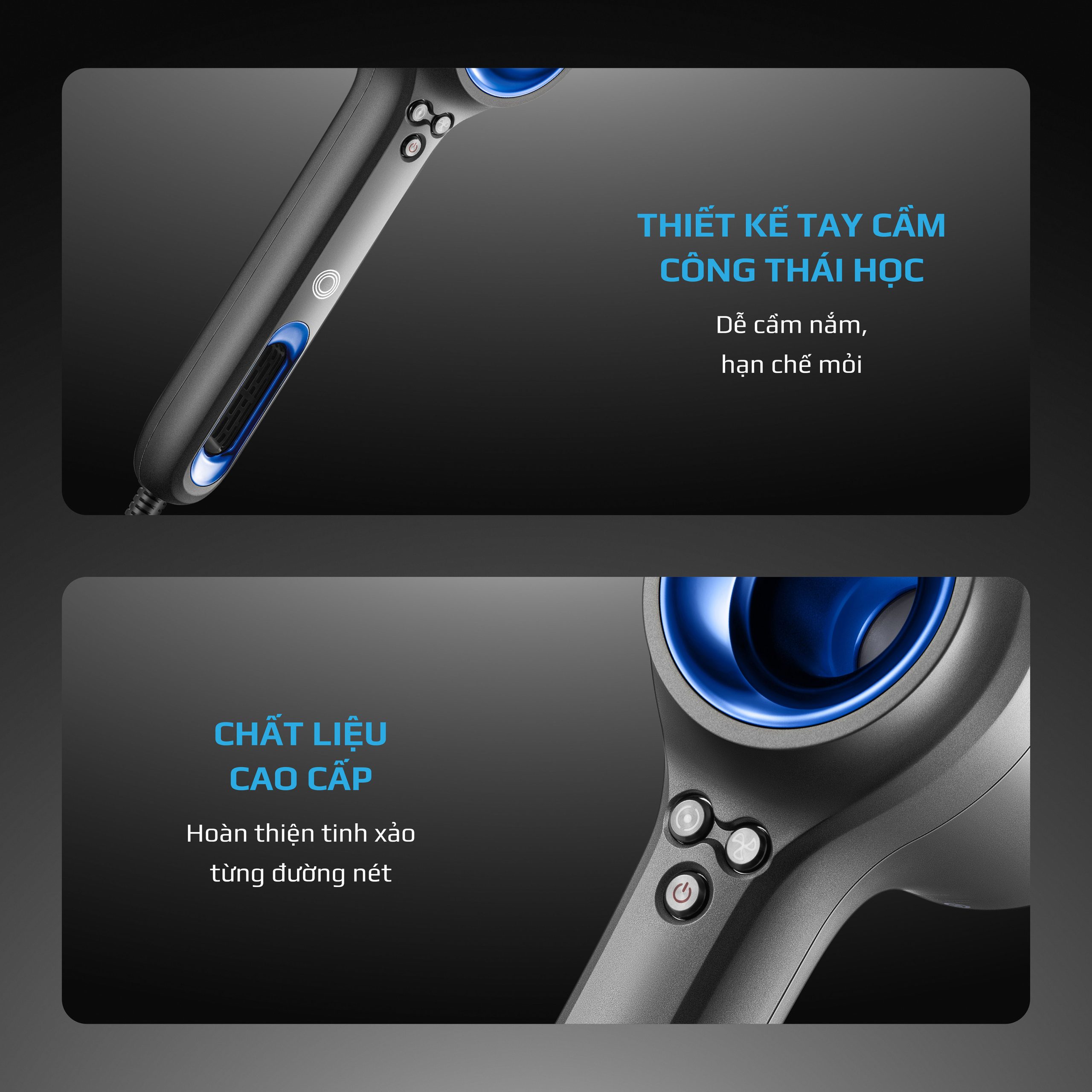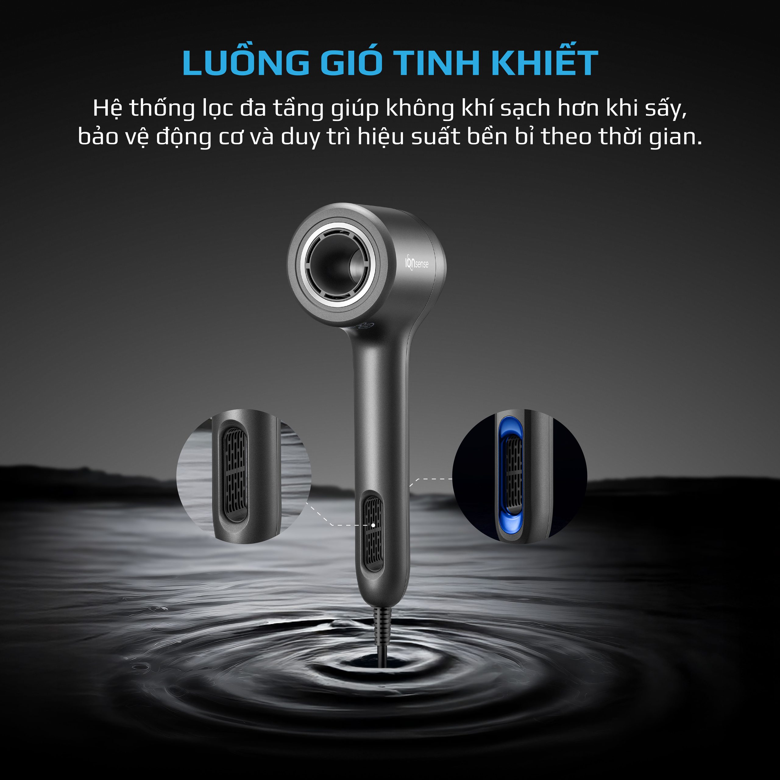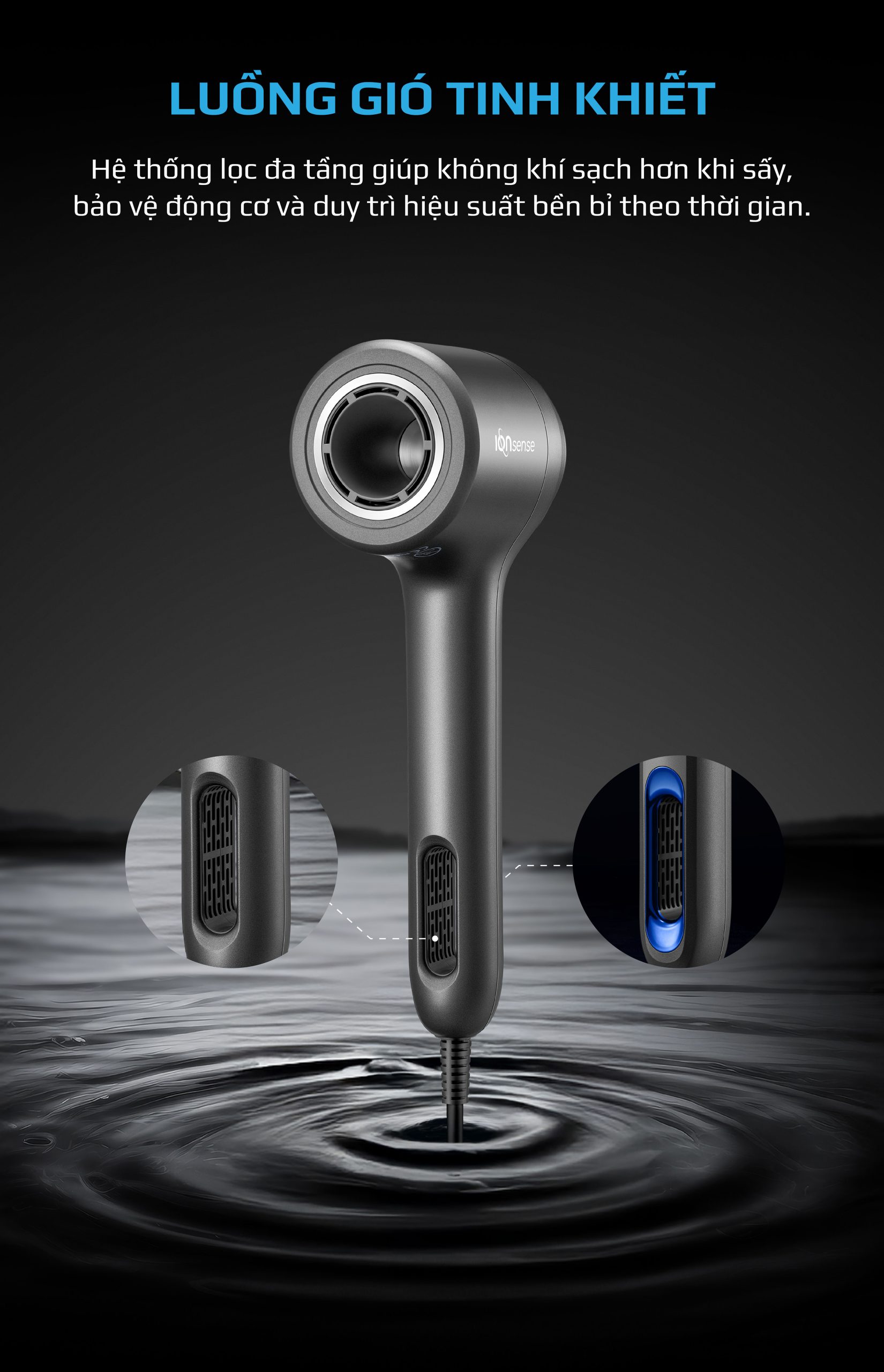 - Hệ thống lọc bụi đa tầng giúp giữ lại bụi bẩn và tạp chất trong không khí trước khi luồng gió thổi ra ngoài. Nhờ đó, luồng gió khi sấy trở nên tinh khiết hơn, an toàn và dễ chịu cho tóc và da đầu, đồng thời giúp bảo vệ động cơ, duy trì hiệu suất và kéo dài tuổi thọ máy.