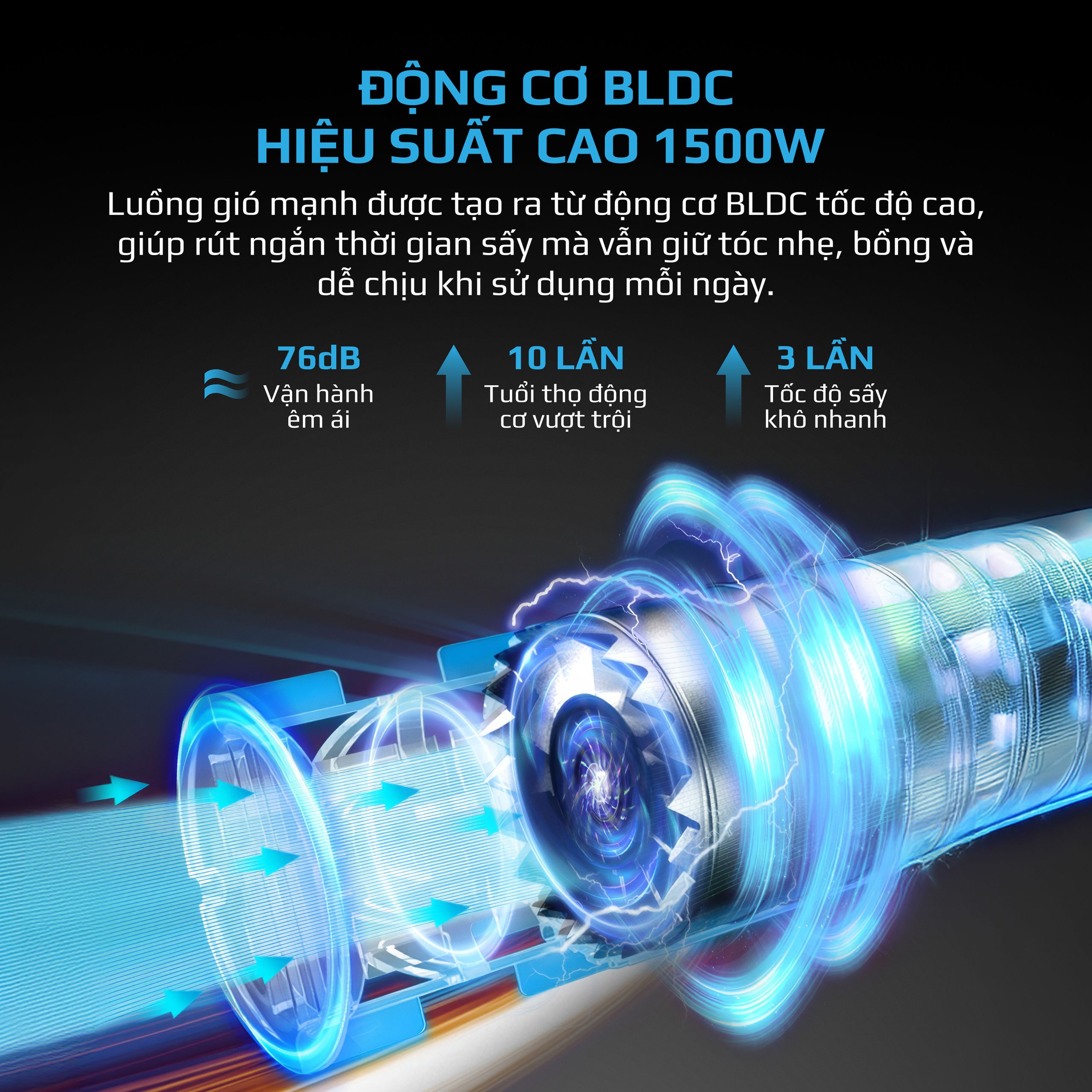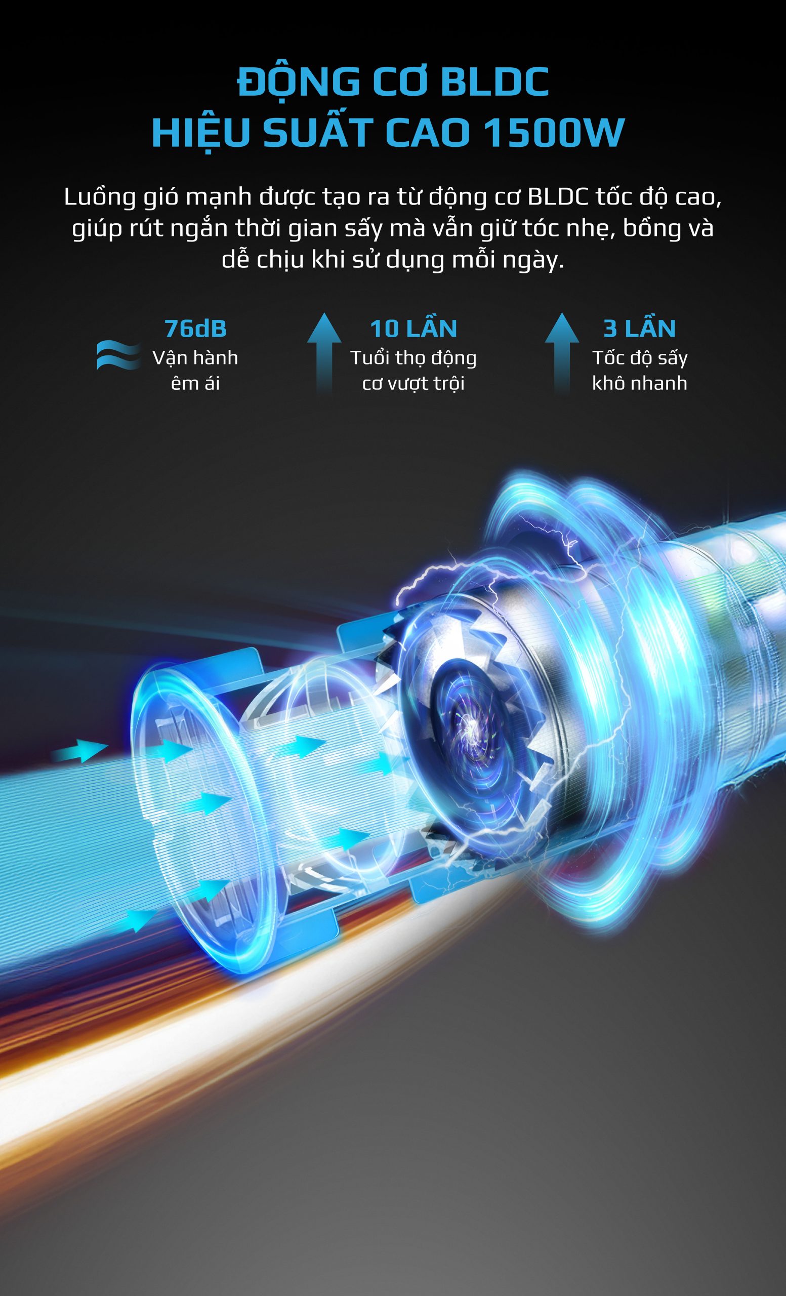 - OLIVO IONSENSE sử dụng động cơ BLDC hiệu suất cao 1500W, tạo luồng gió mạnh và ổn định giúp rút ngắn đáng kể thời gian sấy. Nhờ đó, tóc khô nhanh hơn nhưng vẫn giữ được độ vào nếp tự nhiên, không bị khô ráp do sấy quá lâu.
