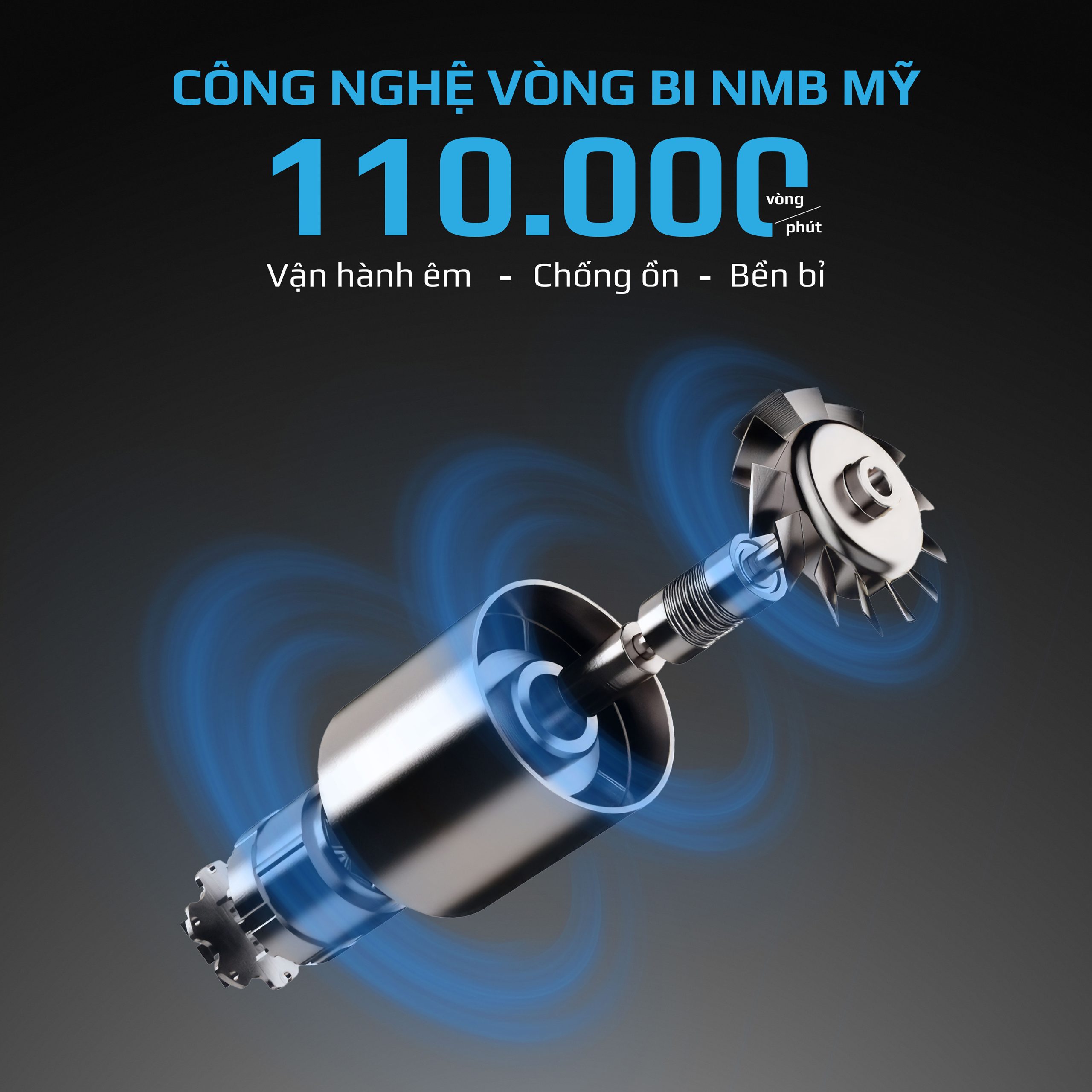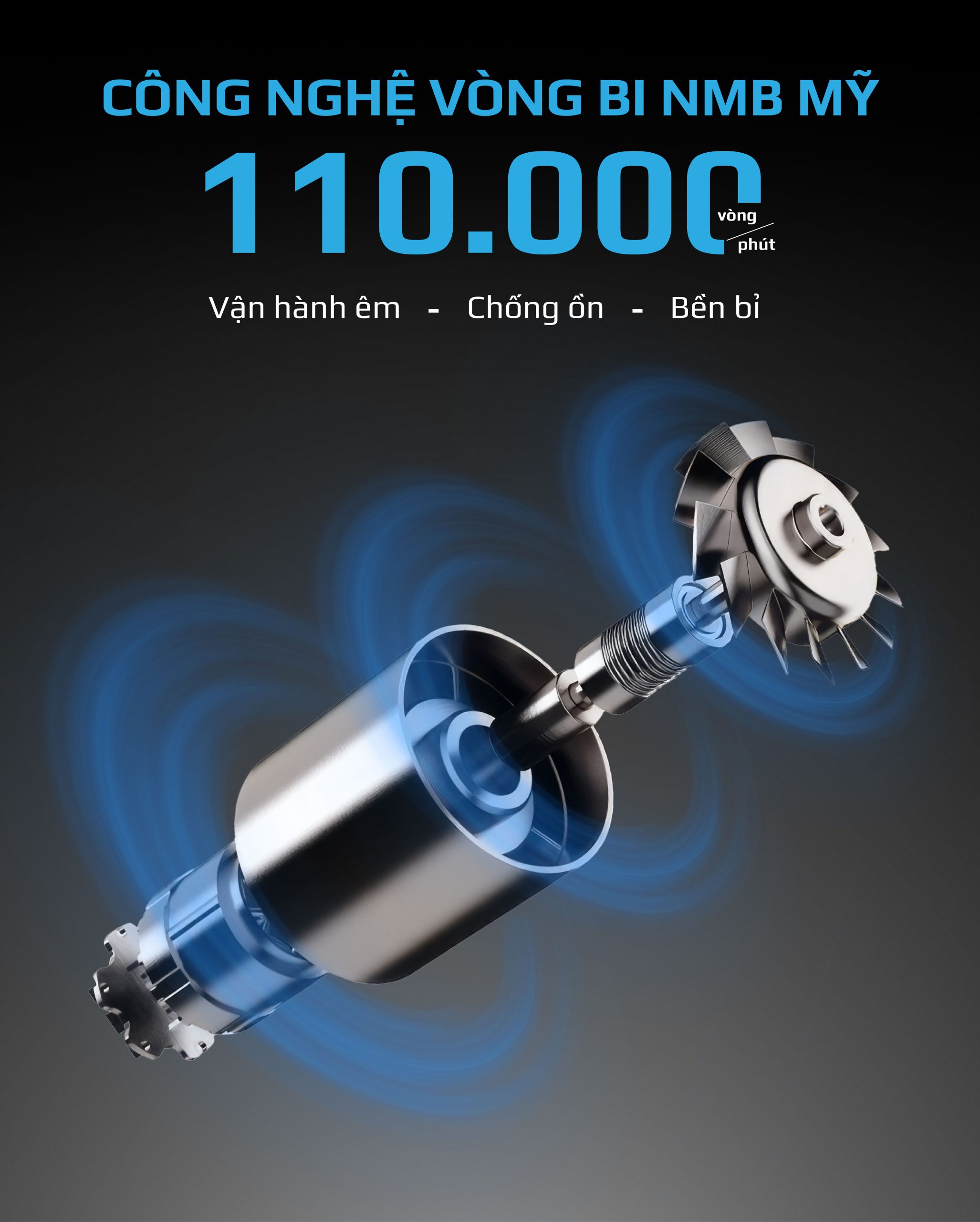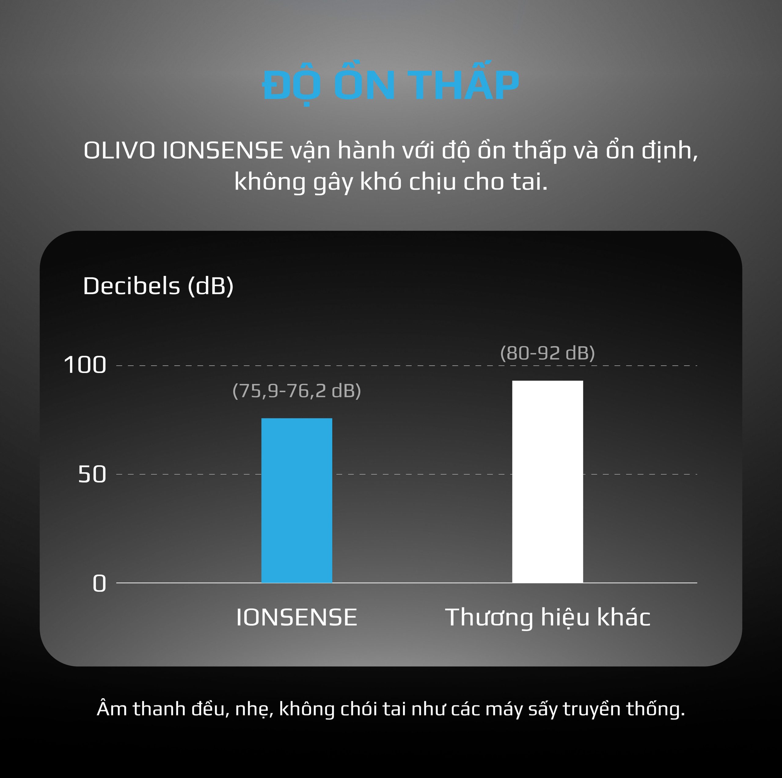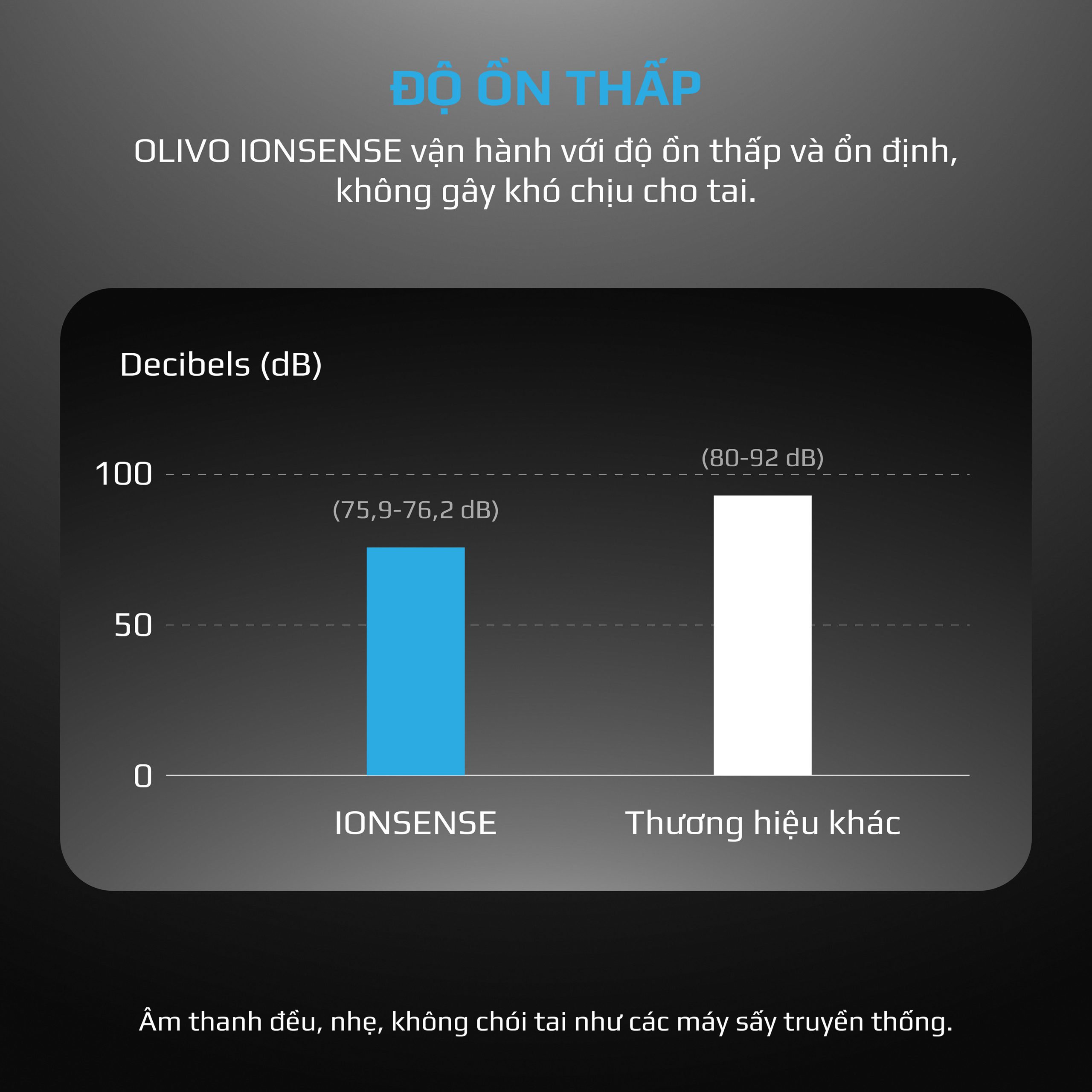 - Động cơ BLDC tốc độ cao kết hợp với công nghệ vòng bi NMB Mỹ cao cấp giúp OLIVO IONSENSE vận hành mượt mà, giảm ma sát và hạn chế rung lắc khi hoạt động ở tốc độ lớn. Nhờ đó, máy duy trì độ ồn thấp, âm thanh đều và dễ chịu, không gây khó chịu cho tai như nhiều dòng máy sấy truyền thống. Việc vận hành ổn định không chỉ nâng cao trải nghiệm sử dụng mà còn giúp tăng tuổi thọ động cơ, đảm bảo hiệu suất sấy bền bỉ theo thời gian.