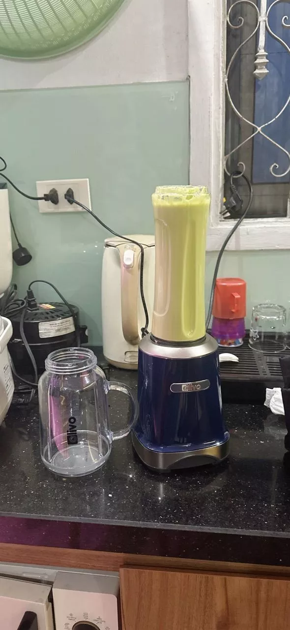 - Bộ sản phẩm bao gồm: thân máy, 2 cốc xay, 1 nắp xay có lưỡi dao, 1 nắp bình bảo quản, 1 nắp có khe cắm ống hút.