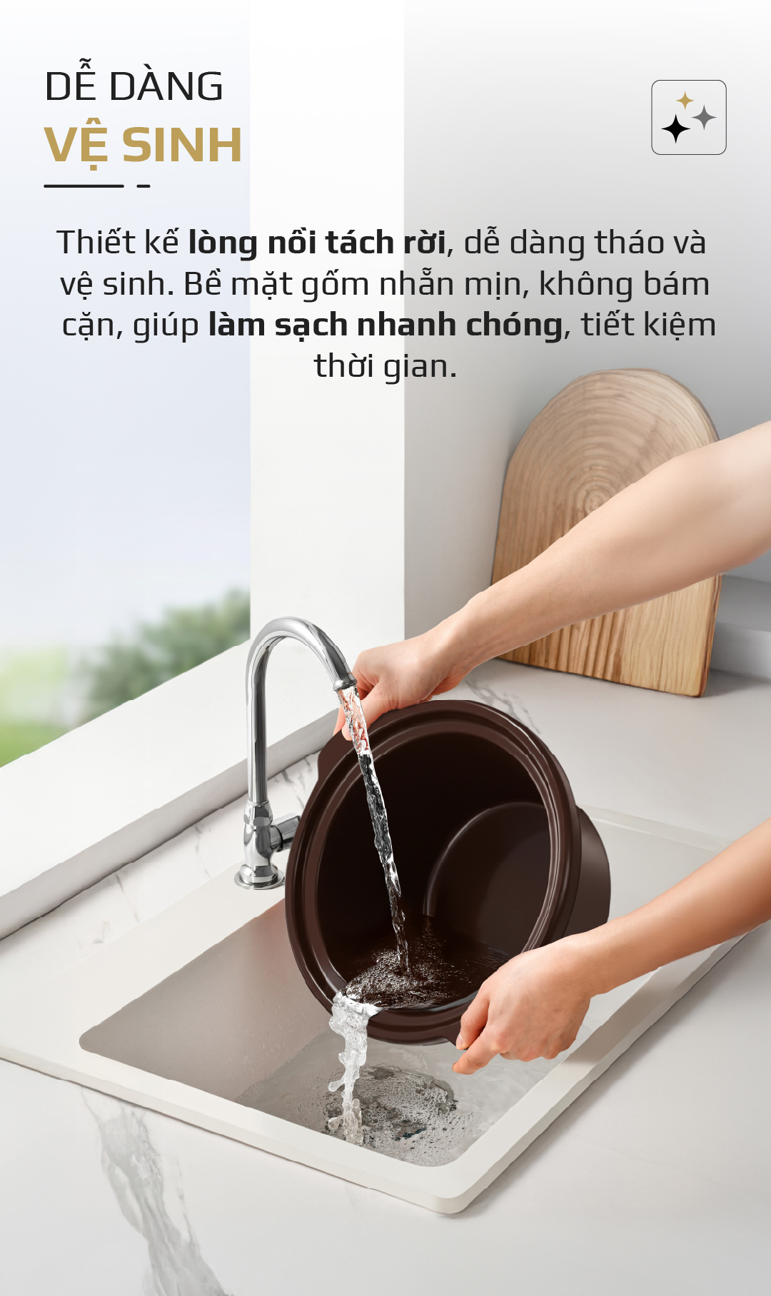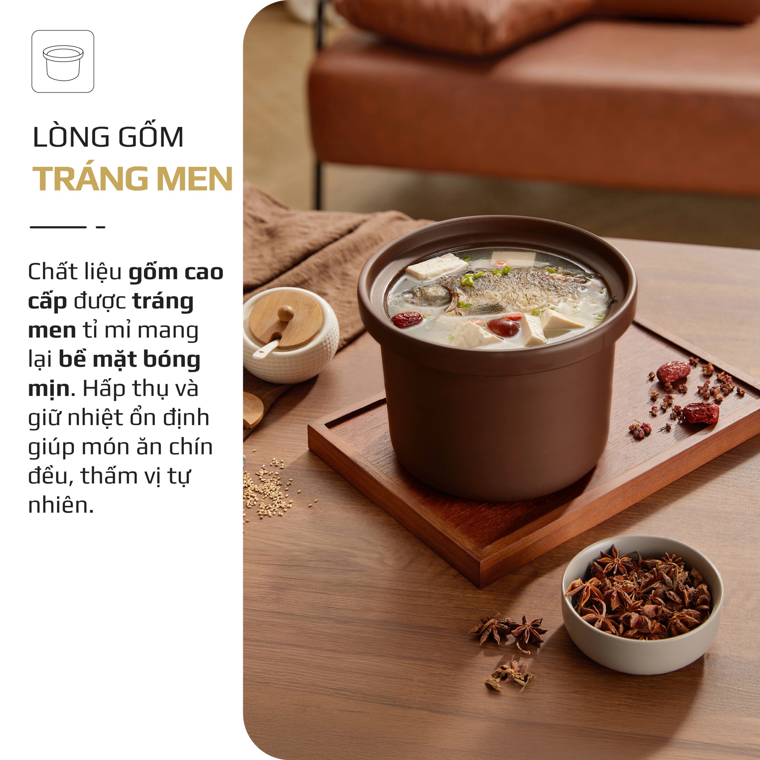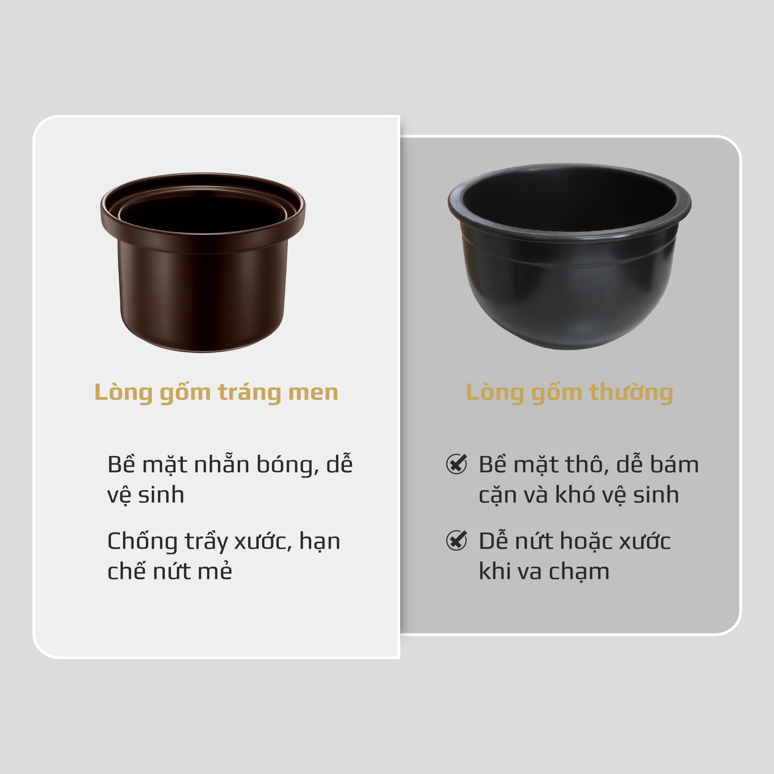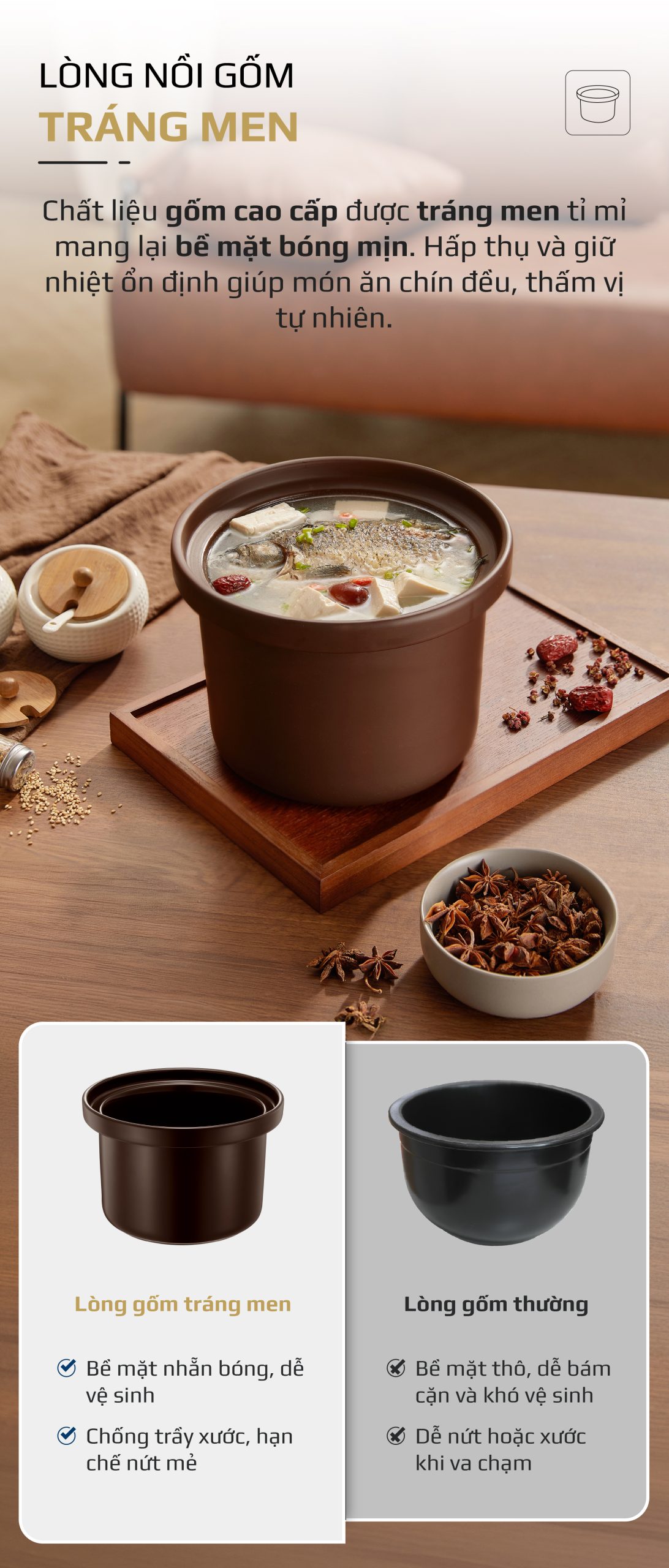 - Lòng nồi gốm cao cấp tráng men bóng mịn giúp hạn chế bám cặn, dễ vệ sinh và truyền nhiệt đều. Nhờ đó, món ăn chín kỹ từ trong ra ngoài, mềm sâu, giữ nguyên hương vị tự nhiên và dưỡng chất quan trọng.