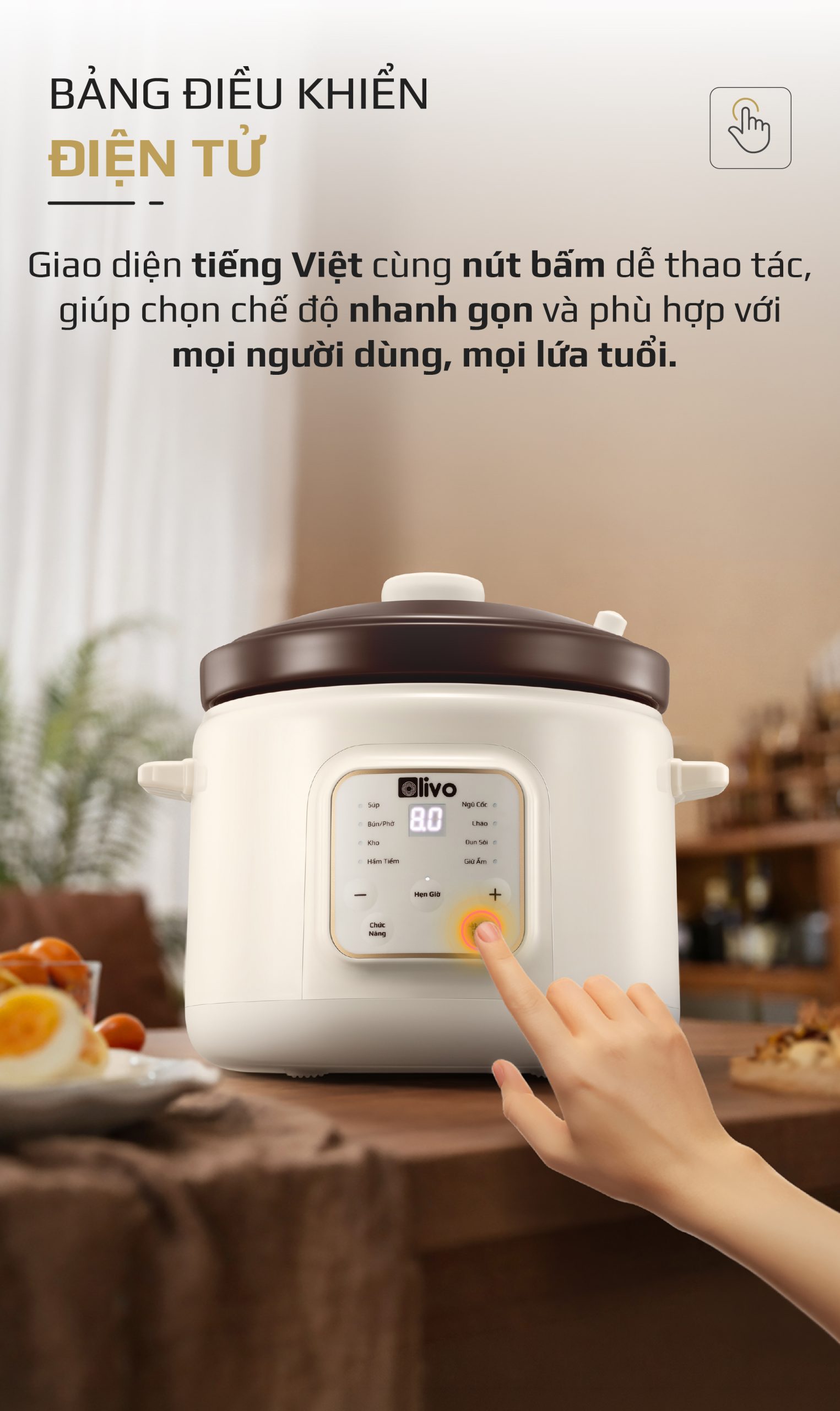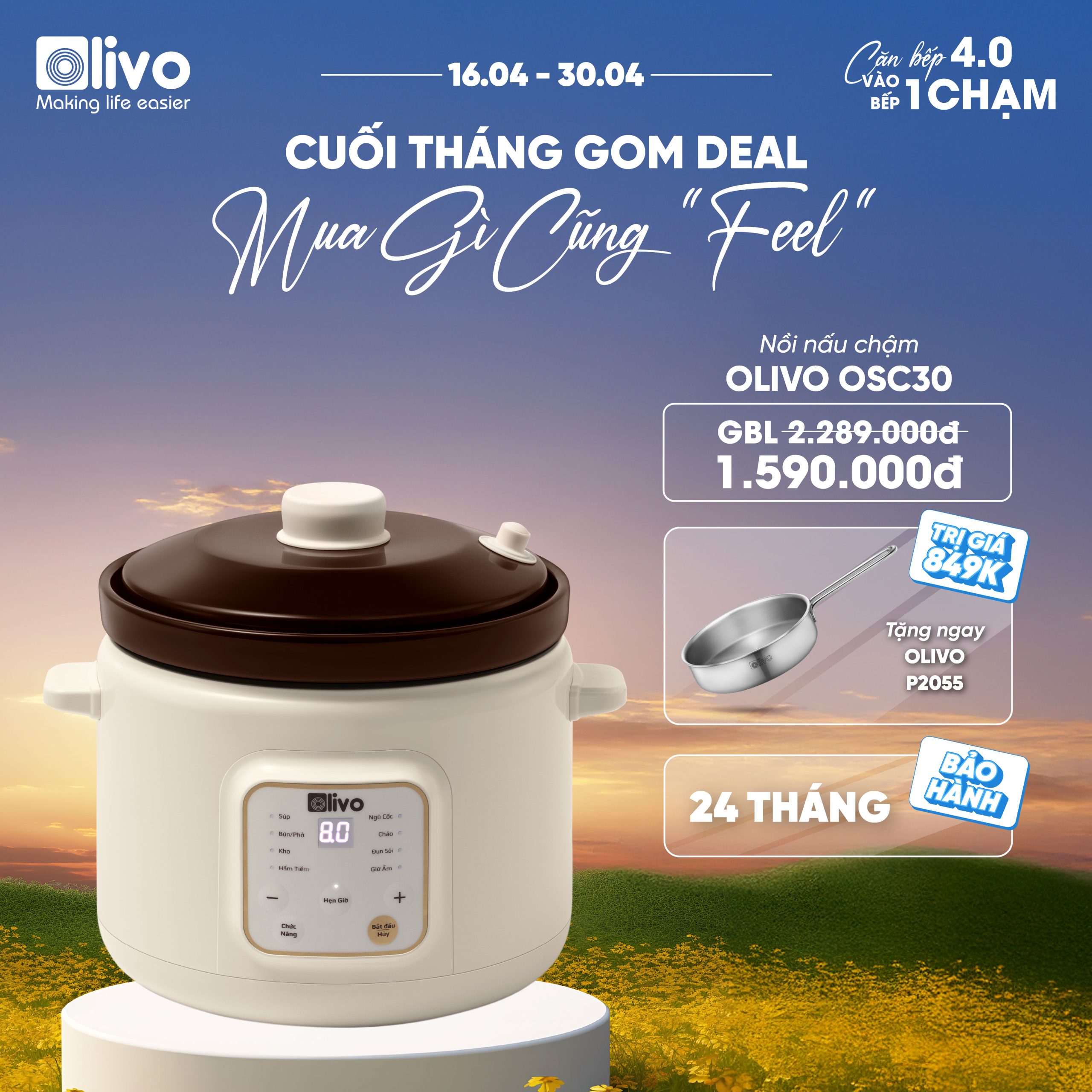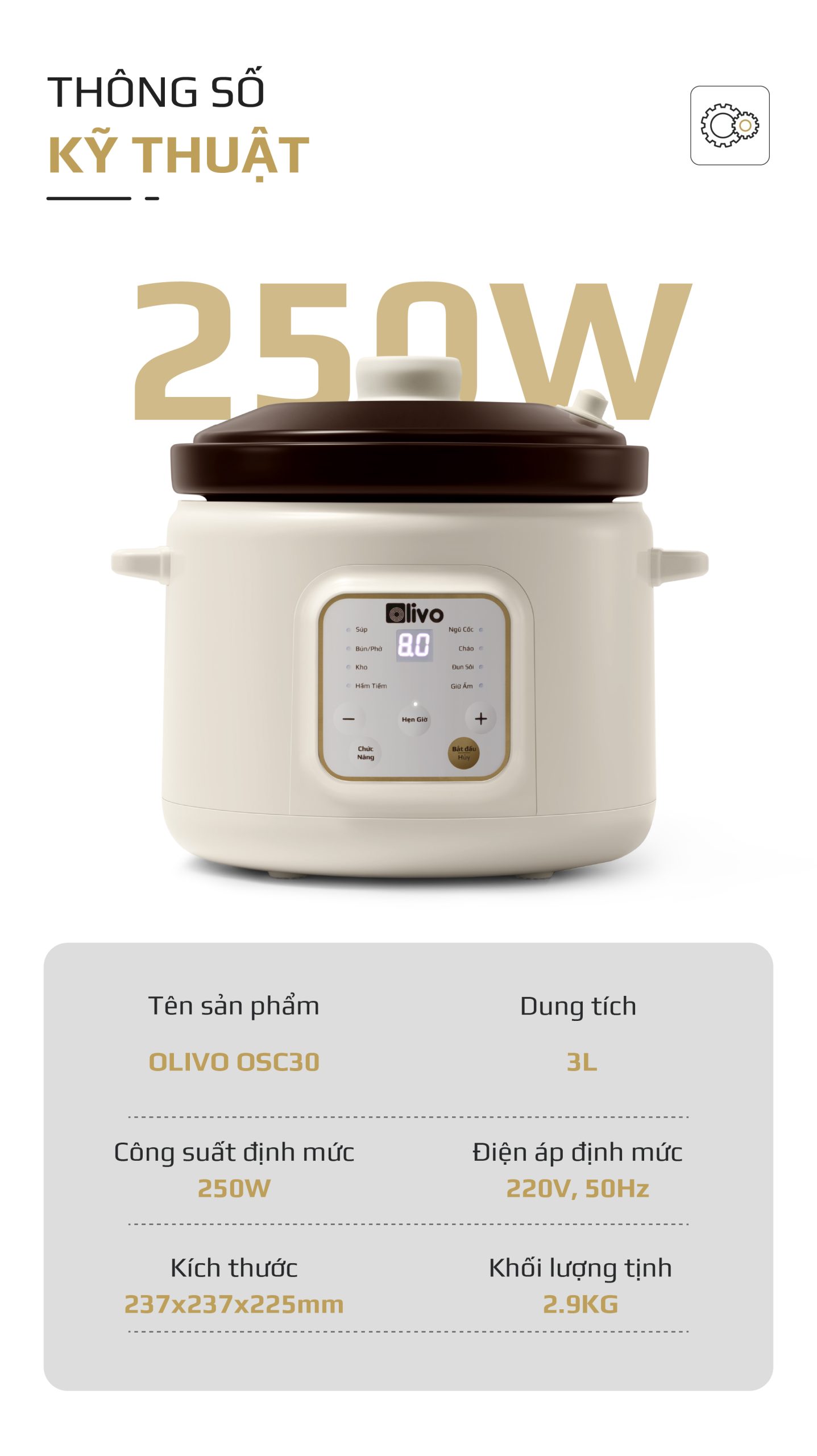 - OLIVO OSC30 không chỉ là một chiếc nồi nấu chậm, mà là trợ lý bếp núc thông minh giúp bạn chuẩn bị những bữa ăn bổ dưỡng, tiết kiệm thời gian, giữ trọn yêu thương và sự an tâm cho cả gia đình.