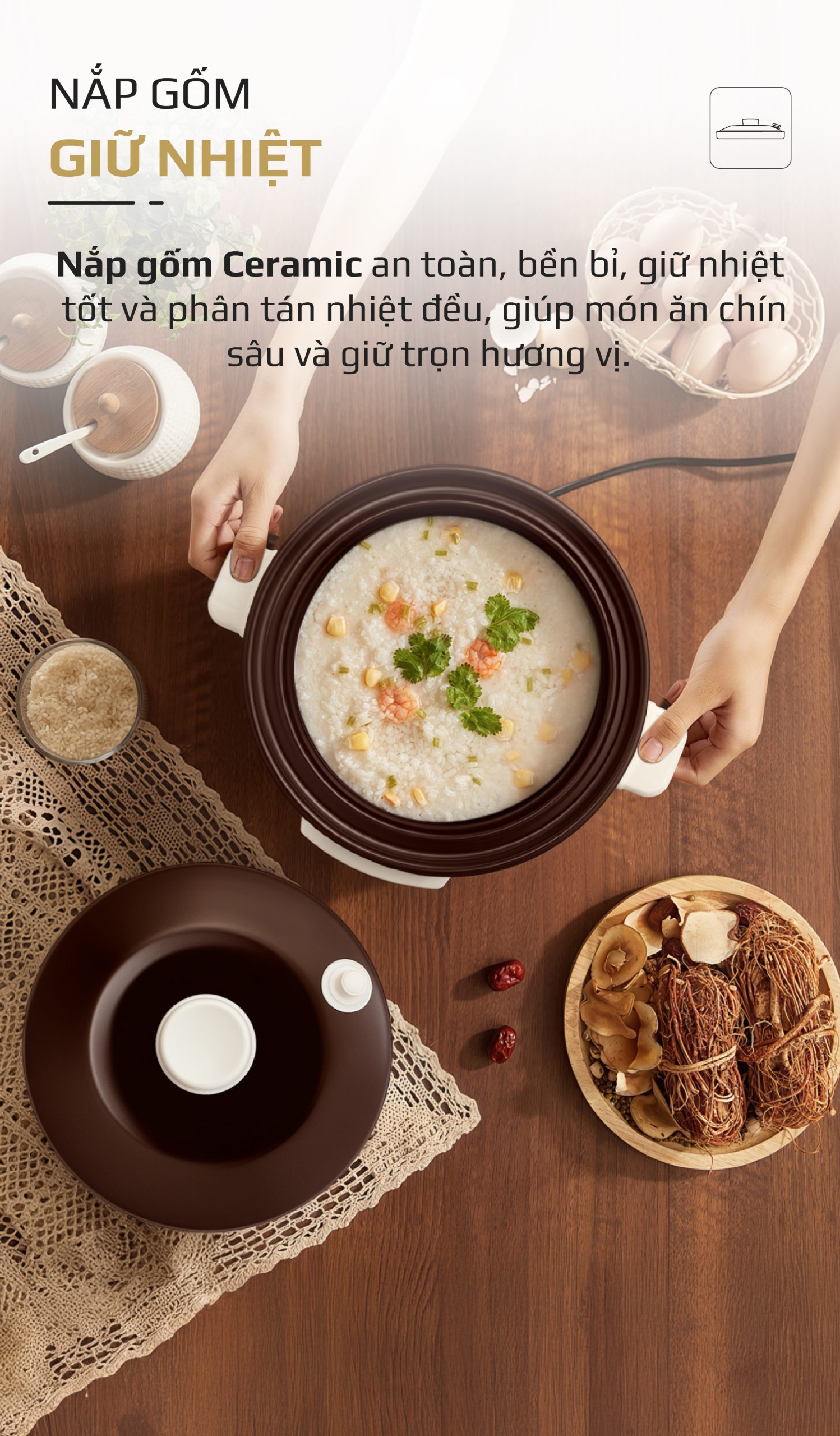 - Nắp gốm giúp giữ nhiệt ổn định và hạn chế thất thoát hơi nước trong quá trình nấu. Nhờ đó, thực phẩm chín mềm tự nhiên, thấm vị sâu, giữ được độ ngọt lành và cấu trúc nguyên bản.