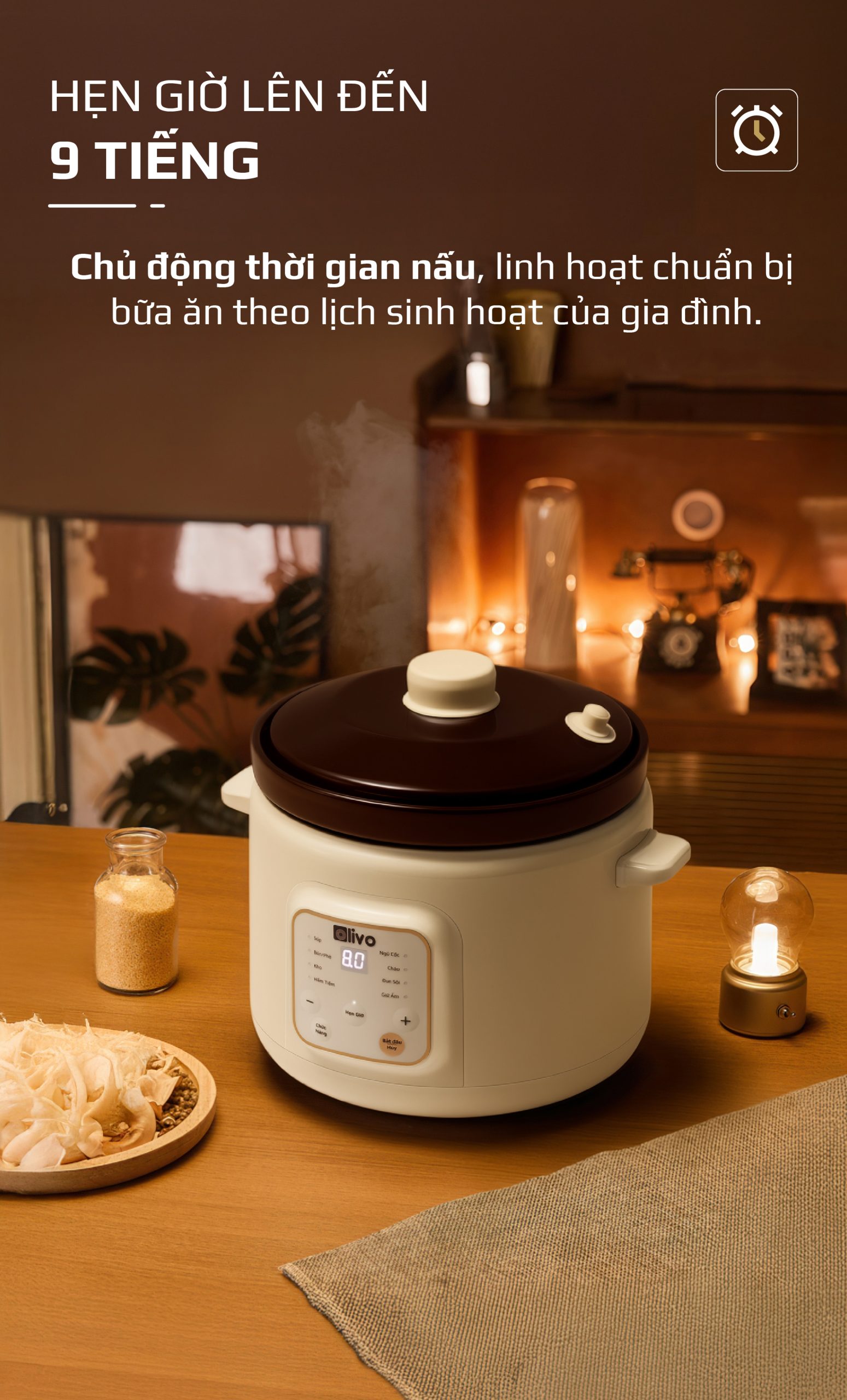 - Tính năng hẹn giờ linh hoạt lên đến 9 tiếng giúp bạn dễ dàng sắp xếp thời gian nấu ăn theo nhịp sống gia đình. Chuẩn bị nguyên liệu từ sáng, tối về là có ngay món hầm nóng hổi – tiện lợi, chủ động và cực kỳ phù hợp cho người bận rộn.