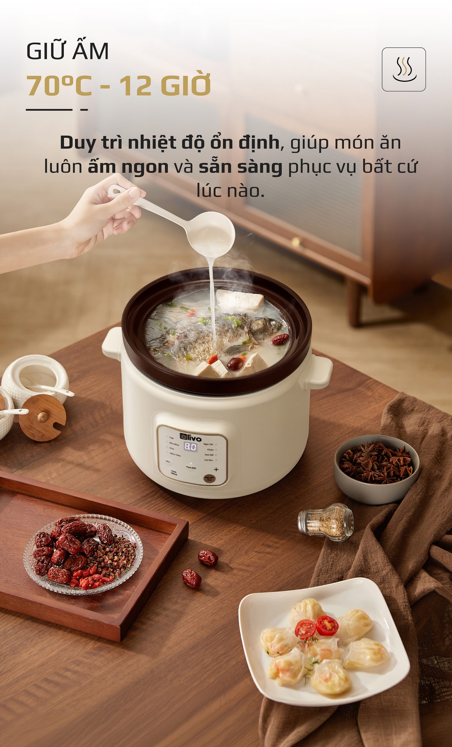 - Chế độ giữ ấm ở mức 70°C giúp món ăn luôn trong trạng thái ấm ngon, sẵn sàng phục vụ bất cứ lúc nào. Thực phẩm không bị nguội, không bị quá nhiệt, đảm bảo hương vị và chất lượng trong suốt nhiều giờ liền.