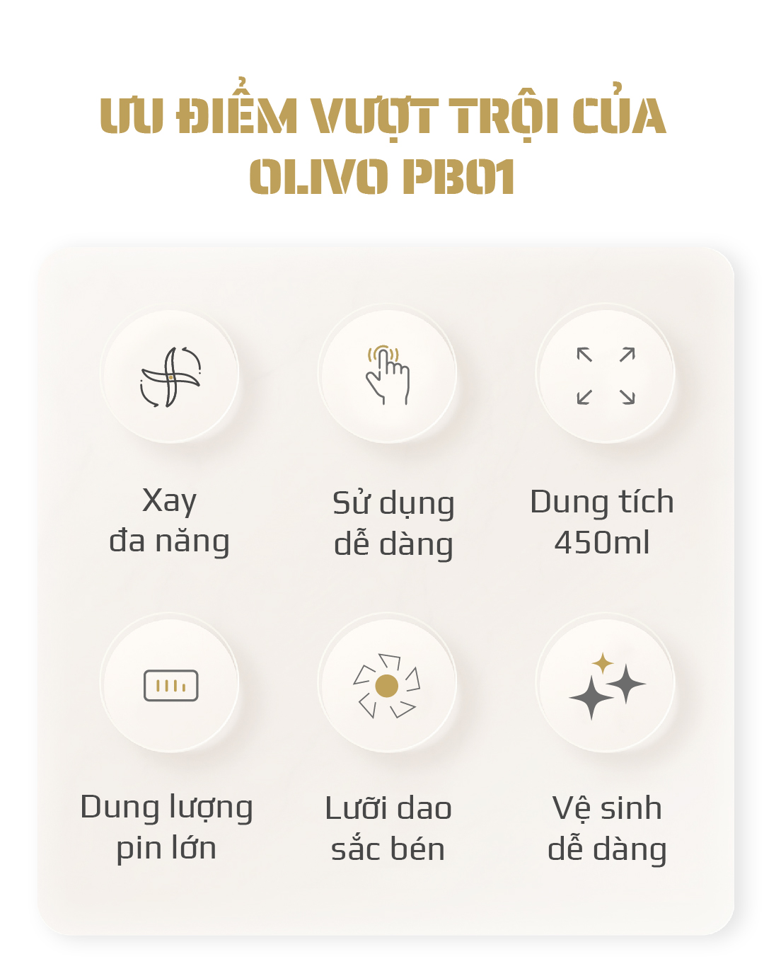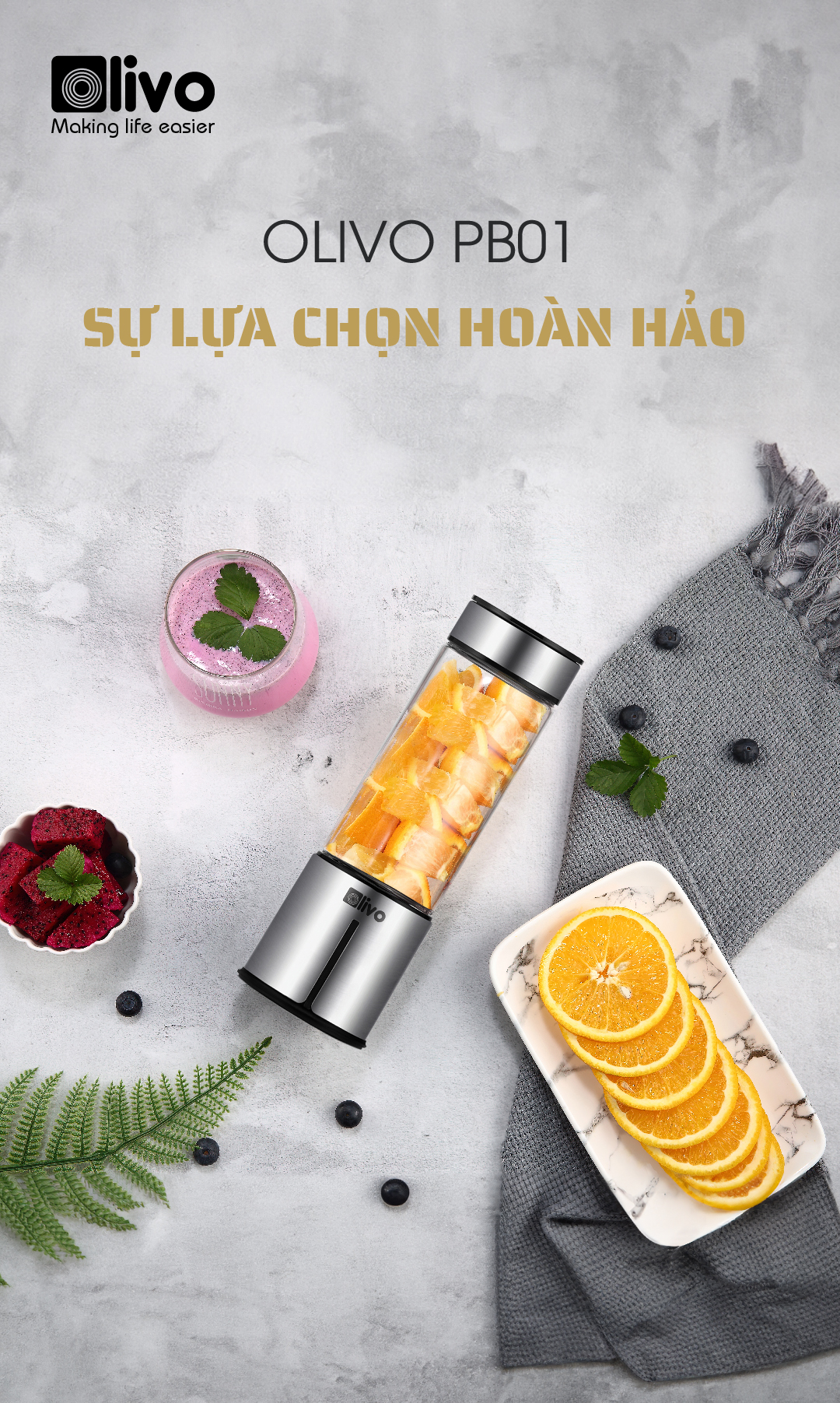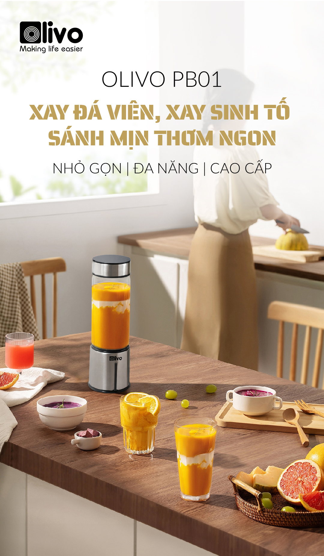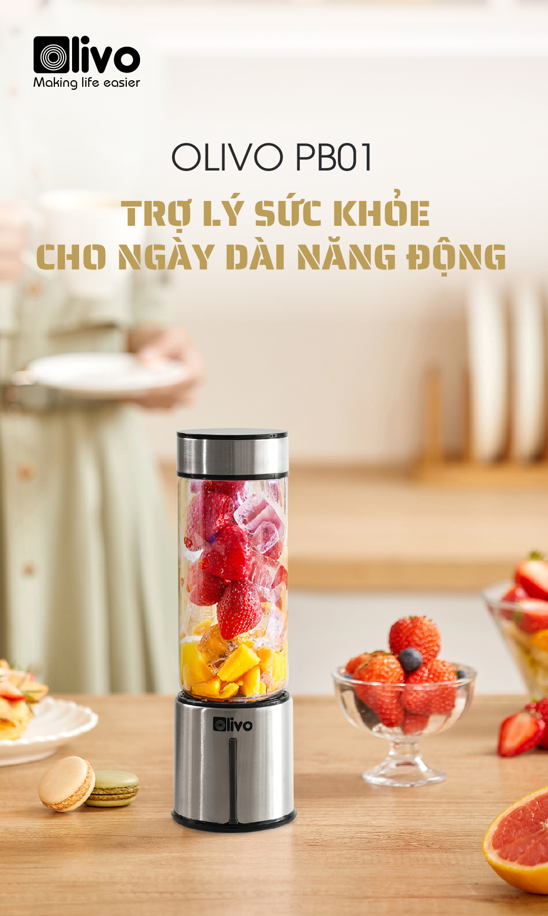- Xay sinh tố, smoothie… là chức năng chính của sản phẩm. Bổ sung rau củ quả tươi mỗi ngày sẽ giúp tăng sức đề kháng cho cơ thể, giữ gìn vóc dáng, đẹp da. OLIVO PB01 có khả năng xay nhuyễn mịn nguyên liệu chỉ trong 30s, thiết kế lại vô cùng nhỏ gọn rất thích hợp để sử dụng hàng ngày.