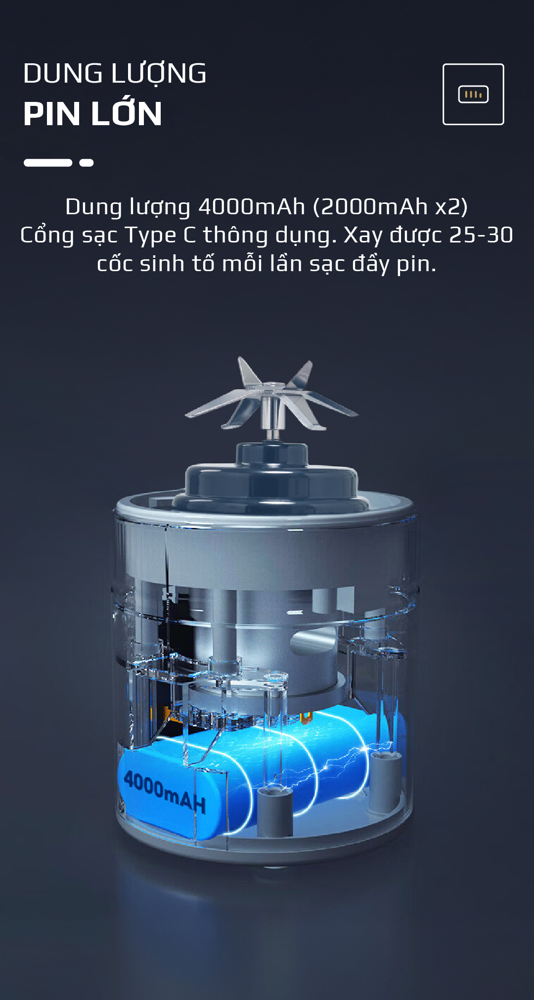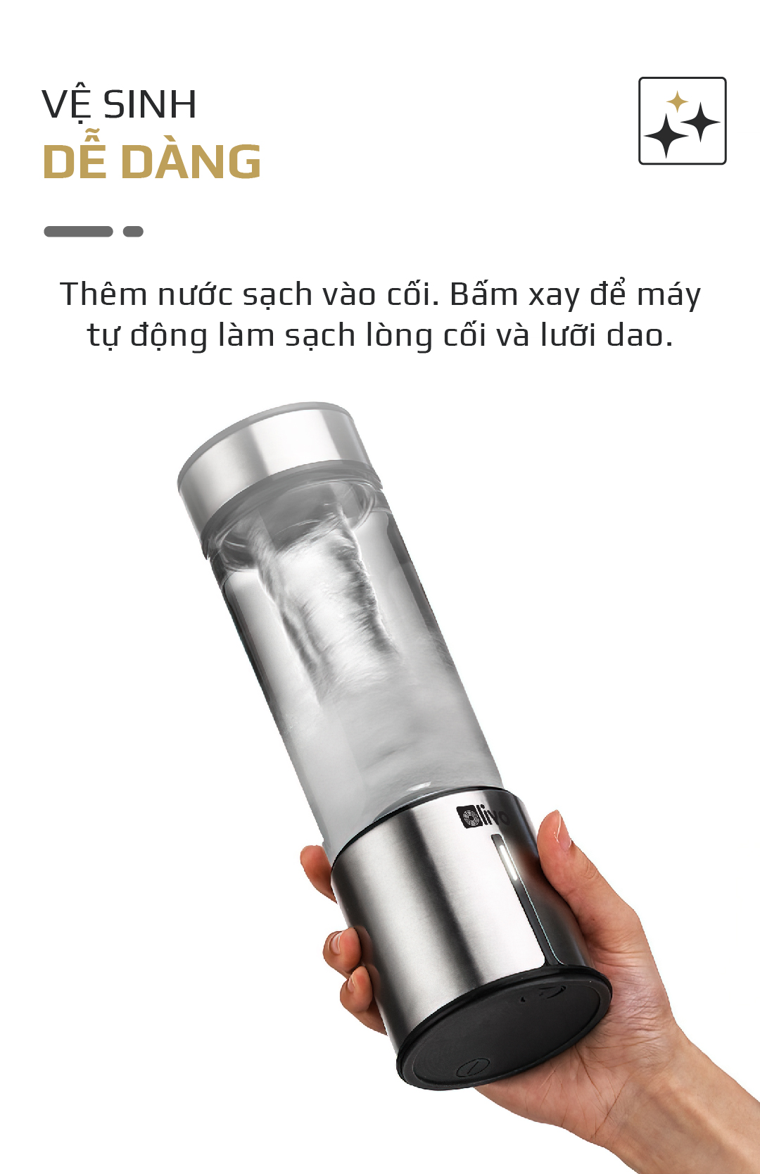 - Điều đáng chú ý là sản phẩm này dùng pin sạc, có thể linh động sử dụng ở mọi nơi mà không cần cắm điện. Dung tích vừa phải, xay được nhuyễn và mịn hoa quả, rau củ chỉ trong 30s. Thao tác sử dụng dễ dàng giúp đem lại trải nghiệm tuyệt vời cho người dùng.