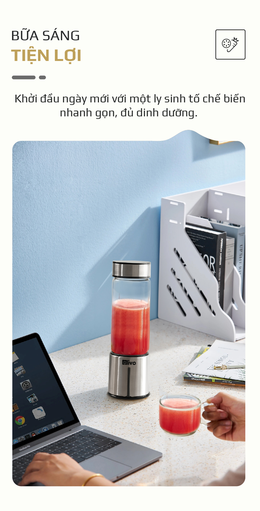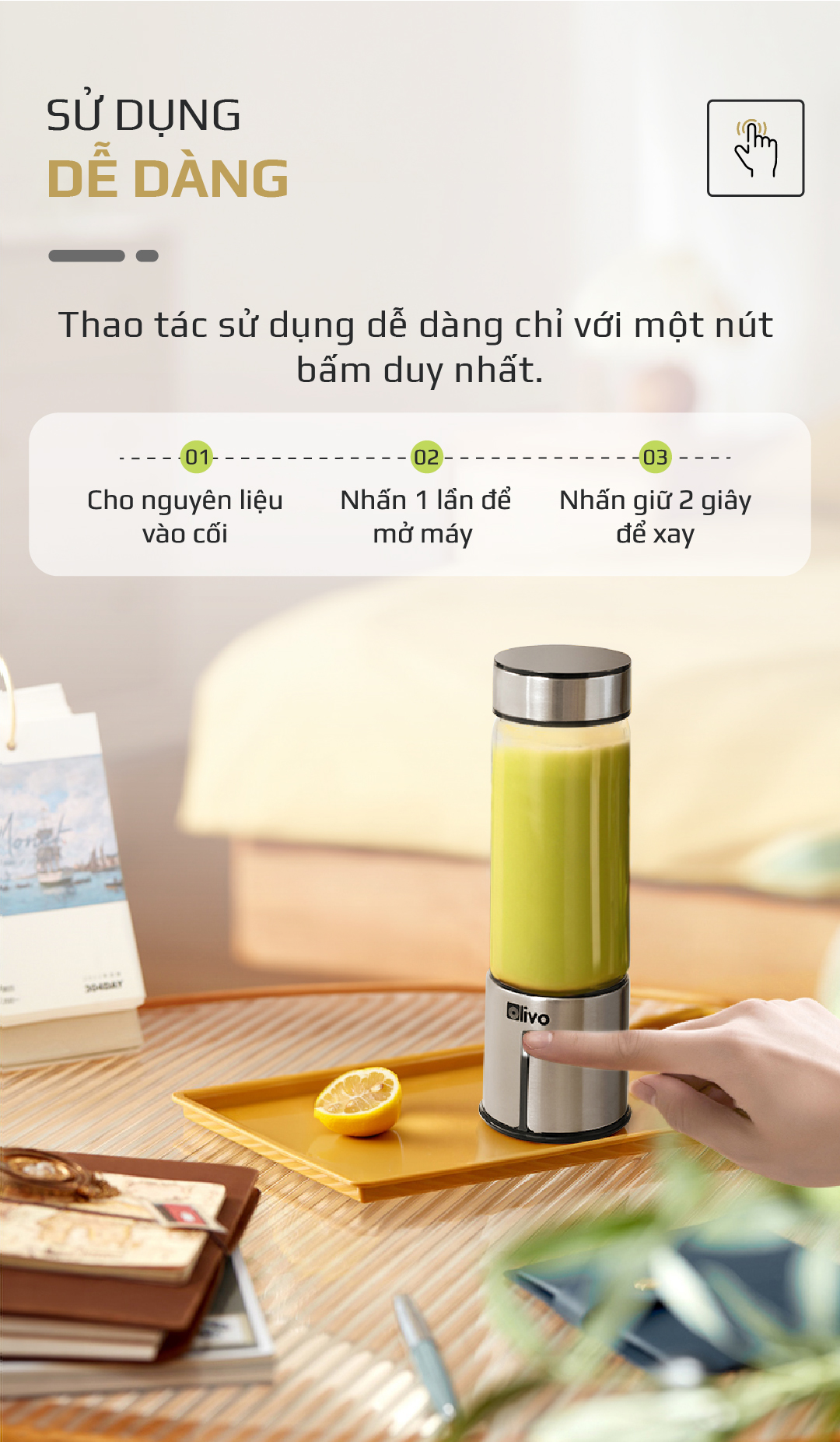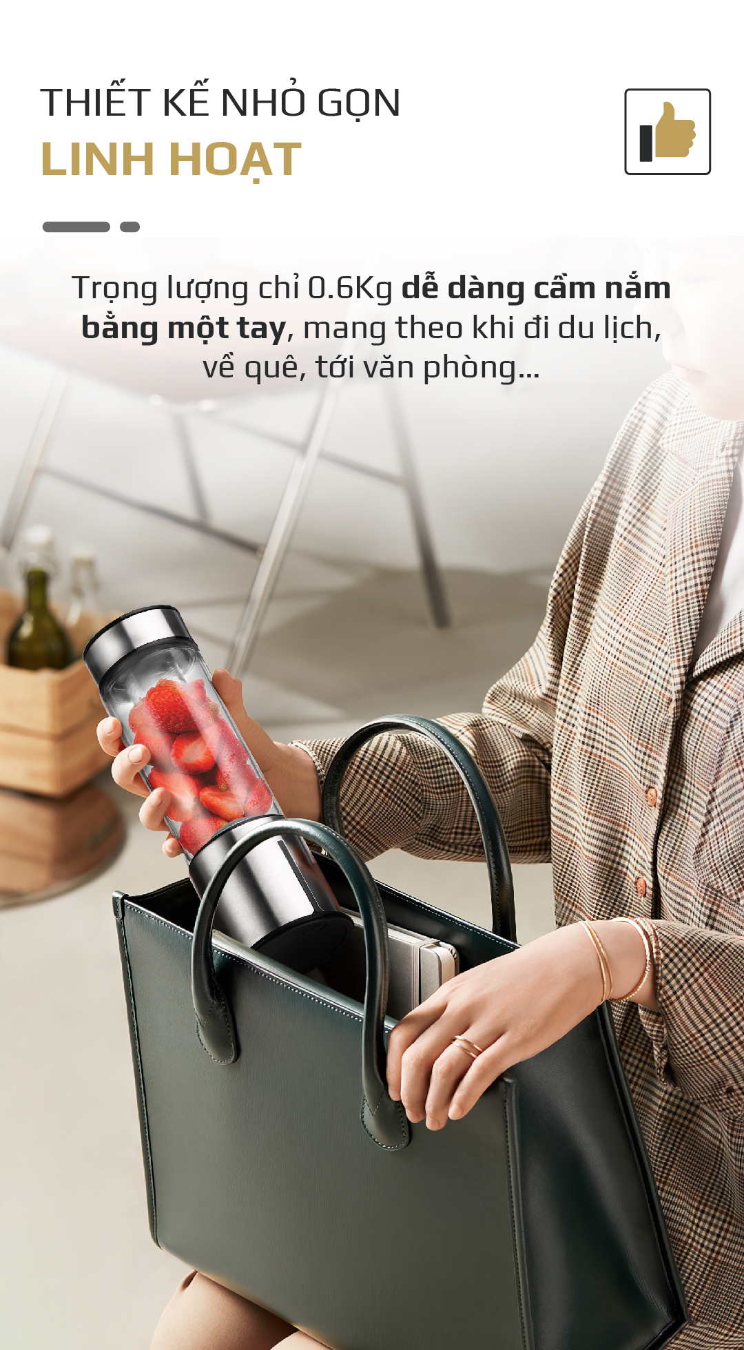 - Sản phẩm có thiết kế nhỏ gọn, nhẹ, đẹp mắt rất tiện lợi bỏ túi mang theo đi du lịch, đi làm, về quê, đi công tác… Để có thể xay và uống sinh tố tươi ngon mọi lúc mọi nơi.