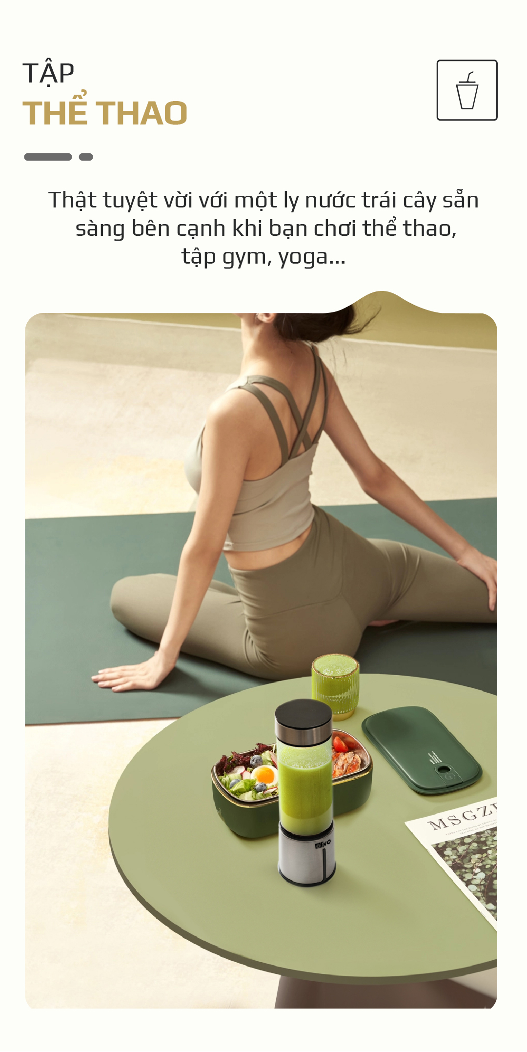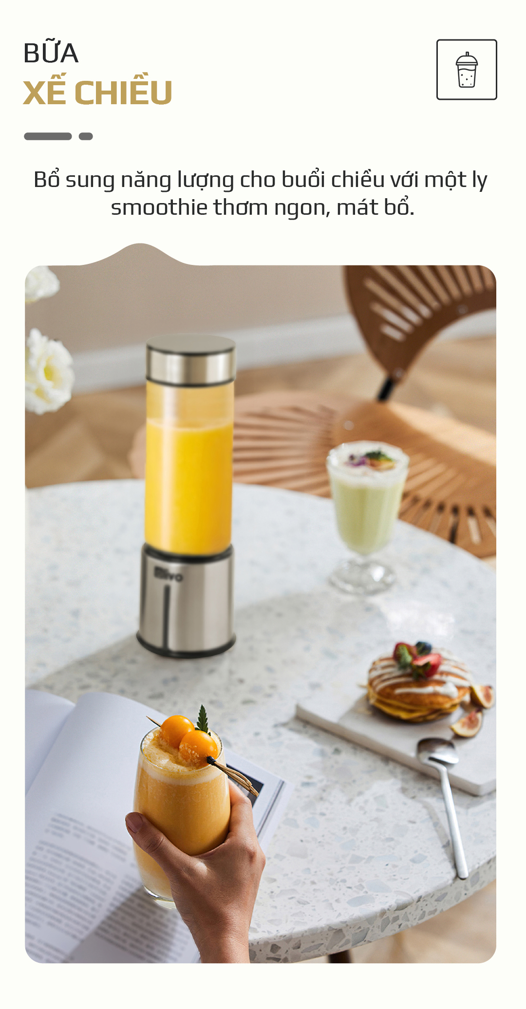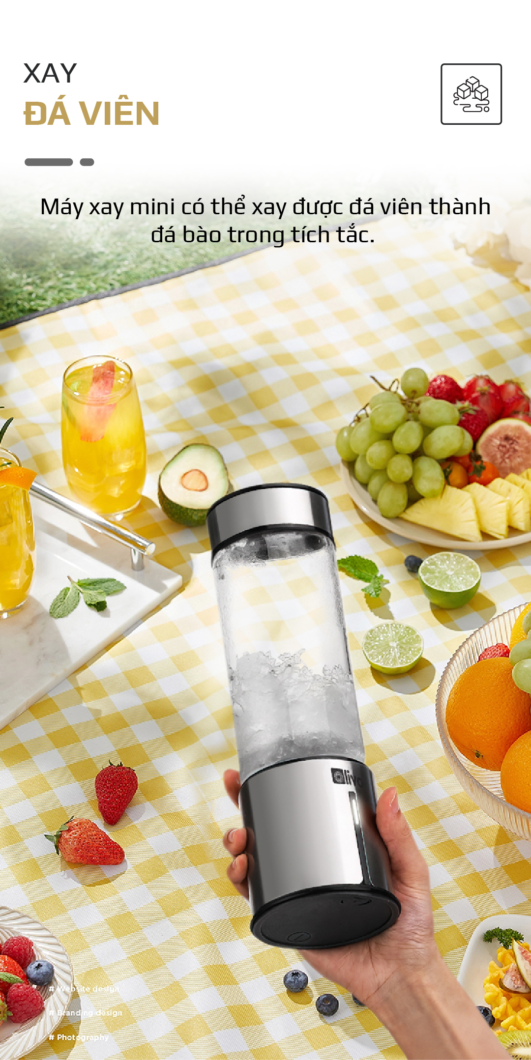 - Sản phẩm có thiết kế nhỏ gọn, nhẹ, đẹp mắt rất tiện lợi bỏ túi mang theo đi du lịch, đi làm, về quê, đi công tác… Để có thể xay và uống sinh tố tươi ngon mọi lúc mọi nơi.