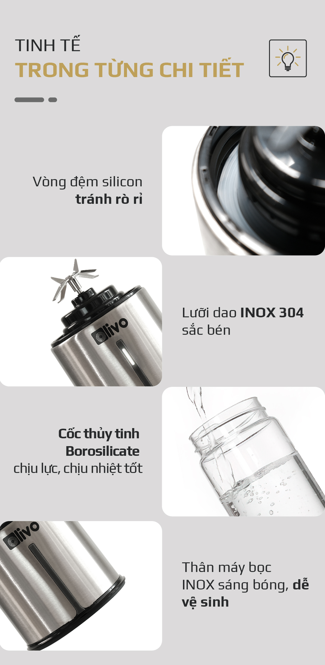 - Lưỡi dao là một chi tiết rất quan trọng của máy, quyết định độ nhuyễn mịn của thành phẩm. OLIVO PB01 sở hữu lưỡi dao 6 cánh 3 tầng sắc bén bằng chất liệu INOX 304 cứng cáp, chống gỉ, an toàn khi tiếp xúc với thực phẩm. Đem lại hiệu quả xay mịn hơn, nhanh chóng hơn.
