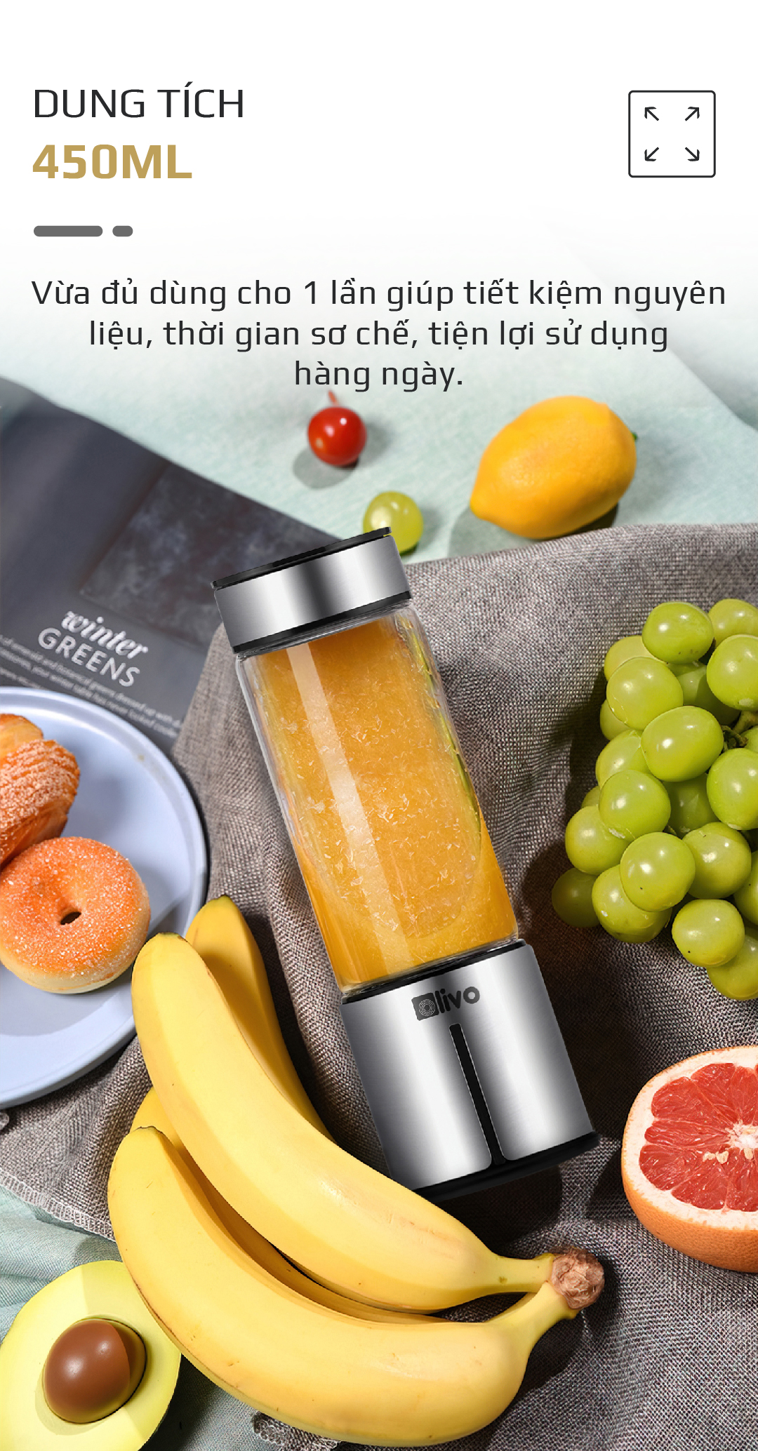 - Với dung tích 450ML đủ cho 1 – 2 người sử dụng trong 1 lần. Giúp bạn tiết kiệm được nguyên liệu, thời gian chuẩn bị. Đảm bảo lúc nào cũng được uống sinh tố tươi ngon nhất.