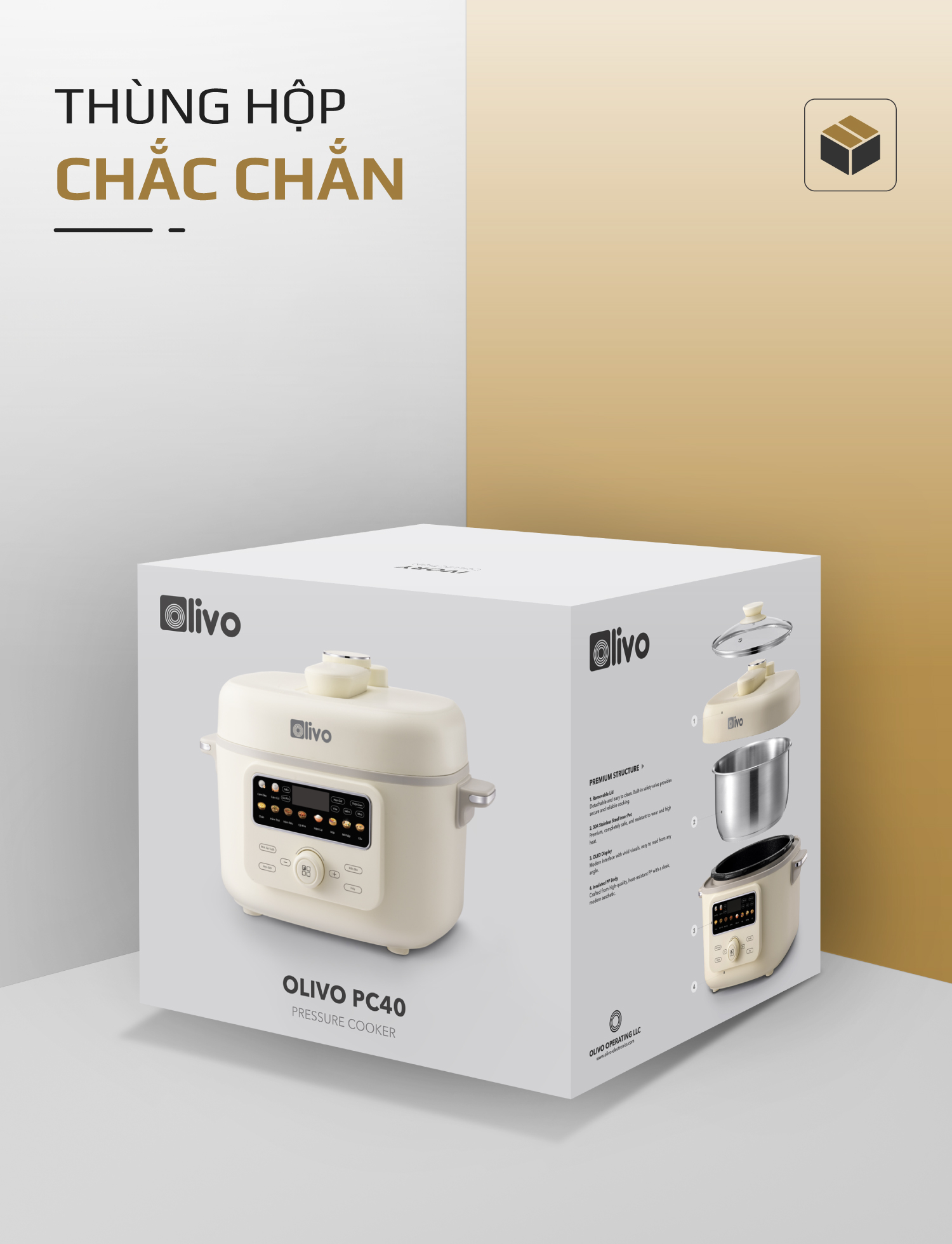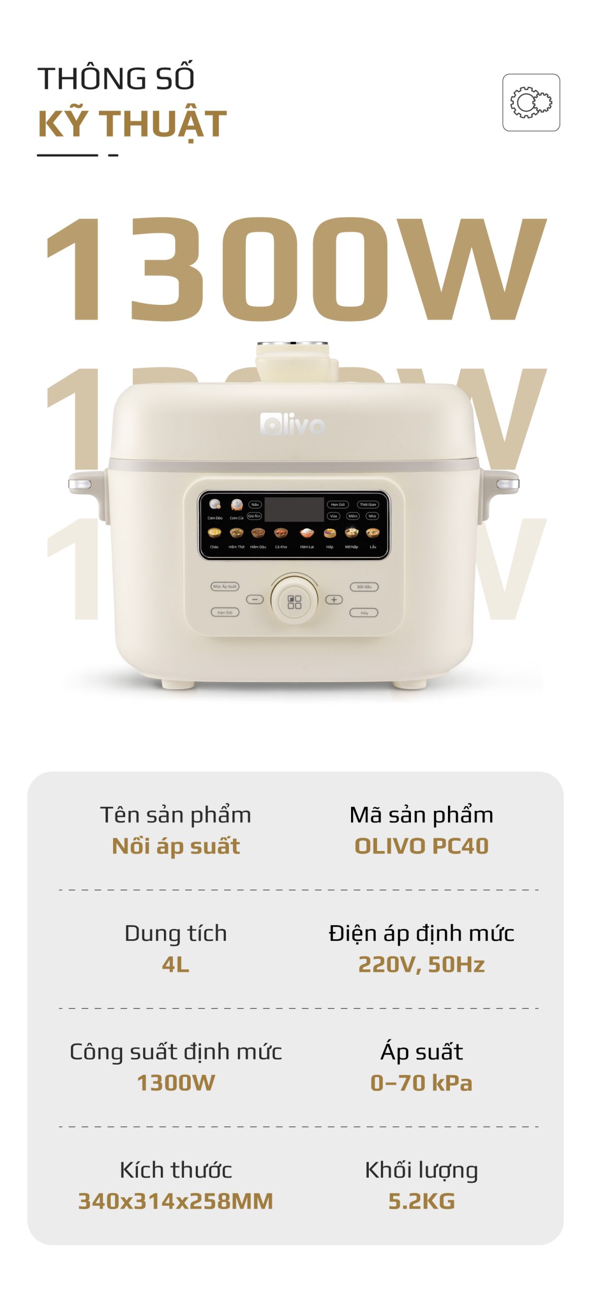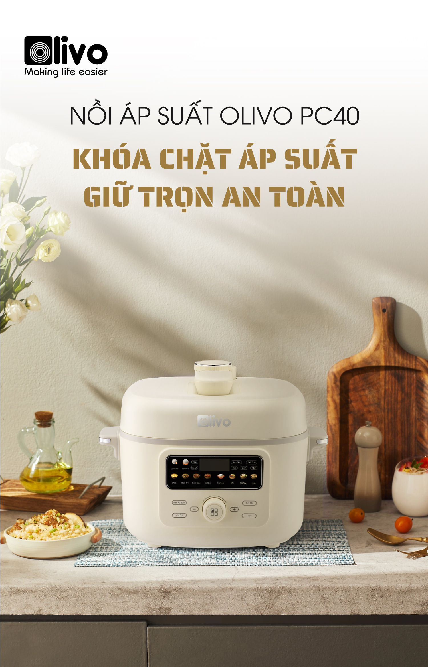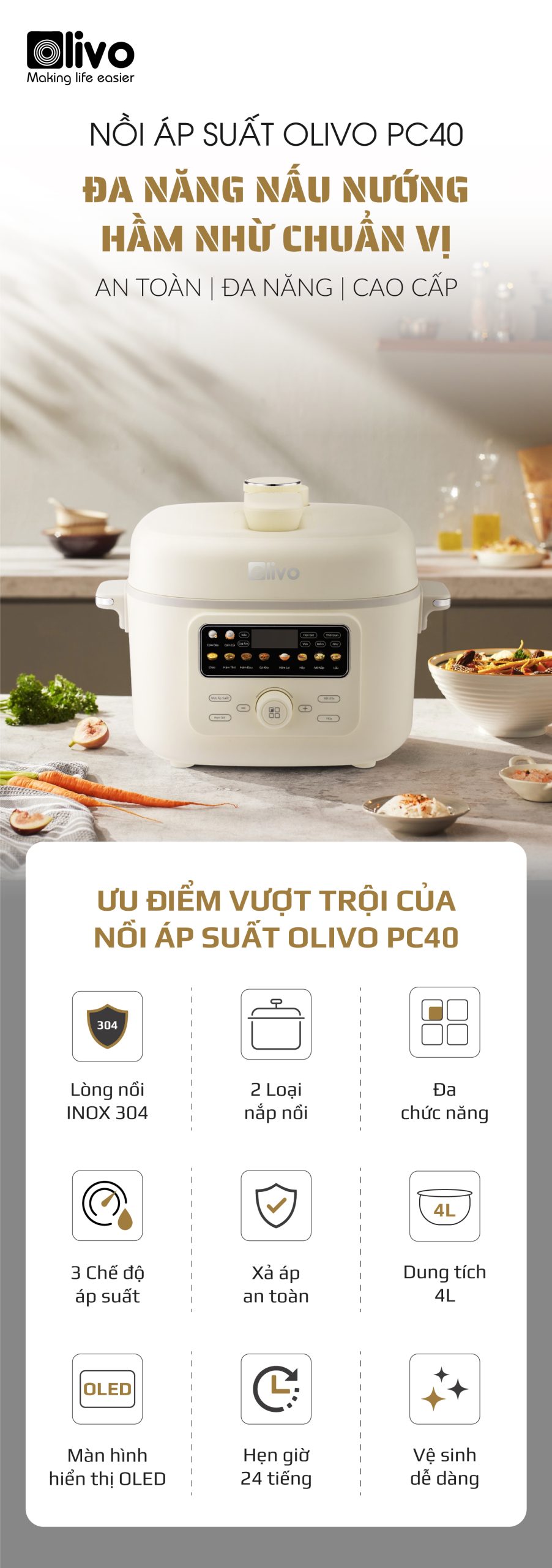 - Thấu hiểu nhu cầu đó, OLIVO trân trọng giới thiệu Nồi áp suất điện OLIVO PC40 – sản phẩm hội tụ giữa công nghệ áp suất thông minh, thiết kế cao cấp và tính năng đa năng, mang đến trải nghiệm nấu ăn tiện nghi, linh hoạt và an tâm cho mọi gia đình.