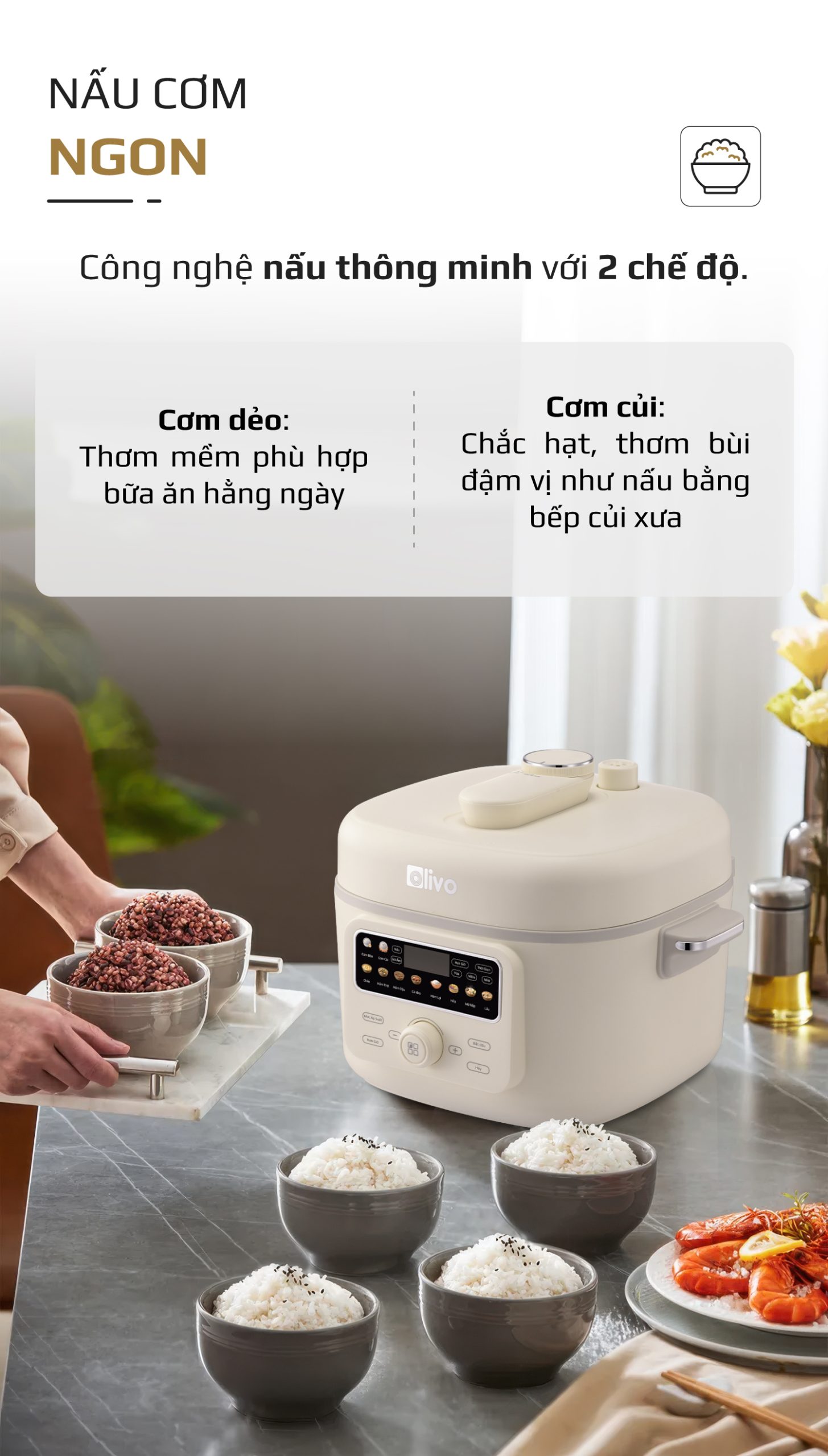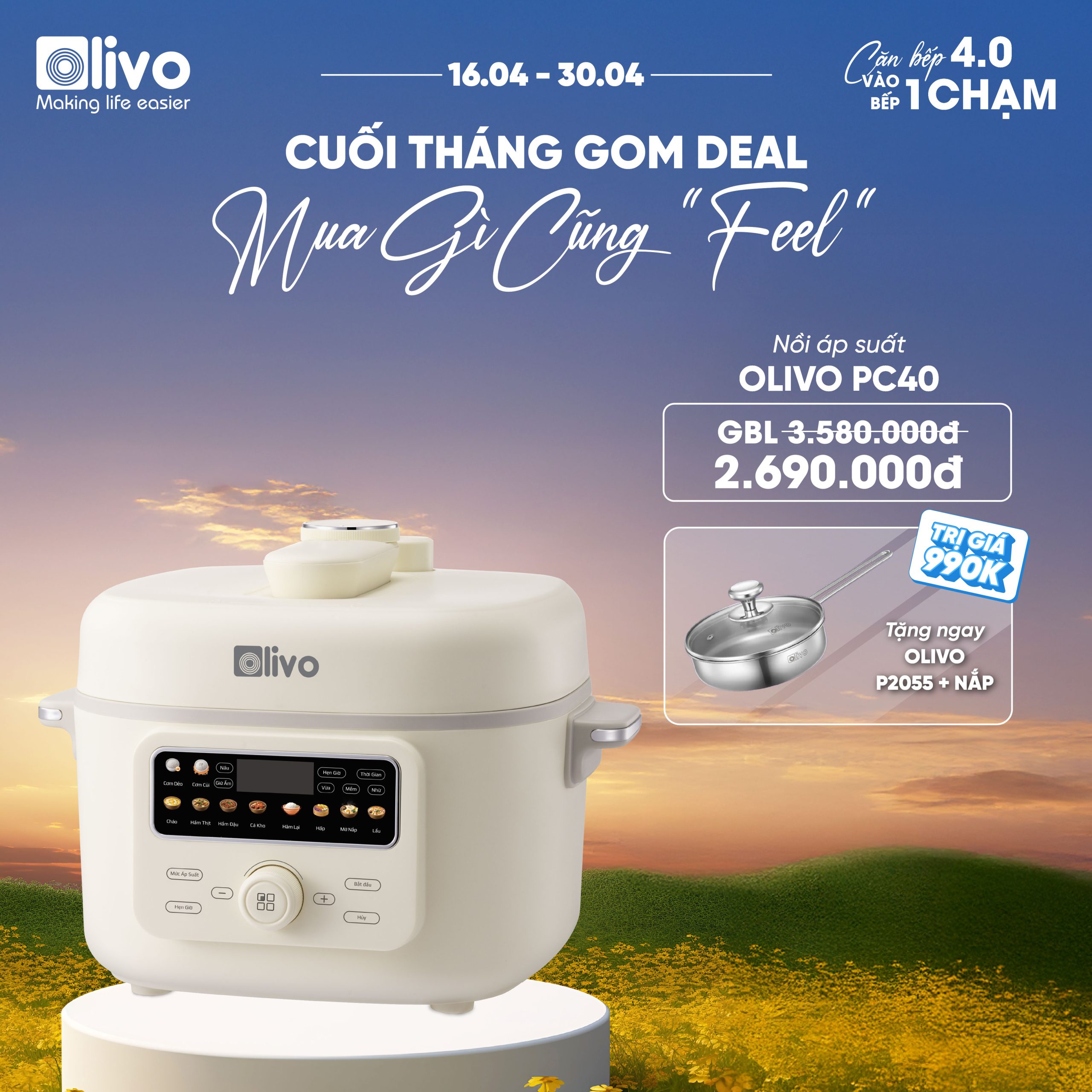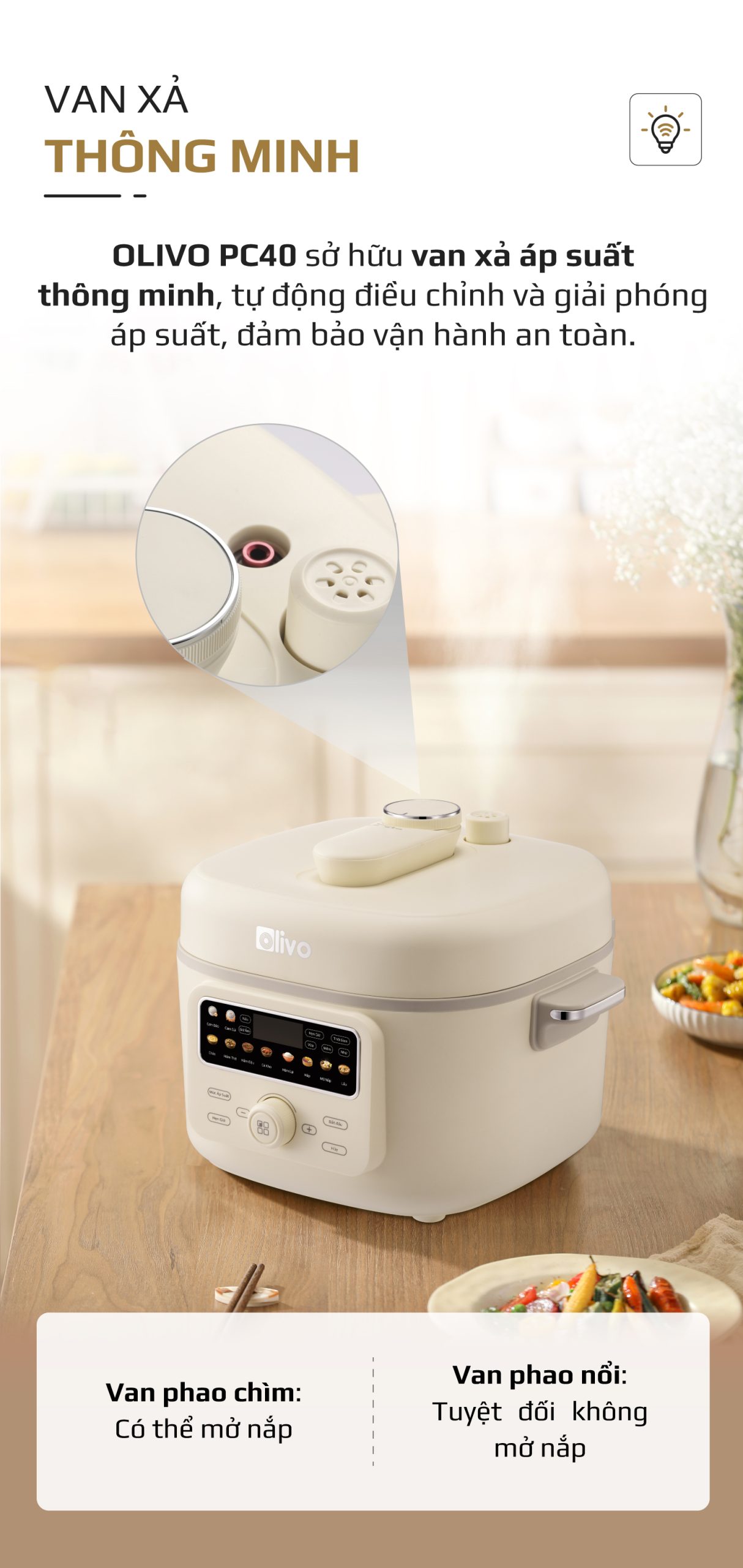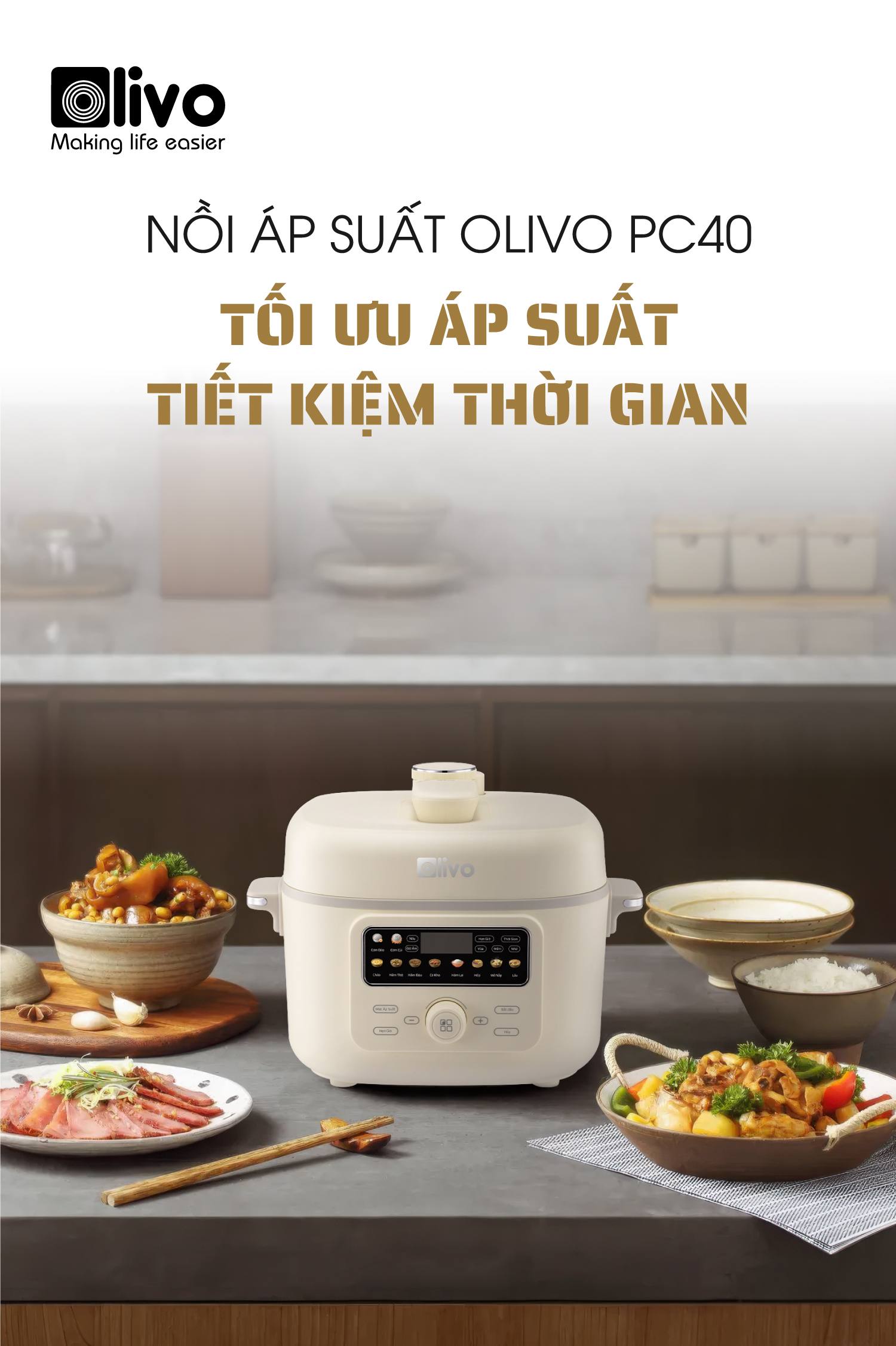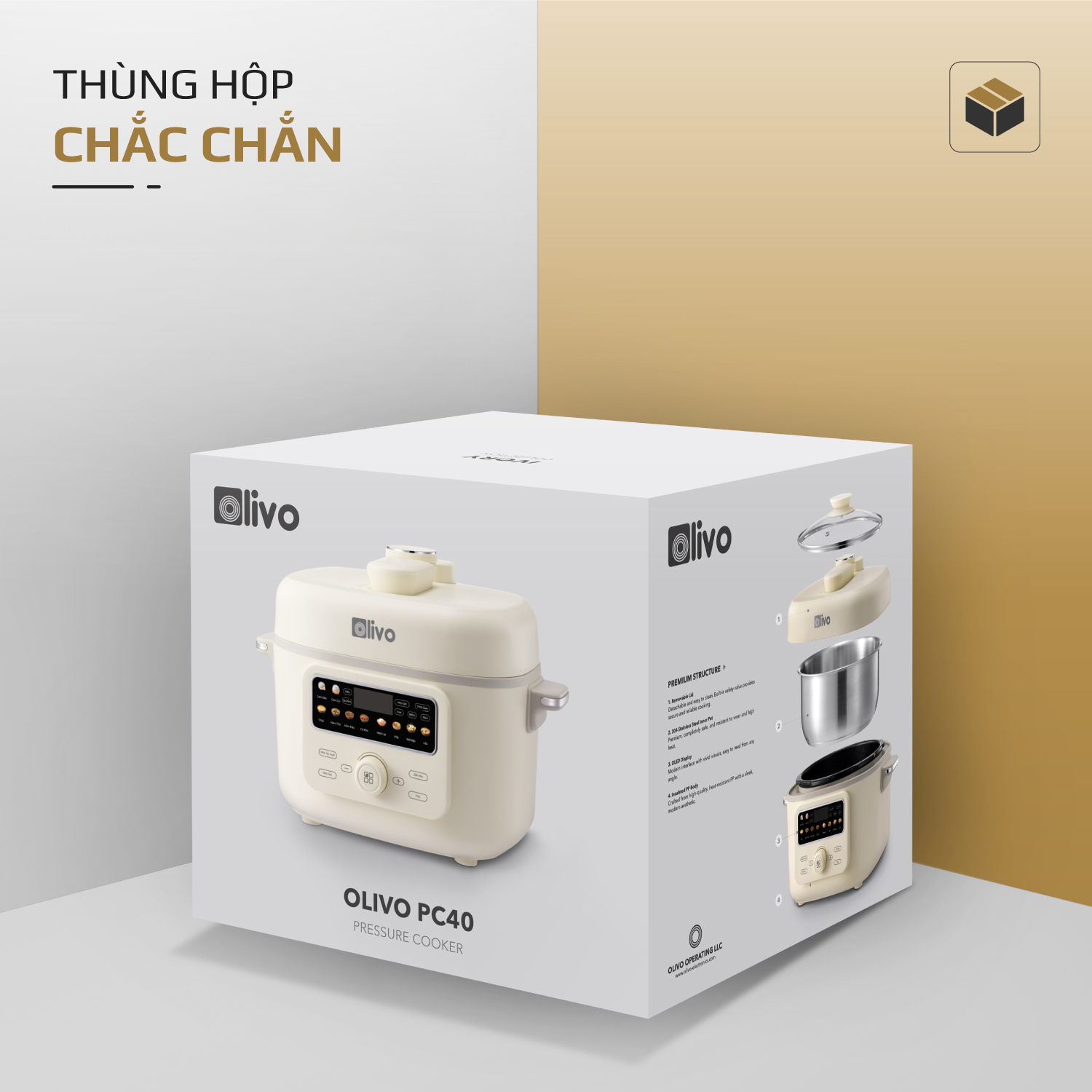 - Thấu hiểu nhu cầu đó, OLIVO trân trọng giới thiệu Nồi áp suất điện OLIVO PC40 – sản phẩm hội tụ giữa công nghệ áp suất thông minh, thiết kế cao cấp và tính năng đa năng, mang đến trải nghiệm nấu ăn tiện nghi, linh hoạt và an tâm cho mọi gia đình.