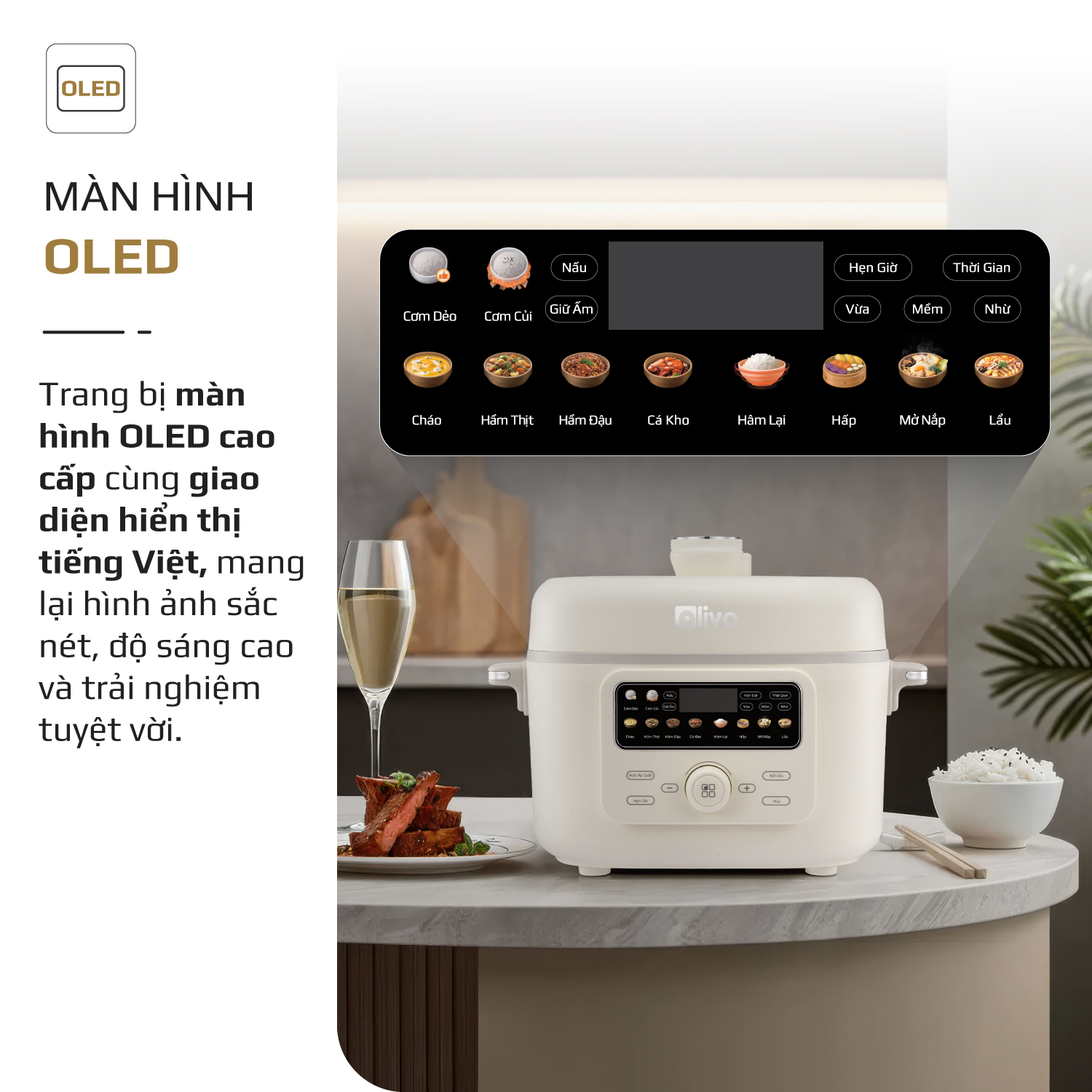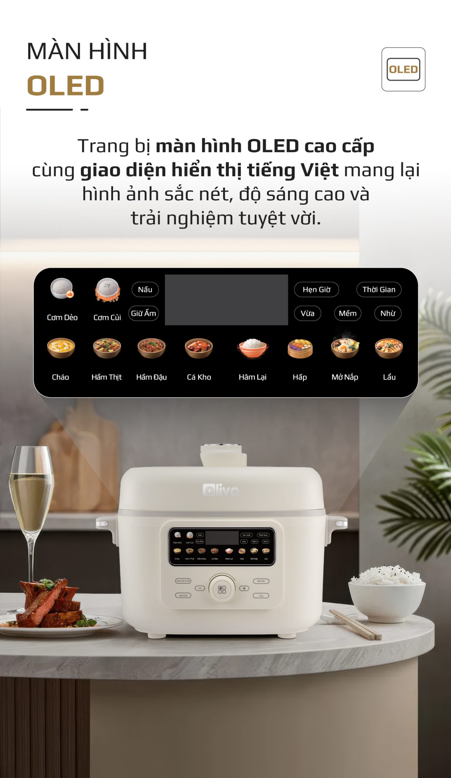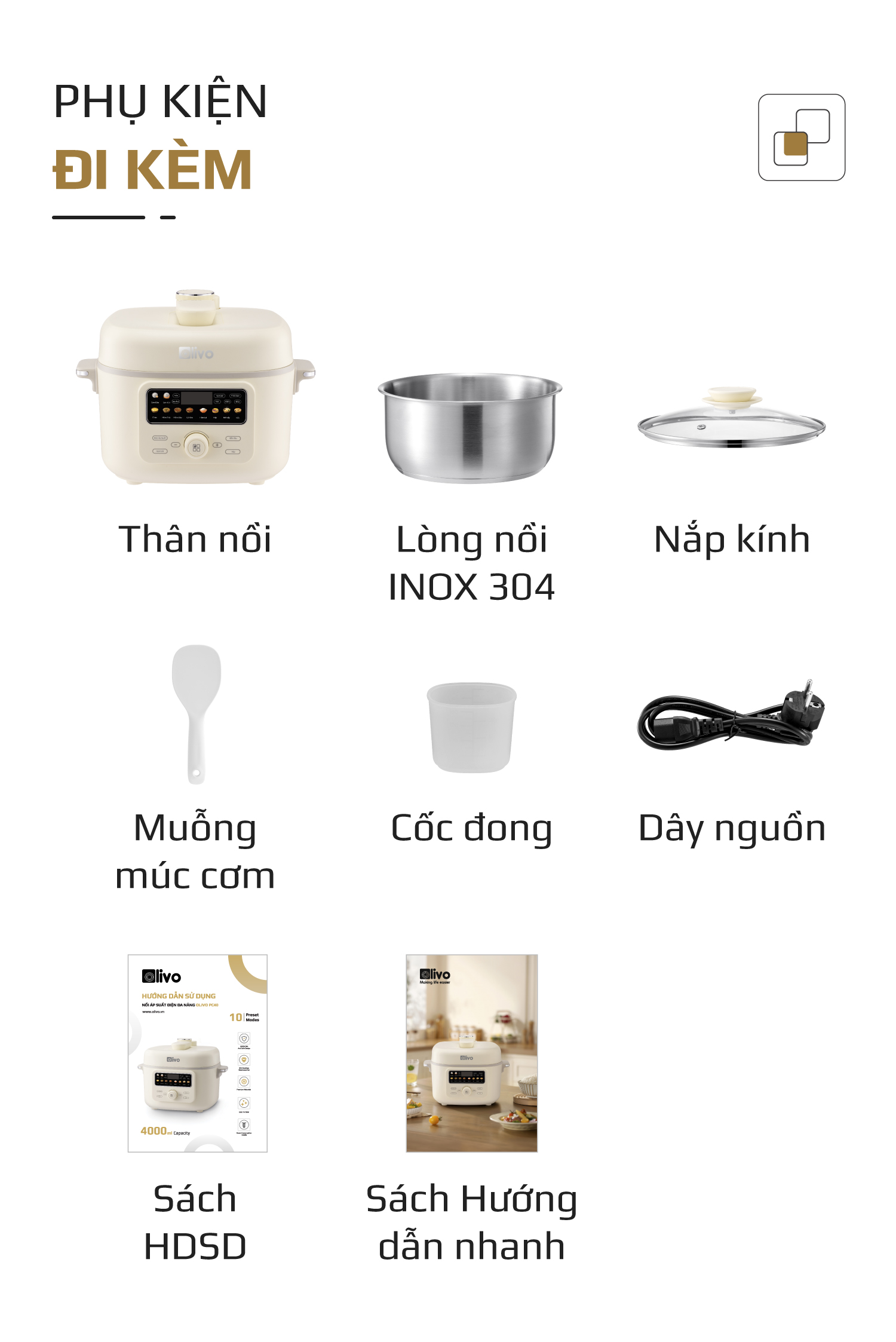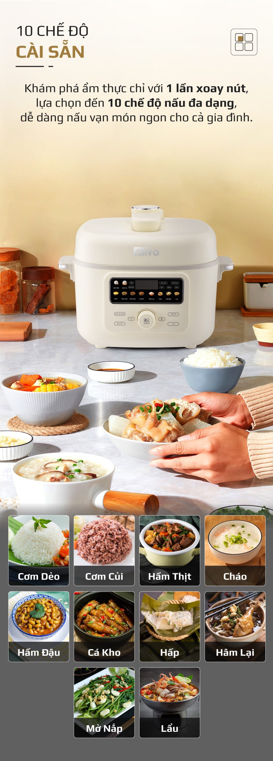- Thấu hiểu nhu cầu đó, OLIVO trân trọng giới thiệu Nồi áp suất điện OLIVO PC40 – sản phẩm hội tụ giữa công nghệ áp suất thông minh, thiết kế cao cấp và tính năng đa năng, mang đến trải nghiệm nấu ăn tiện nghi, linh hoạt và an tâm cho mọi gia đình.