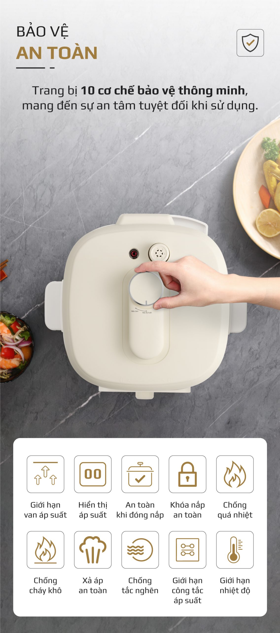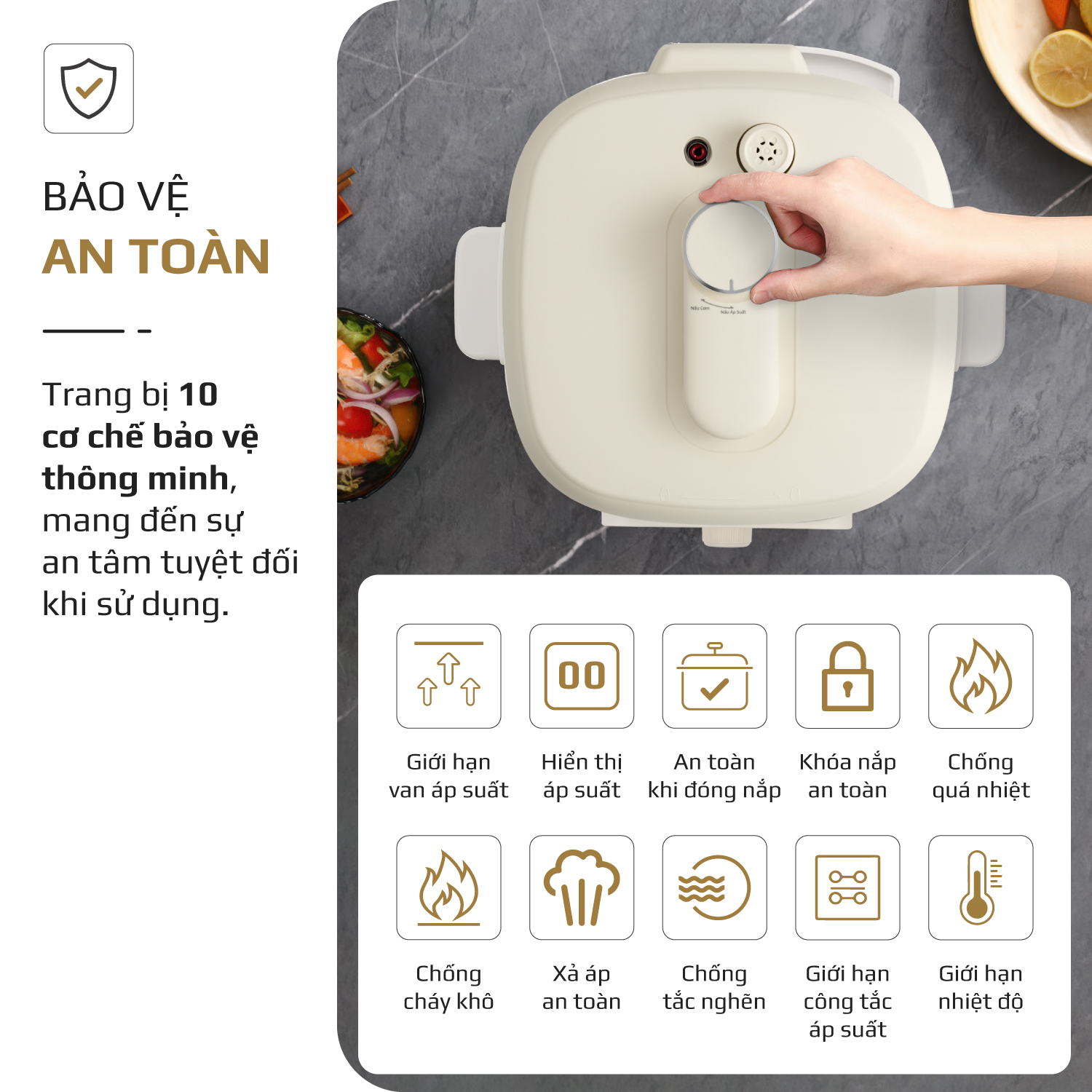 - An toàn tuyệt đối khi sử dụng: Nồi được tích hợp nhiều cơ chế bảo vệ thông minh, giúp kiểm soát áp suất và nhiệt độ ổn định, hạn chế tối đa rủi ro trong quá trình vận hành.