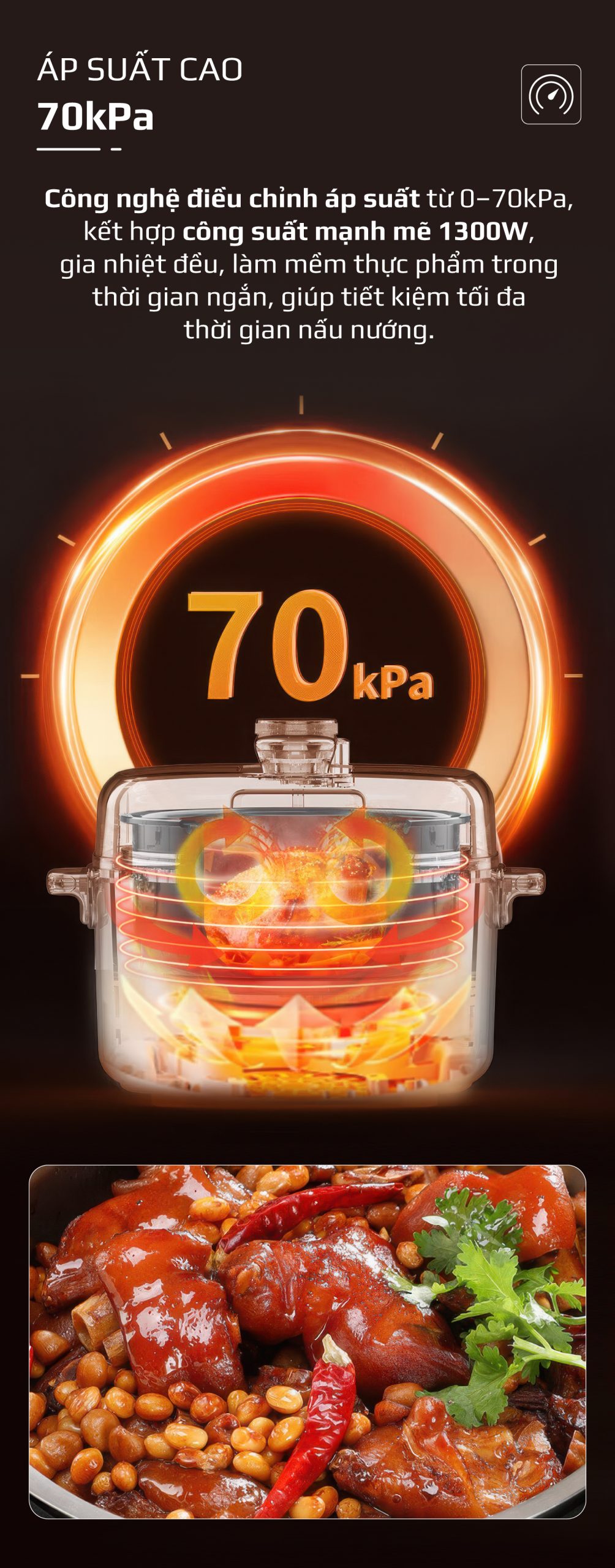 Nhờ đó, nồi có thể đáp ứng linh hoạt từ các món nấu đơn giản đến những món hầm, kho đòi hỏi nhiệt độ và áp suất cao trong thời gian dài.