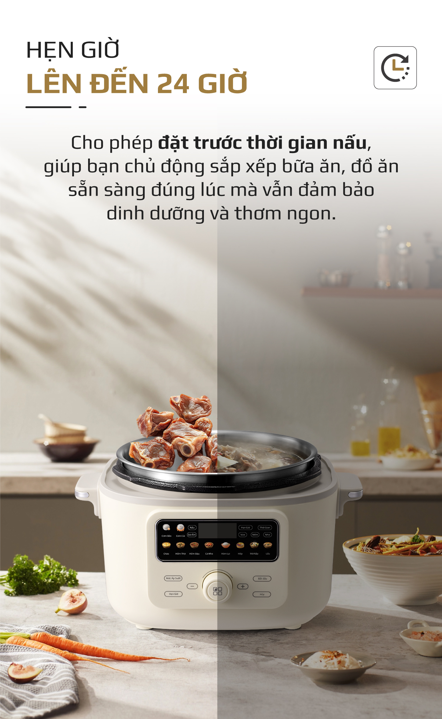 - Nấu ăn đơn giản – Nhàn tênh mỗi ngày: Với các chương trình nấu cài đặt sẵn, người dùng chỉ cần chuẩn bị nguyên liệu, cho vào nồi, chọn chế độ phù hợp. Nồi sẽ tự động điều chỉnh nhiệt độ, áp suất và thời gian nấu, sau đó chuyển sang chế độ giữ ấm khi hoàn tất.