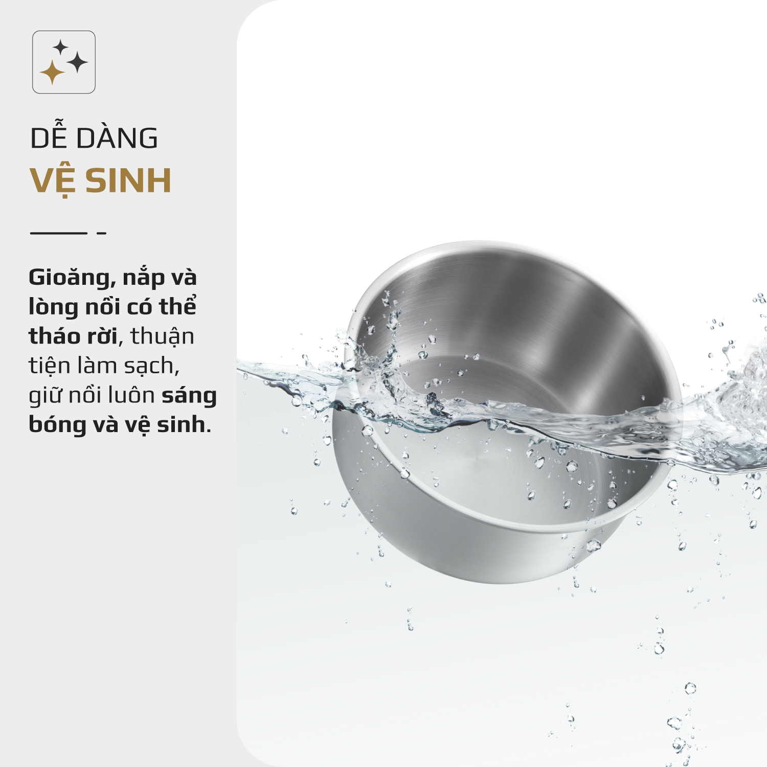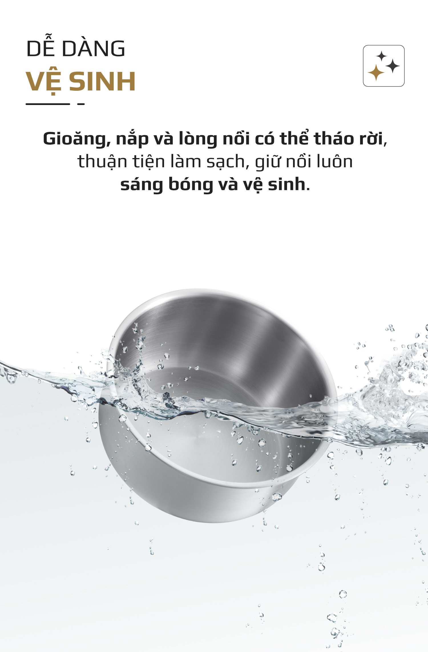 - Lòng nồi chất liệu INOX 304 sáng bóng, dễ dàng làm sạch với nước rửa chén và có thể sử dụng với máy rửa bát.